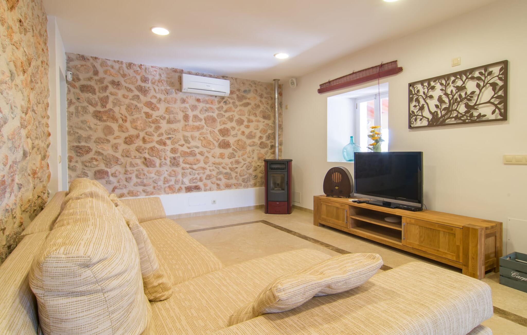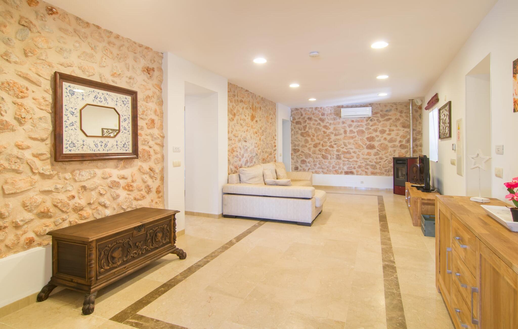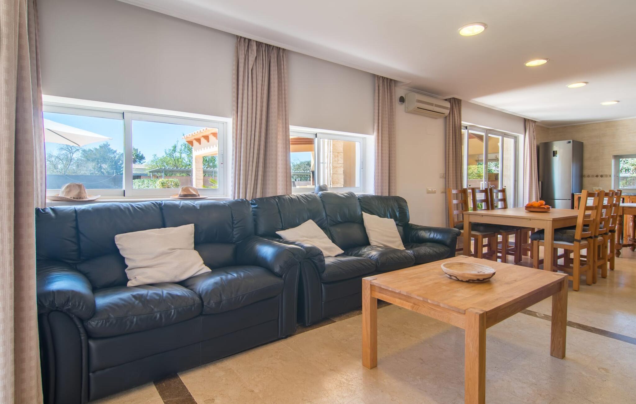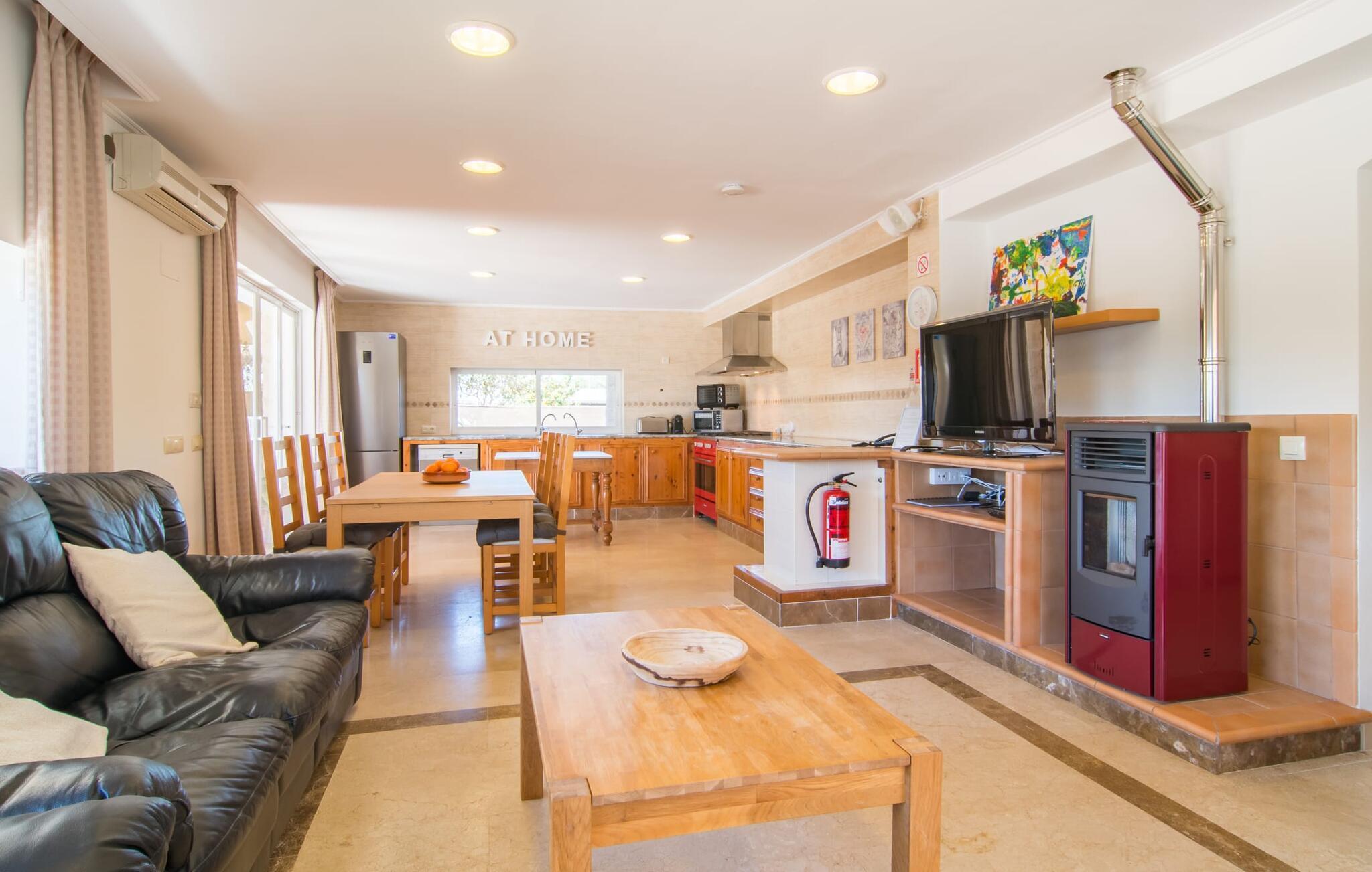 Eine entspannte Mischung aus modernen und rustikalen Möbeln sorgt überall im „Can Just“ für eine wirklich tolle, entspannte Wohlfühlatmosphäre – ankommen und sich wohlfühlen! In Ihrer Villa finden Sie alles bequem auf einer Ebene. Zum Beispiel die Küche mit hochwertigen Geräten sowie warmen, braunen Holzfassaden und einem Highlight in Form eines knallroten Ofens. Es öffnet sich in den Wohn- und Essbereich, wo ein großer Holztisch und passende Stühle sowie ein gemütliches Ledersofa mit Sesseln auf Sie warten. Biegen Sie um die Ecke und gehen Sie durch eine imposante Doppeltür, um ein weiteres bequemes Sofa für einen entspannten Fernsehabend zu entdecken. Wenn Sie müde sind, können Sie sich in eines der drei Doppelzimmer zurückziehen, alle mit Liebe zum Detail eingerichtet, mit ausreichend Platz für Ihre Urlaubsgarderobe und klimatisiert, damit Sie auch bei sommerlichen Temperaturen nicht ins Schwitzen kommen. Ein weiteres Schlafzimmer steht allen zur Verfügung, die nachts nur alleine so richtig entspannen können. Der Wohnkomfort der Villa wird durch zwei elegante und schicke Badezimmer ergänzt.
