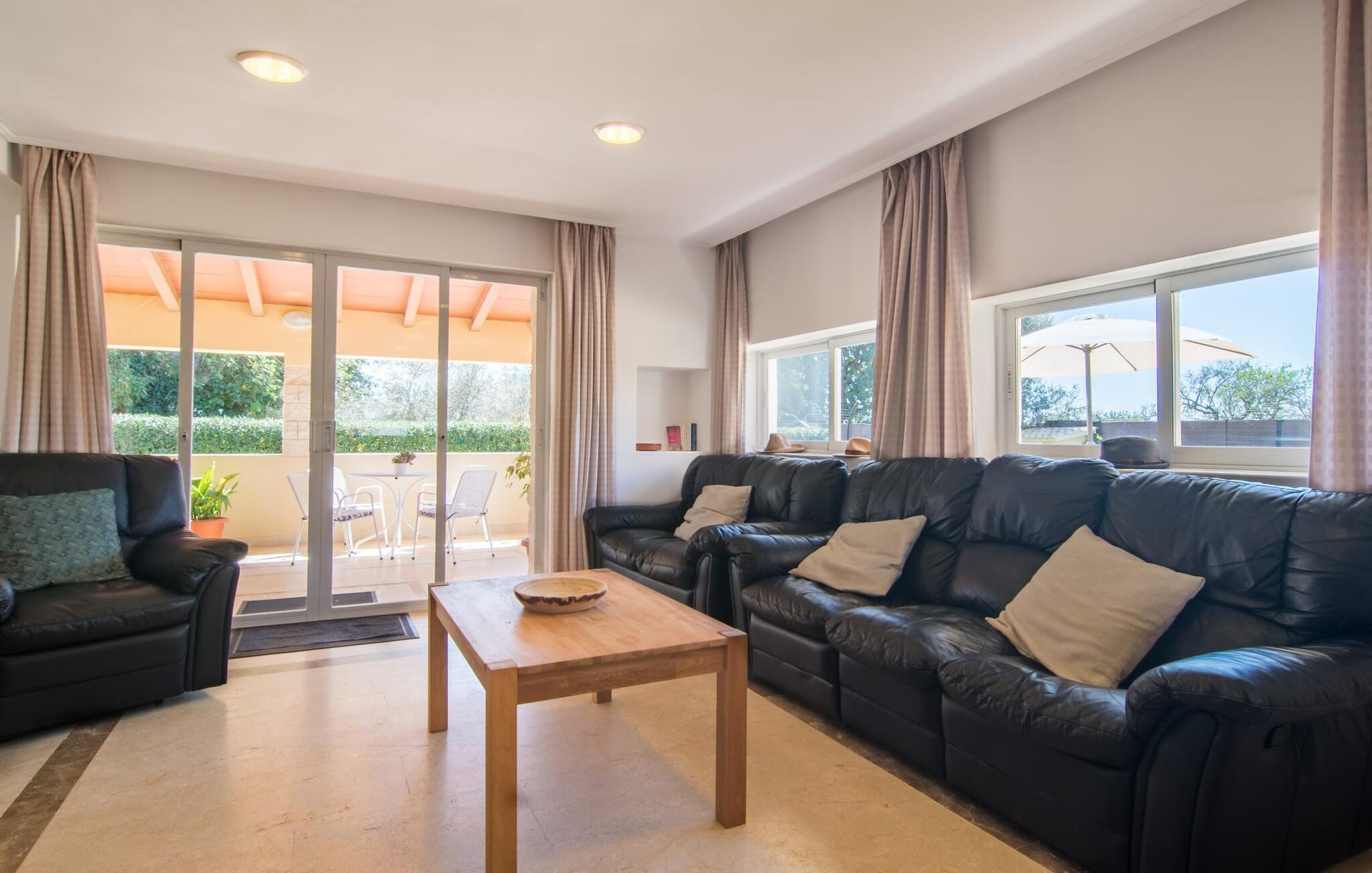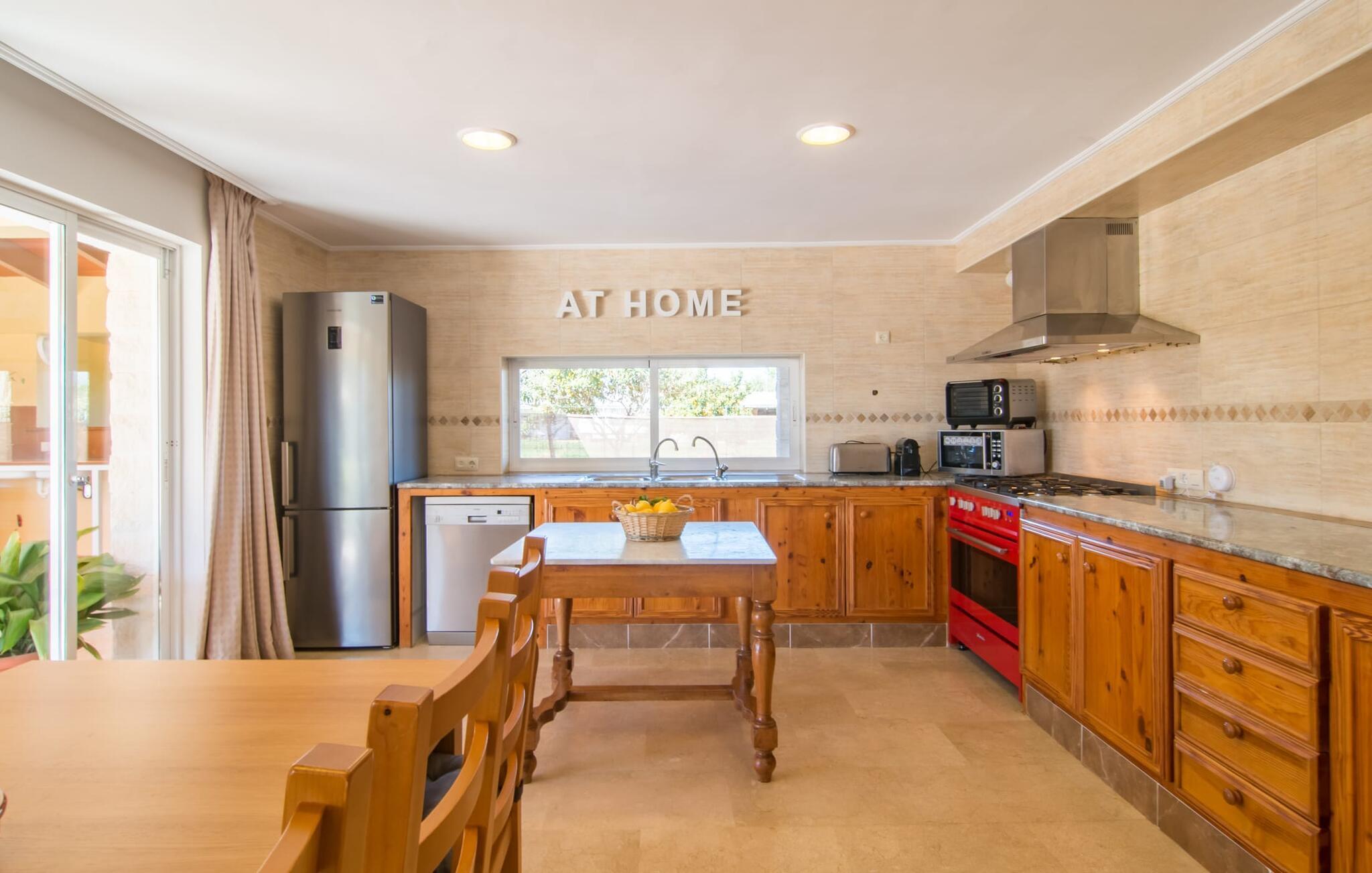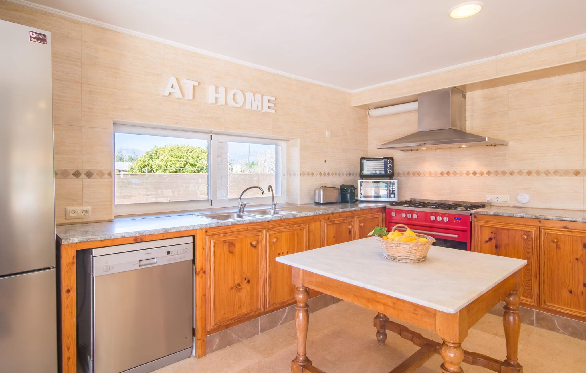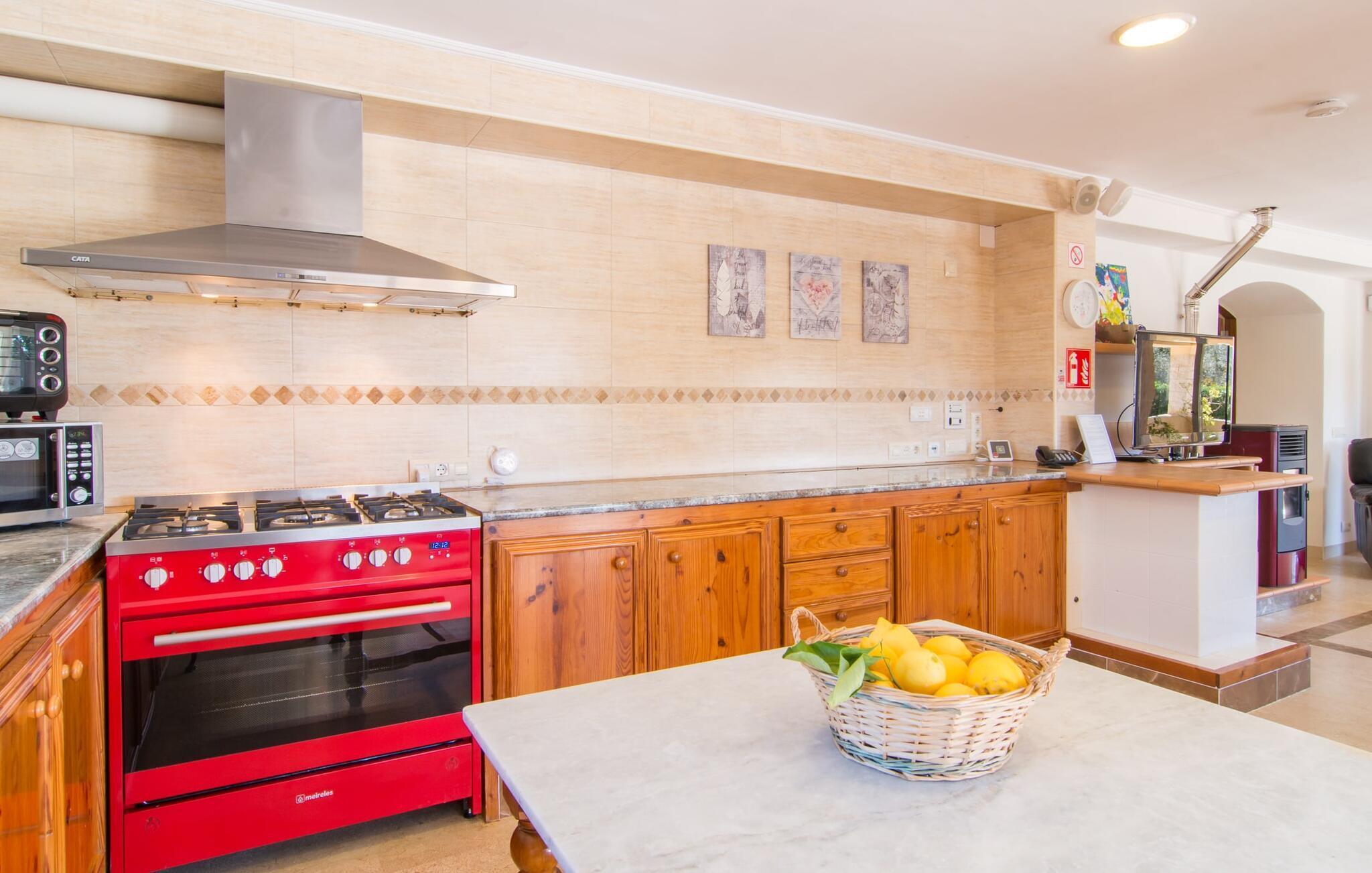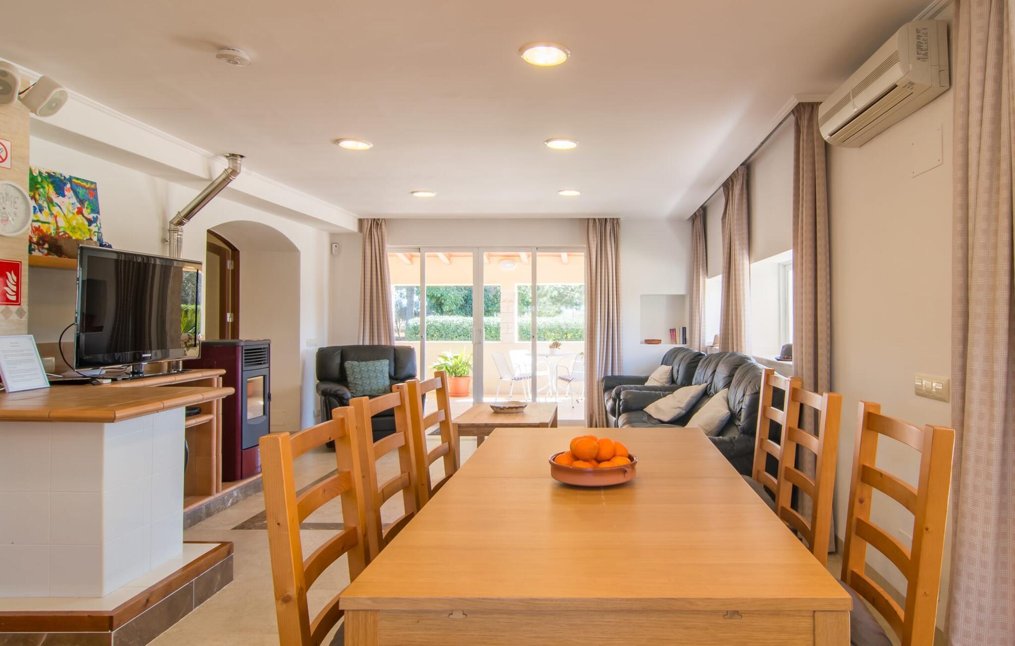 Eine entspannte Mischung aus modernen und rustikalen Möbeln sorgt überall im „Can Just“ für eine wirklich tolle, entspannte Wohlfühlatmosphäre – ankommen und sich wohlfühlen! In Ihrer Villa finden Sie alles bequem auf einer Ebene. Zum Beispiel die Küche mit hochwertigen Geräten sowie warmen, braunen Holzfassaden und einem Highlight in Form eines knallroten Ofens. Es öffnet sich in den Wohn- und Essbereich, wo ein großer Holztisch und passende Stühle sowie ein gemütliches Ledersofa mit Sesseln auf Sie warten. Biegen Sie um die Ecke und gehen Sie durch eine imposante Doppeltür, um ein weiteres bequemes Sofa für einen entspannten Fernsehabend zu entdecken. Wenn Sie müde sind, können Sie sich in eines der drei Doppelzimmer zurückziehen, alle mit Liebe zum Detail eingerichtet, mit ausreichend Platz für Ihre Urlaubsgarderobe und klimatisiert, damit Sie auch bei sommerlichen Temperaturen nicht ins Schwitzen kommen. Ein weiteres Schlafzimmer steht allen zur Verfügung, die nachts nur alleine so richtig entspannen können. Der Wohnkomfort der Villa wird durch zwei elegante und schicke Badezimmer ergänzt.