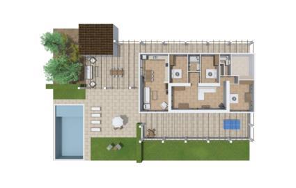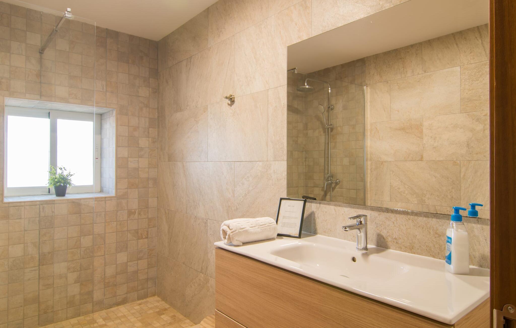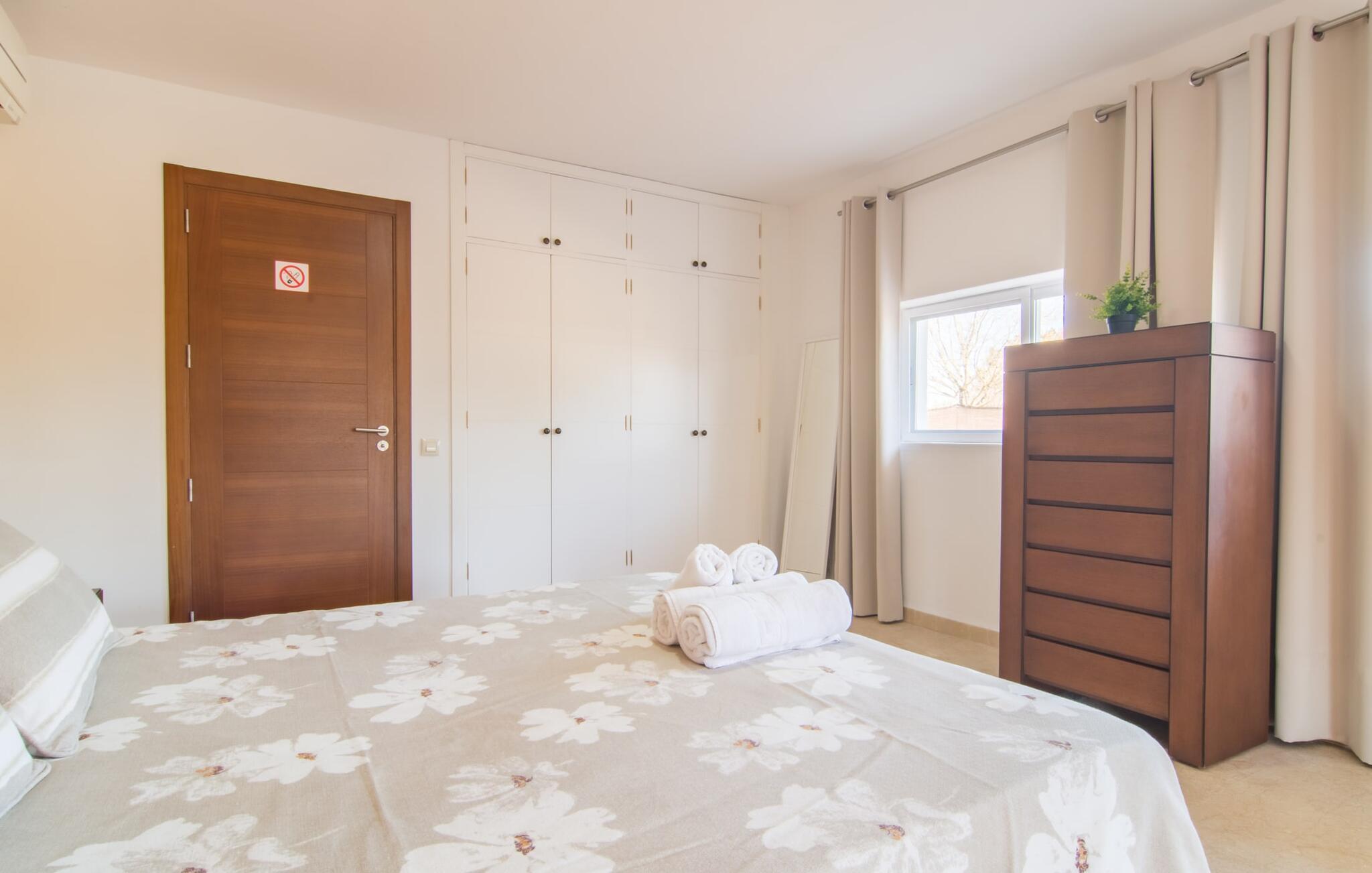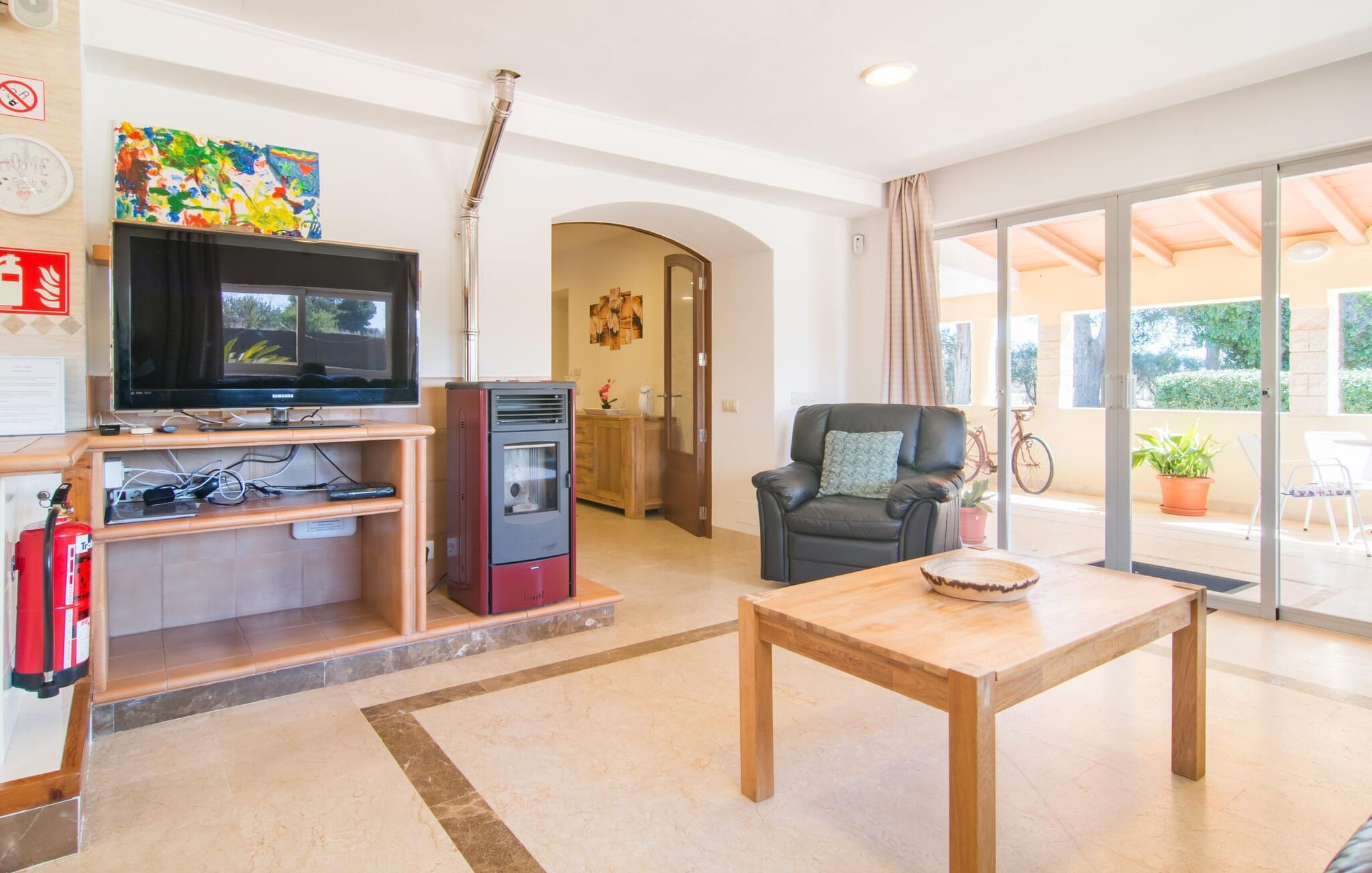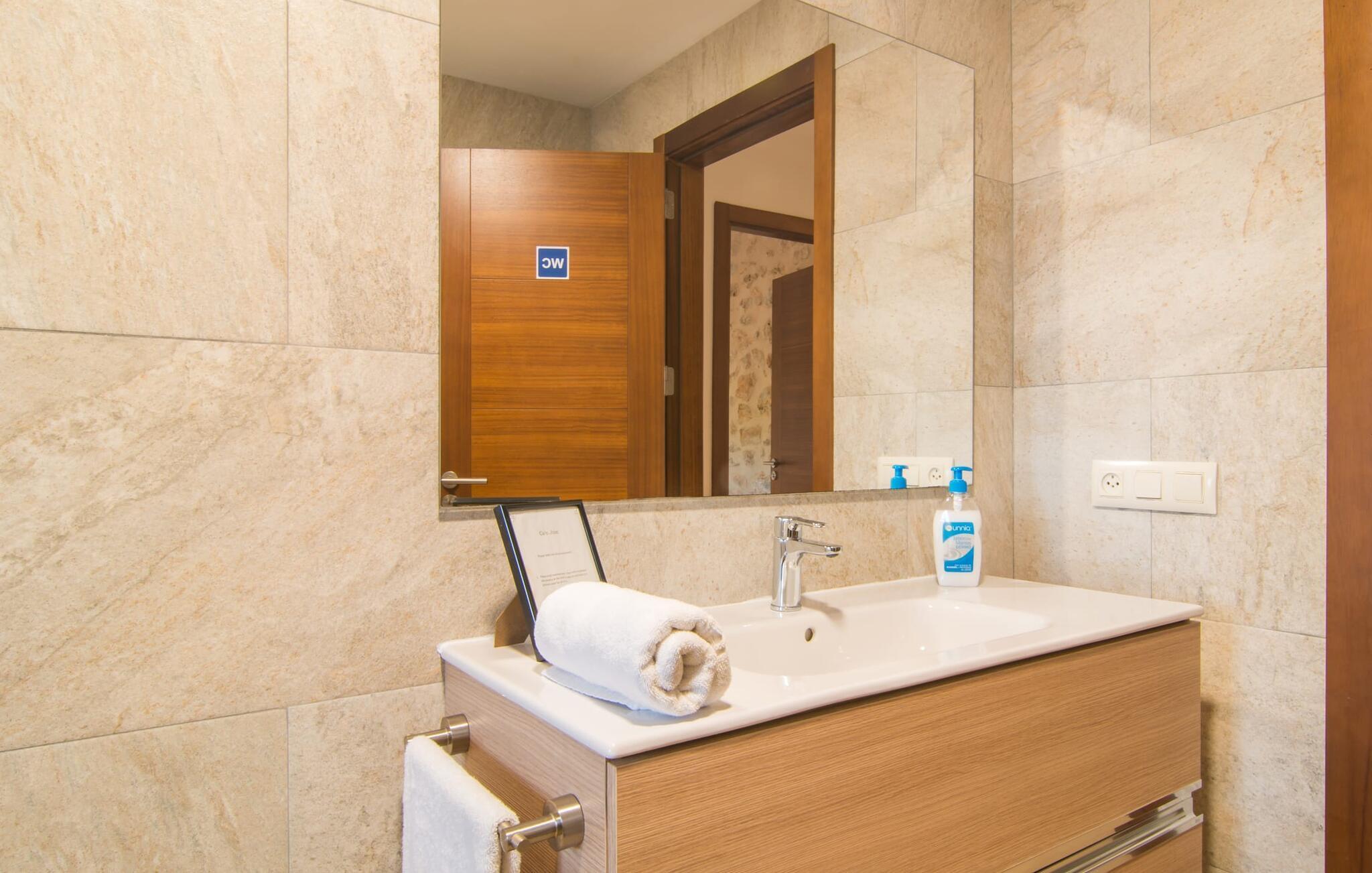 Eine entspannte Mischung aus modernen und rustikalen Möbeln sorgt überall im „Can Just“ für eine wirklich tolle, entspannte Wohlfühlatmosphäre – ankommen und sich wohlfühlen! In Ihrer Villa finden Sie alles bequem auf einer Ebene. Zum Beispiel die Küche mit hochwertigen Geräten sowie warmen, braunen Holzfassaden und einem Highlight in Form eines knallroten Ofens. Es öffnet sich in den Wohn- und Essbereich, wo ein großer Holztisch und passende Stühle sowie ein gemütliches Ledersofa mit Sesseln auf Sie warten. Biegen Sie um die Ecke und gehen Sie durch eine imposante Doppeltür, um ein weiteres bequemes Sofa für einen entspannten Fernsehabend zu entdecken. Wenn Sie müde sind, können Sie sich in eines der drei Doppelzimmer zurückziehen, alle mit Liebe zum Detail eingerichtet, mit ausreichend Platz für Ihre Urlaubsgarderobe und klimatisiert, damit Sie auch bei sommerlichen Temperaturen nicht ins Schwitzen kommen. Ein weiteres Schlafzimmer steht allen zur Verfügung, die nachts nur alleine so richtig entspannen können. Der Wohnkomfort der Villa wird durch zwei elegante und schicke Badezimmer ergänzt.