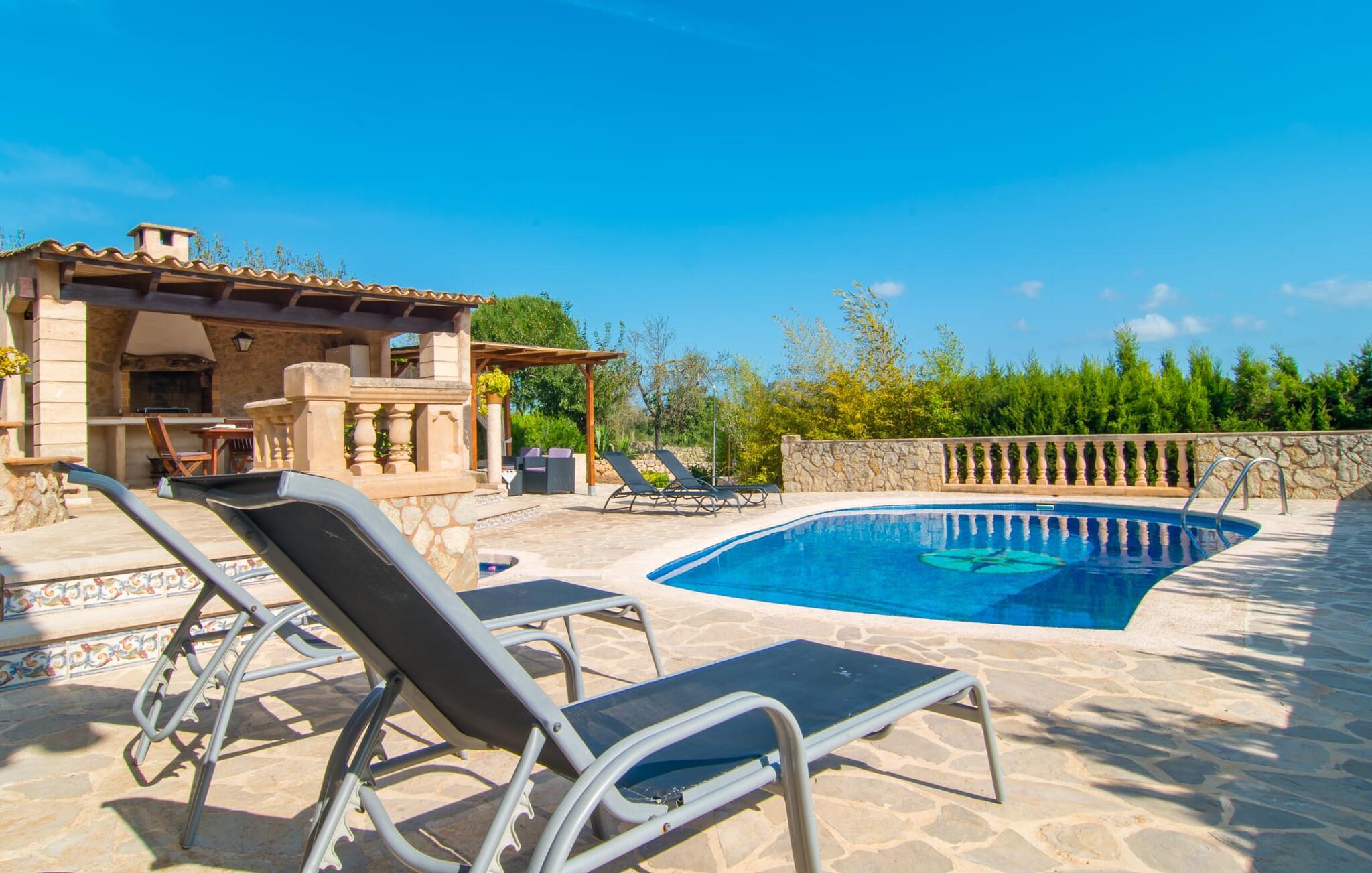 Die Villa „Can Picafort“ liegt eingebettet auf einem 14.000 m² großen Grundstück mit üppiger, sichtgeschützter Terrassenfläche. Hier genießen Sie absolute Privatsphäre umgeben von herrlich duftenden Oliven- und Zypressenhainen. Direkt neben dem Haus liegt der Poolbereich: Ein 7,5 x 4 m großes Schrägbecken bildet das Herzstück des Grundstücks, in dem bequeme Liegen für ausgedehnte Sonnenbäder bereitstehen. Eine Außendusche sorgt für die Abkühlung zwischendurch und spült nach einem Tag am Strand den restlichen Sand von Haut und Haaren. Wer ein gemütliches Plätzchen im Schatten bevorzugt, kann in den Sesseln oder auf dem großzügigen Sofa in der Outdoor-Lounge entspannen. Direkt daneben befindet sich eine überdachte Außenküche mit großem Esstisch und eingebautem Grill, der groß genug ist, um ein köstliches Abendessen mit frisch gegrilltem Fisch und anderen Köstlichkeiten zu zaubern. Der Ausblick auf die herrliche Landschaft und die spektakulären Sonnenuntergänge über den Ausläufern der Berge werden wahre Glücksgefühle hervorrufen. Wenn Sie wieder zu Hause sind, werden Sie feststellen, dass dies ein Sehnsuchtsort ist und Sie beginnen mit der Planung Ihres nächsten Urlaubs im „Can Jutger“.