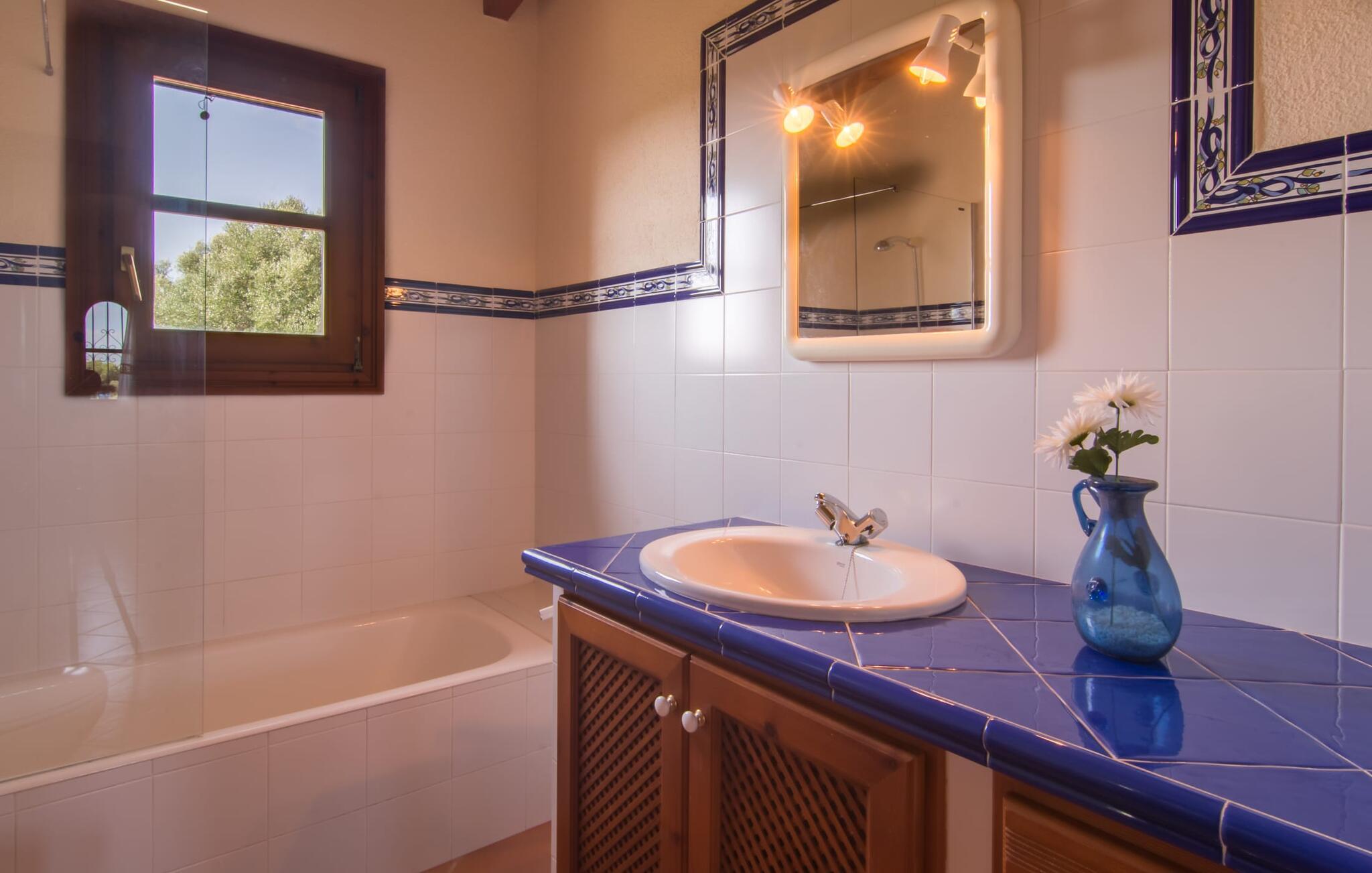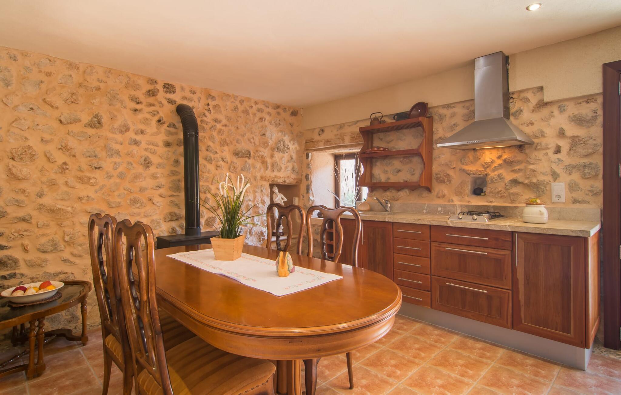 Auch im Inneren setzt sich das tolle Wohlgefühl fort. Die 160 m² Wohnfläche verteilen sich auf zwei separate Wohneinheiten. Der offene Wohn- und Essbereich ist im rustikalen mediterranen Stil eingerichtet. Der Kamin sorgt für eine besondere Atmosphäre und taucht den Raum an kühleren Abenden in sanftes Licht. Zwei bequeme Sofas laden zum Entspannen ein; Der große Esstisch oder der Barbereich bieten entspannte Plätze zum Genießen Ihres Frühstücks. Die voll ausgestattete Küche verfügt über einen Geschirrspüler; So erledigt sich das schmutzige Geschirr einfach von selbst. Die vier geschmackvoll gestalteten Schlafzimmer sind mit bequemen Doppelbetten oder zwei Einzelbetten ausgestattet; zwei Badezimmer stehen ebenfalls zur Verfügung. Im Untergeschoss dieser wunderschönen Natursteinvilla befindet sich ein großes Apartment mit eigenem Zugang, einer kleinen Küche und einem eigenen Badezimmer. Der unabhängige, kompakte Wohnraum bietet außerdem ein geräumiges Doppelbett, einen großen Esstisch, zwei gemütliche Sessel und einen Flachbildfernseher. Im tageslichtdurchfluteten Badezimmer mit Natursteinwänden und moderner Walk-in-Dusche wird die Morgenroutine zum wahren Vergnügen. Über WLAN können Sie im ganzen Haus im Internet surfen.