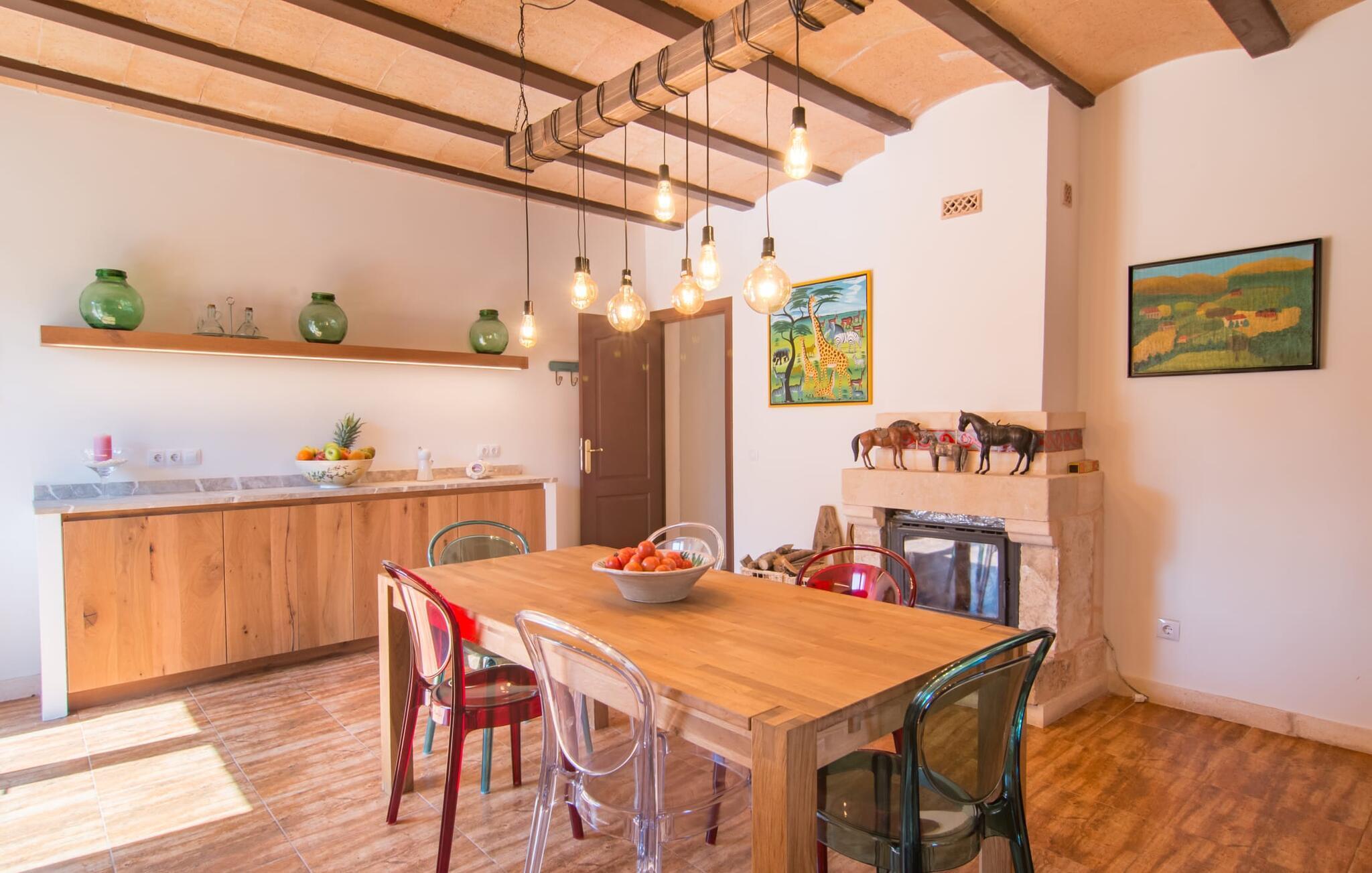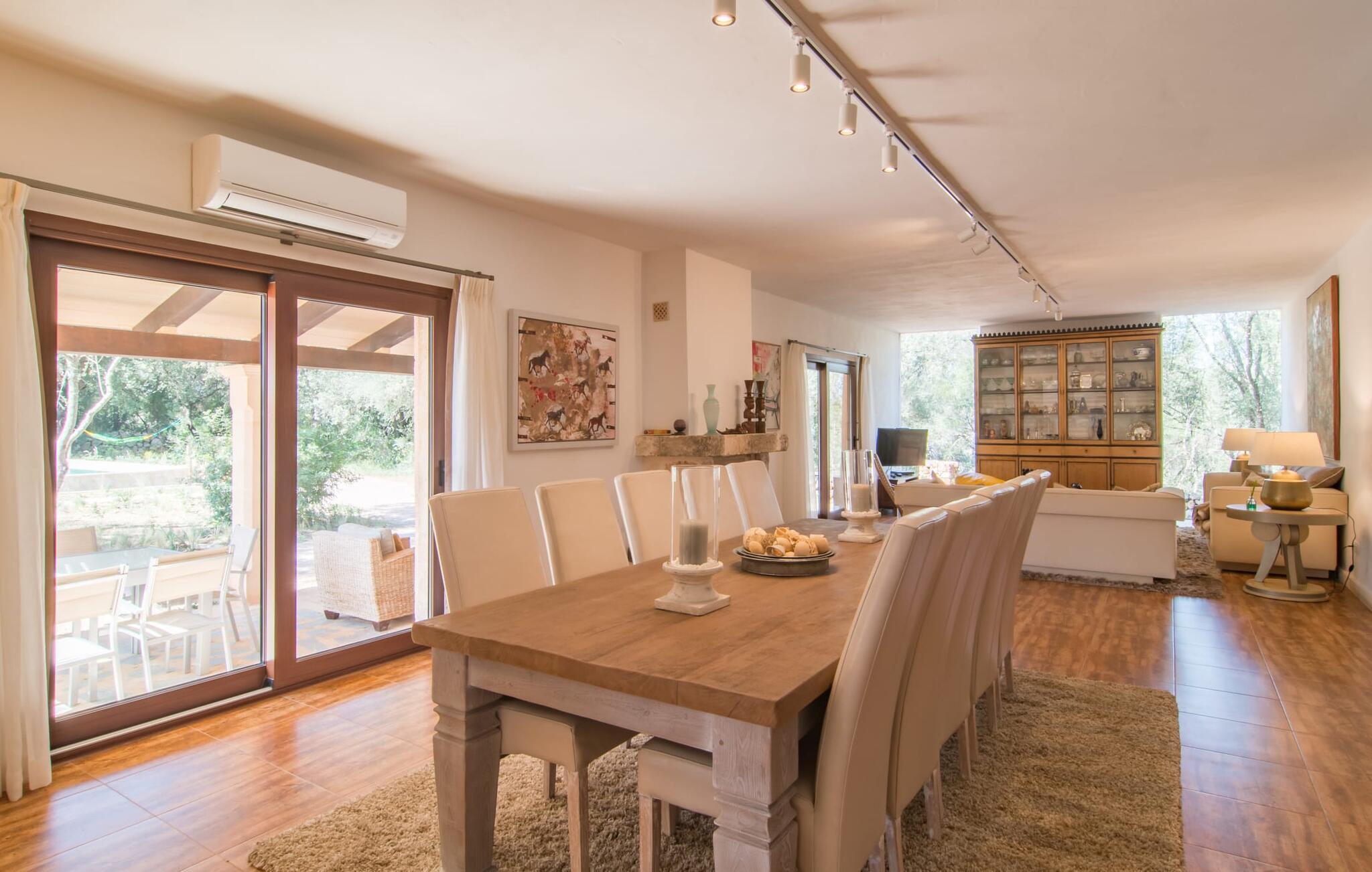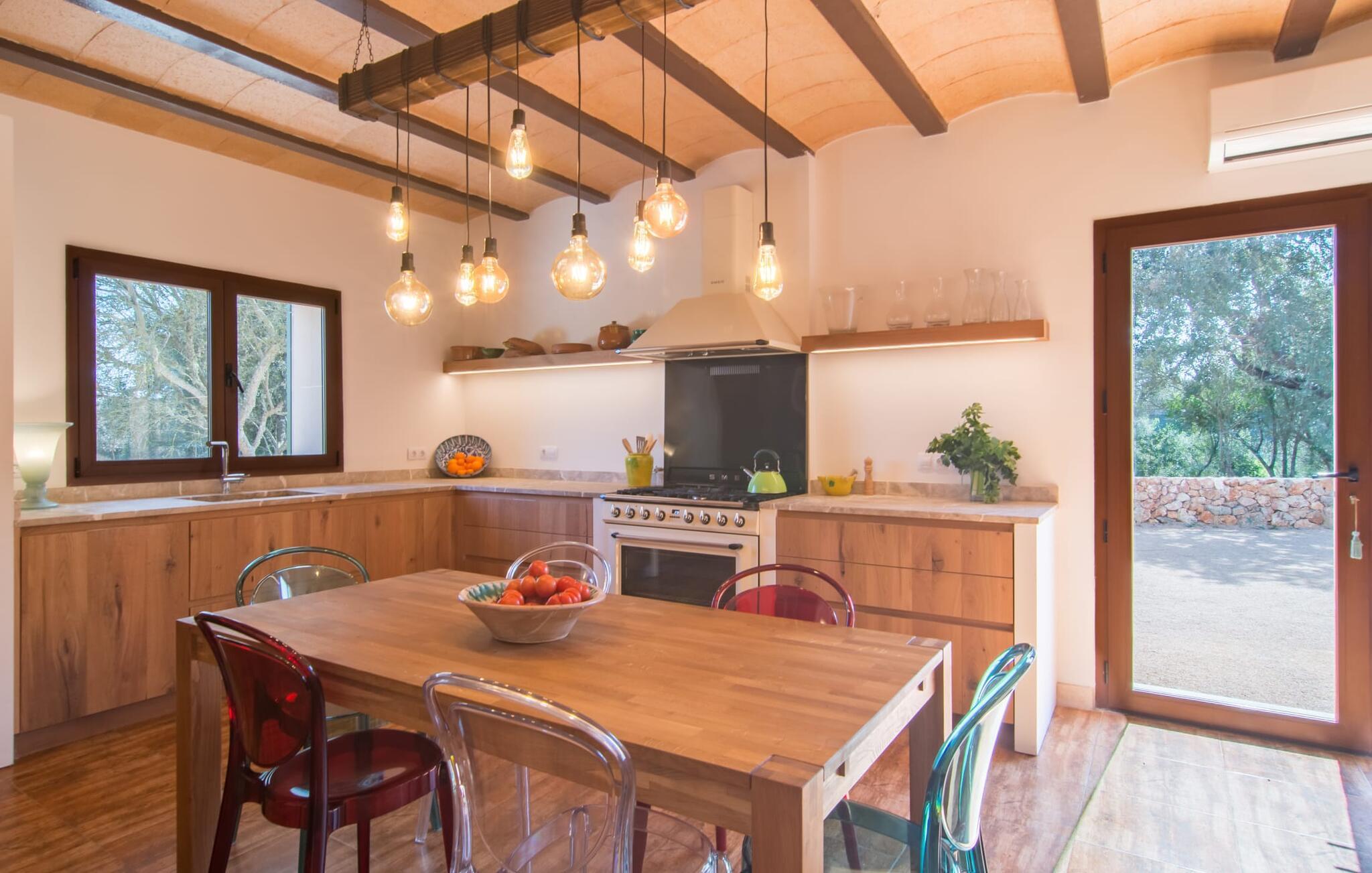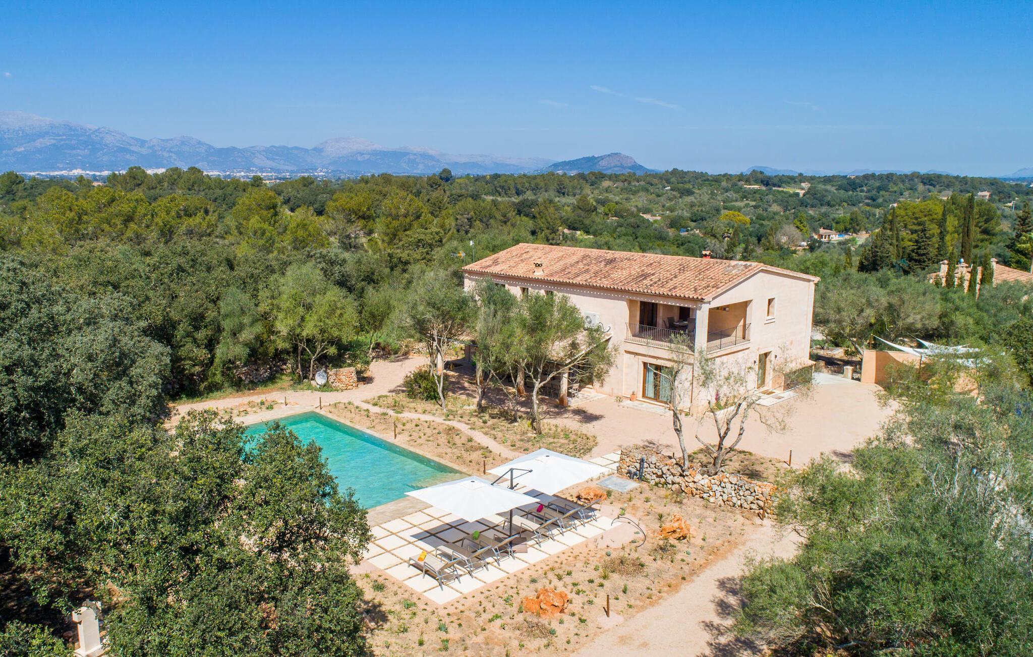 Entspannung ist die Hauptaktivität auf dem Programm, sodass das außergewöhnlich schicke Innen- und Außendesign immer Ihren Bedürfnissen entspricht. Herzstück ist der kombinierte Wohnbereich. Dieser lichtdurchflutete Wohnraum mit bodentiefen Fenstern gliedert sich in ein gemütliches Wohnzimmer mit Sofalandschaft und TV-Ecke, einen stilvollen Essbereich vor einem angenehmen Kamin und eine rustikale Bibliothek, ebenfalls mit Smart-TV. So viele Lieblingsorte zur Auswahl! Terrakotta, Holzböden, geschwungene Decken und „Stuten“ unterstreichen die natürliche Atmosphäre des Innenraums. Diese Qualität entdecken Sie auch in der voll ausgestatteten Küche mit hochwertigen Holzmöbeln. Gleichzeitig ähnelt es einem alten Bauernhaus mit dem zweiten Kamin: Dieser bildete in früheren Zeiten den gesellschaftlichen Mittelpunkt, da er oft der einzige beheizte Raum war. Nach langen, frei gestalteten Tagen stellt sich irgendwann die Müdigkeit ein – Sie können sich dann in eines der insgesamt vier klimatisierten Schlafzimmer zurückziehen, die sich überwiegend im Obergeschoss befinden (ein Schlafzimmer mit Bad befindet sich im Erdgeschoss). Im ersten Stock verfügt jedes der schicken Schlafzimmer mit fantastischem Ausblick auch über ein Badezimmer mit ebenerdiger Dusche oder Badewanne. Auf dem großzügigen Balkon mit Überdachung, von dem Sie den Garten und den Pool überblicken können, haben Sie einen idealen Rückzugsort zum Lesen eines guten Buches. Seien wir mal ehrlich – fällt Ihnen irgendetwas ein, bei dem Sie Kompromisse eingehen müssten? Wir sind von „Can Madis“ uneingeschränkt begeistert.