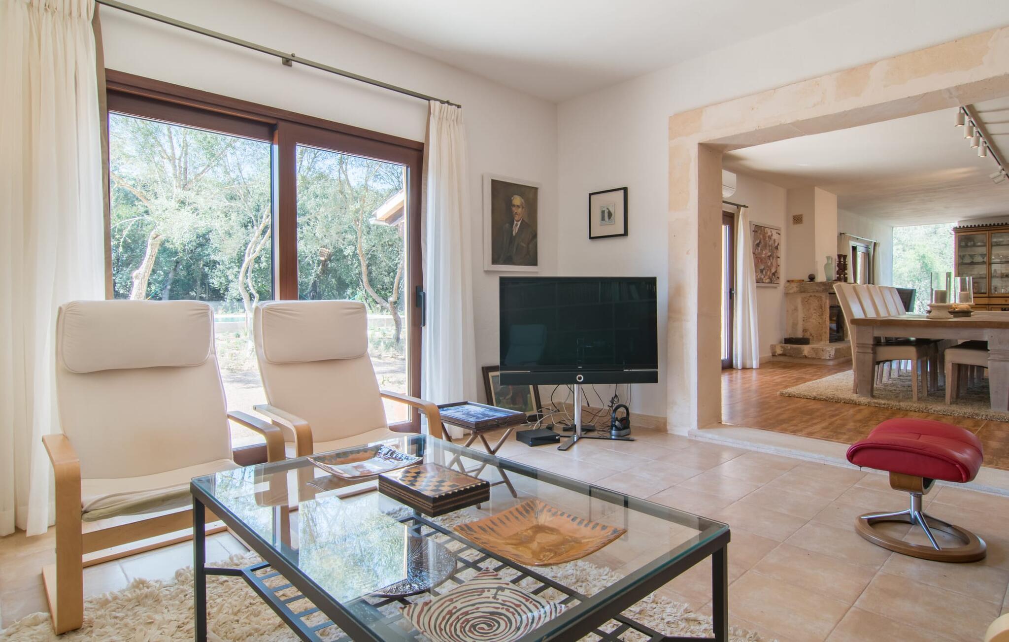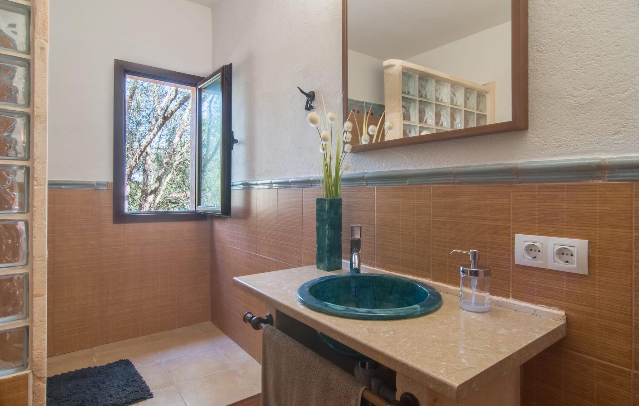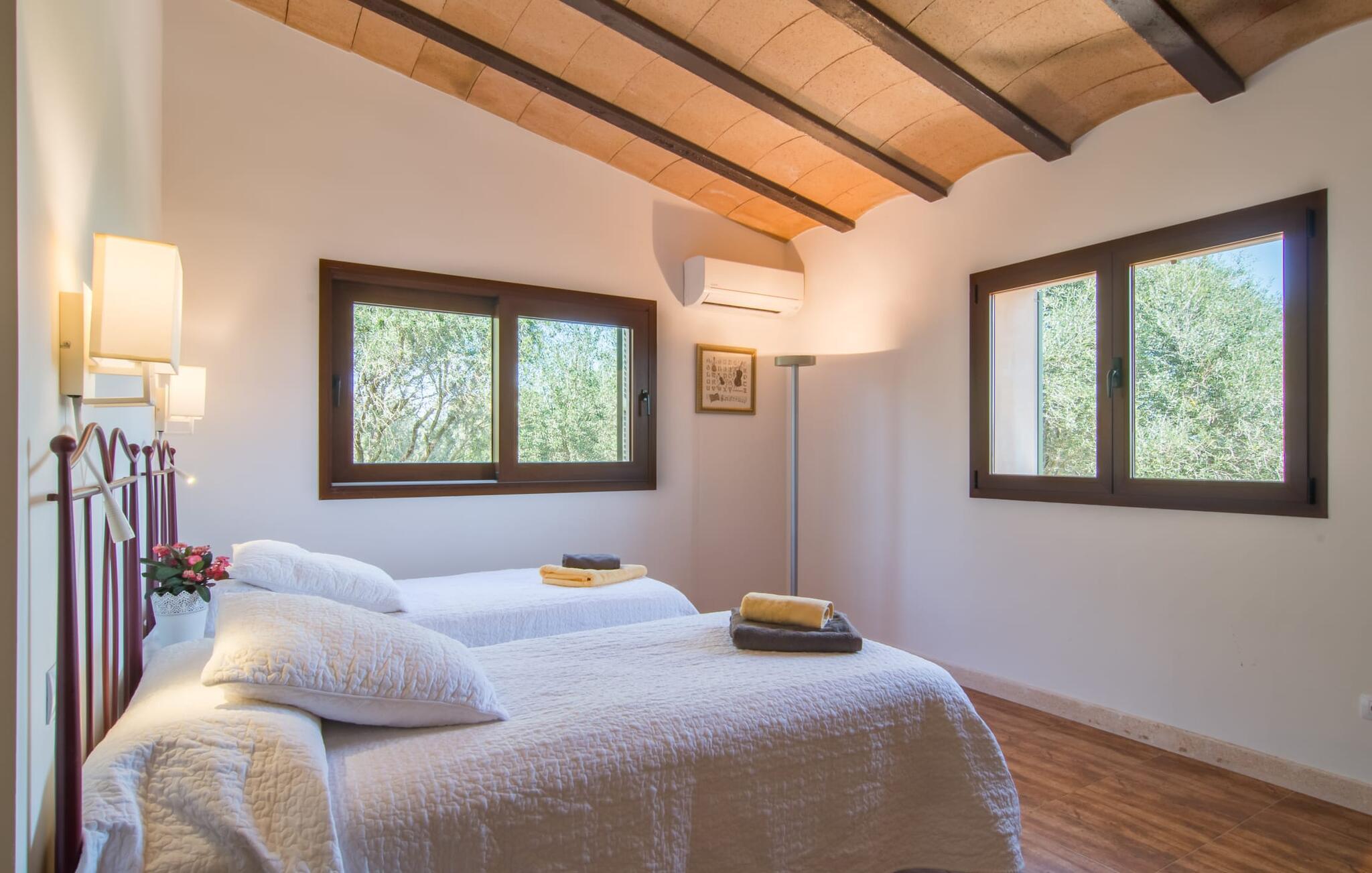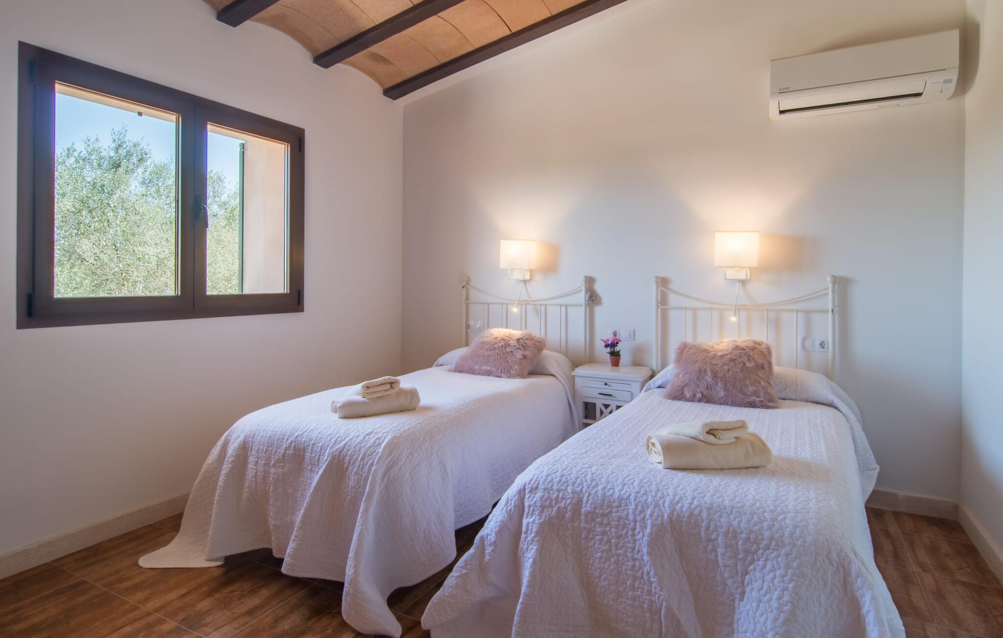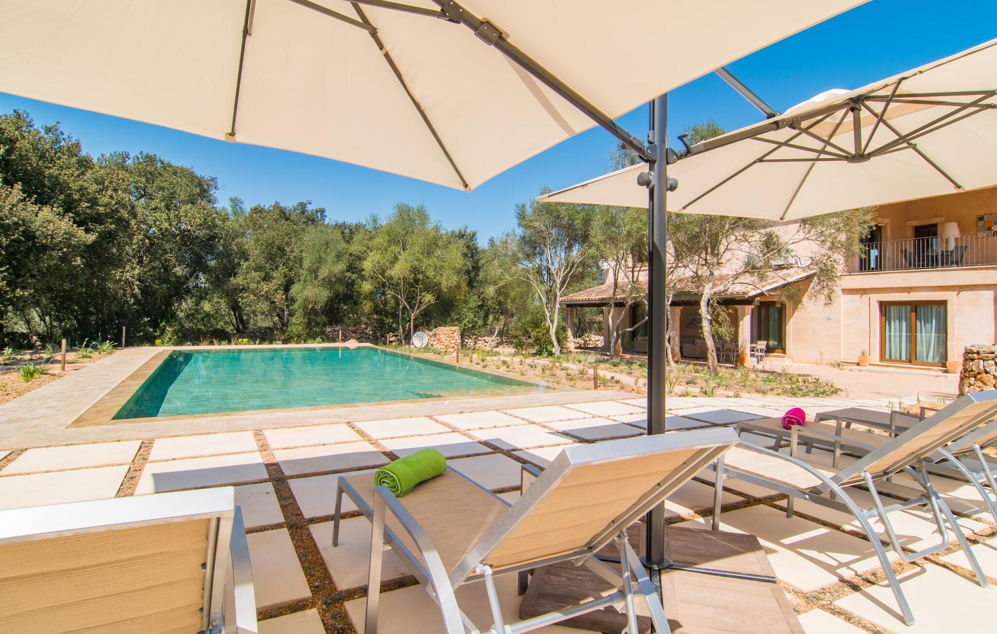 Entspannung ist die Hauptaktivität auf dem Programm, sodass das außergewöhnlich schicke Innen- und Außendesign immer Ihren Bedürfnissen entspricht. Herzstück ist der kombinierte Wohnbereich. Dieser lichtdurchflutete Wohnraum mit bodentiefen Fenstern gliedert sich in ein gemütliches Wohnzimmer mit Sofalandschaft und TV-Ecke, einen stilvollen Essbereich vor einem angenehmen Kamin und eine rustikale Bibliothek, ebenfalls mit Smart-TV. So viele Lieblingsorte zur Auswahl! Terrakotta, Holzböden, geschwungene Decken und „Stuten“ unterstreichen die natürliche Atmosphäre des Innenraums. Diese Qualität entdecken Sie auch in der voll ausgestatteten Küche mit hochwertigen Holzmöbeln. Gleichzeitig ähnelt es einem alten Bauernhaus mit dem zweiten Kamin: Dieser bildete in früheren Zeiten den gesellschaftlichen Mittelpunkt, da er oft der einzige beheizte Raum war. Nach langen, frei gestalteten Tagen stellt sich irgendwann die Müdigkeit ein – Sie können sich dann in eines der insgesamt vier klimatisierten Schlafzimmer zurückziehen, die sich überwiegend im Obergeschoss befinden (ein Schlafzimmer mit Bad befindet sich im Erdgeschoss). Im ersten Stock verfügt jedes der schicken Schlafzimmer mit fantastischem Ausblick auch über ein Badezimmer mit ebenerdiger Dusche oder Badewanne. Auf dem großzügigen Balkon mit Überdachung, von dem Sie den Garten und den Pool überblicken können, haben Sie einen idealen Rückzugsort zum Lesen eines guten Buches. Seien wir mal ehrlich – fällt Ihnen irgendetwas ein, bei dem Sie Kompromisse eingehen müssten? Wir sind von „Can Madis“ uneingeschränkt begeistert.