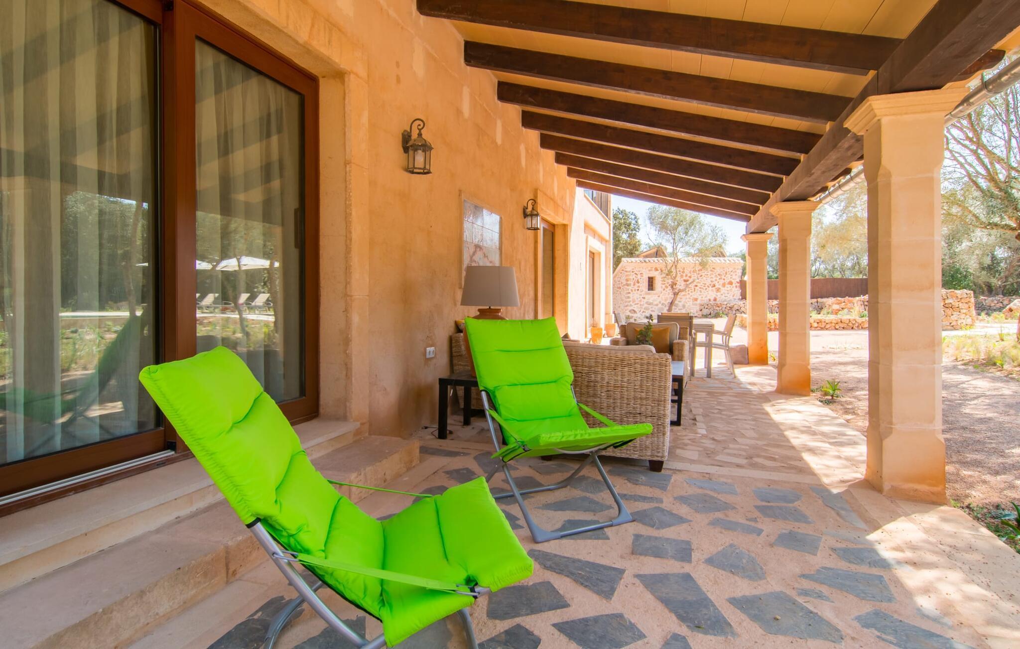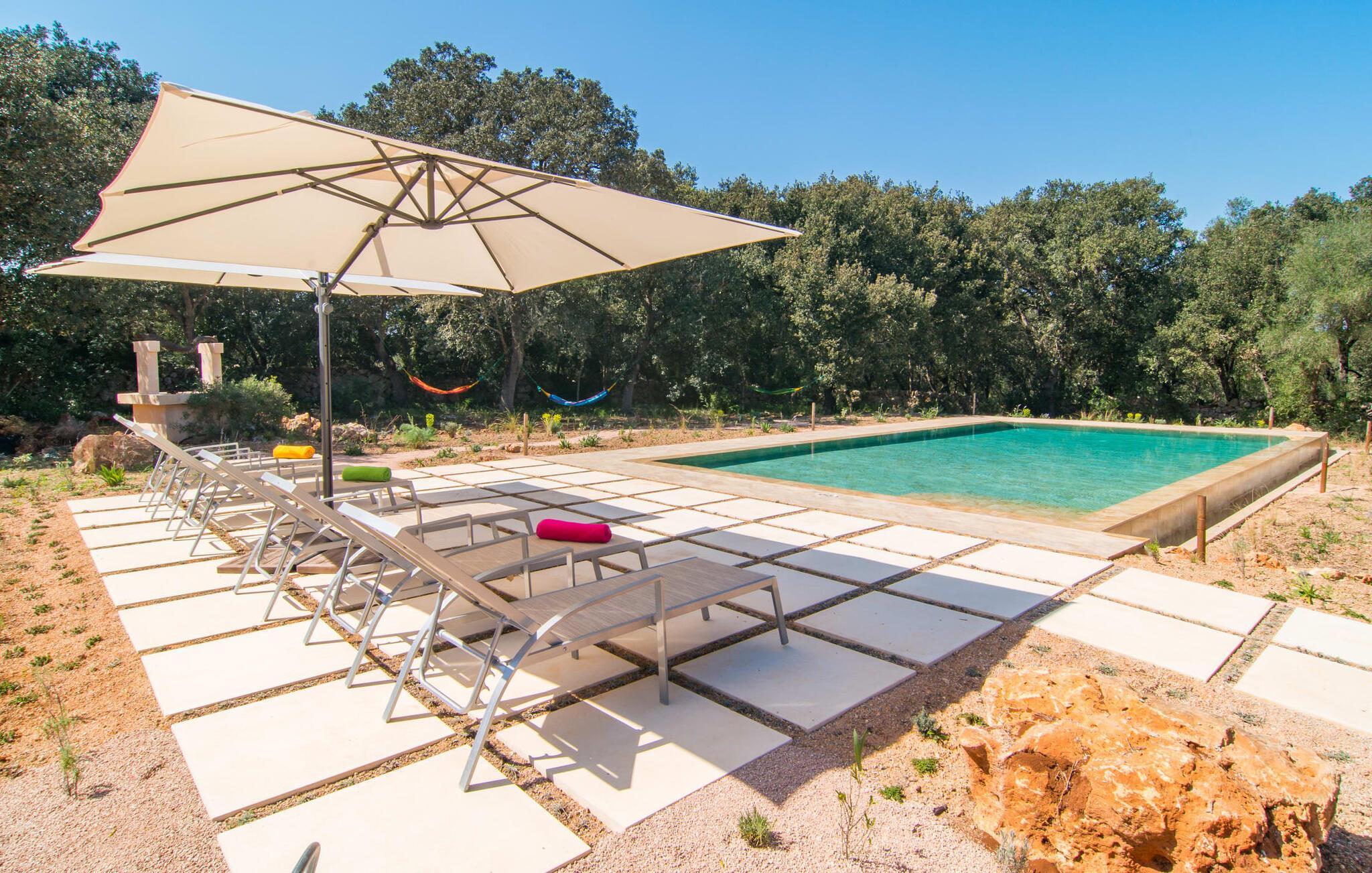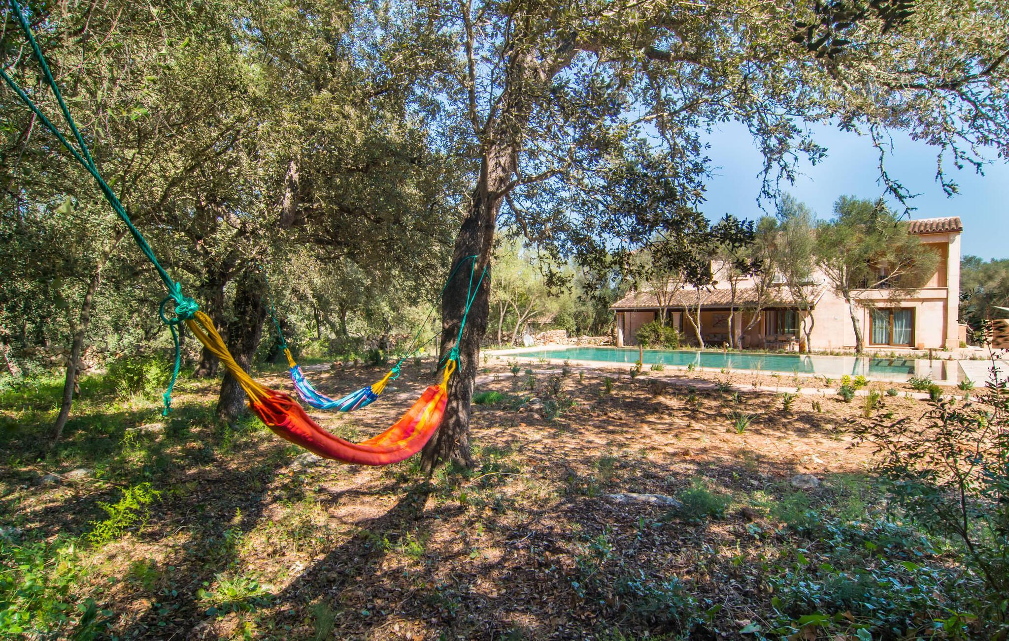 Die Farben von „Can Madis“ fallen sofort ins Auge – sie drücken Lebendigkeit, Freiheit, Nähe zur Natur und gleichzeitig ein Gefühl von edler Schönheit und Luxus aus. Etwas, das wir uns selten gönnen, vielleicht viel zu selten. Deshalb sollten Sie Ihre Familie und Freunde mit einem Besuch in „Can Madis“, einem wunderschönen Anwesen im Herzen unserer Insel, verwöhnen. Feigen- und Olivenbäume, Zypressen und Ausblicke auf das Tramuntana-Gebirge prägen das mediterrane Anwesen. Das neu errichtete Gebäude aus Sandstein, das in der Sonne golden schimmert, spiegelt Tradition und Moderne wider. Abgerundet wird es durch den riesigen Pool mit komfortablem Einstieg. Nach langen Ausflugstagen oder Wanderungen können Sie im Whirlpool entspannen. Anschließend können Sie eine Siesta auf einer der bequemen Liegen unter dem Doppelsonnenschirm einlegen oder einfach in einer der Hängematten im Garten entspannen. Der eingebaute Eckgrill dient nach einem leckeren Festmahl auch als Feuerstelle – unter den Sonnensegeln können Sie auf den einladenden Korbmöbeln an einem langen Holztisch sitzen. Weitere gemütliche Möbel finden Sie auch auf dem überdachten Teil der Terrasse mit Essecke, entspannter Lounge und farbenfrohen Liegestühlen.