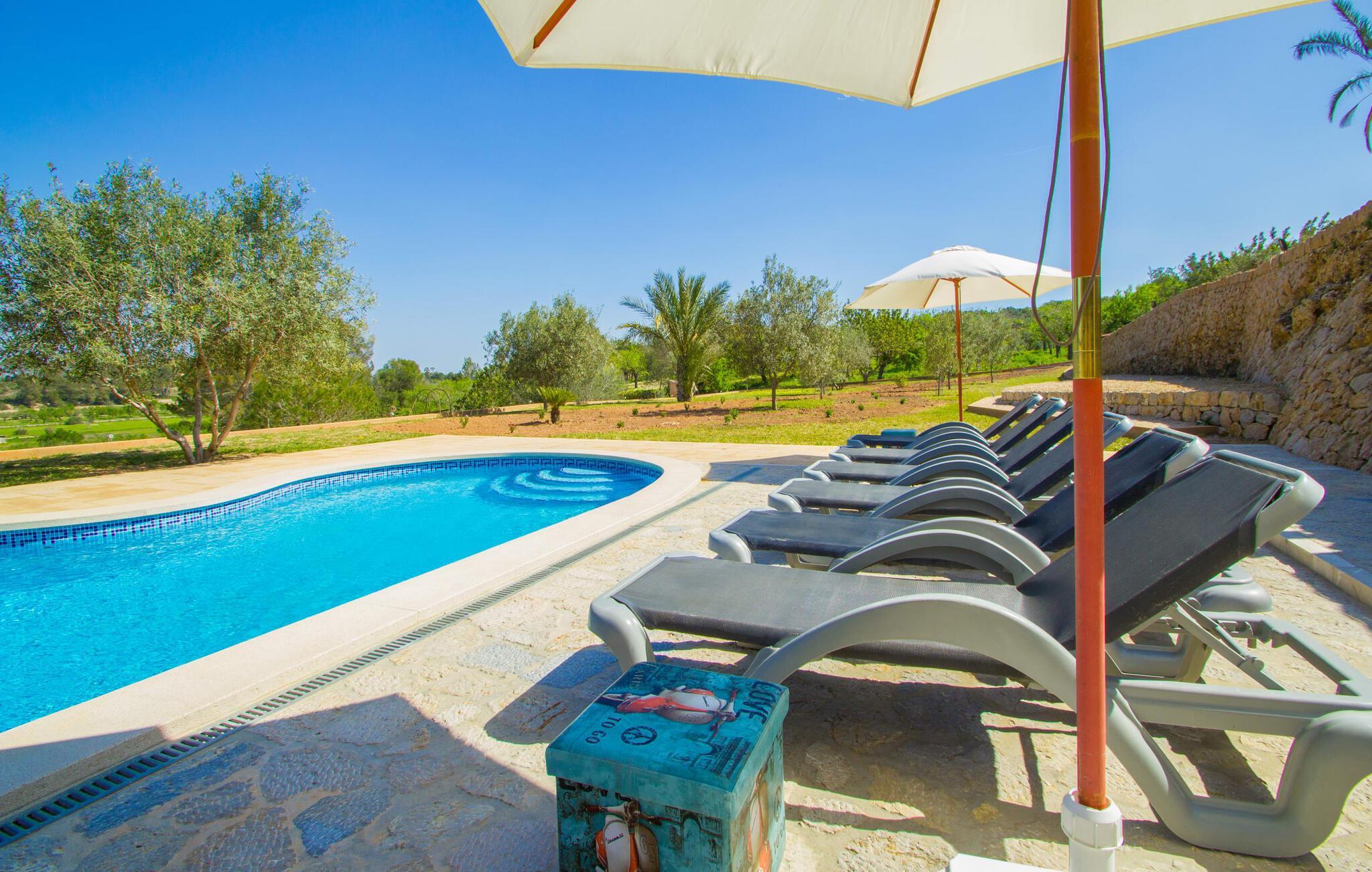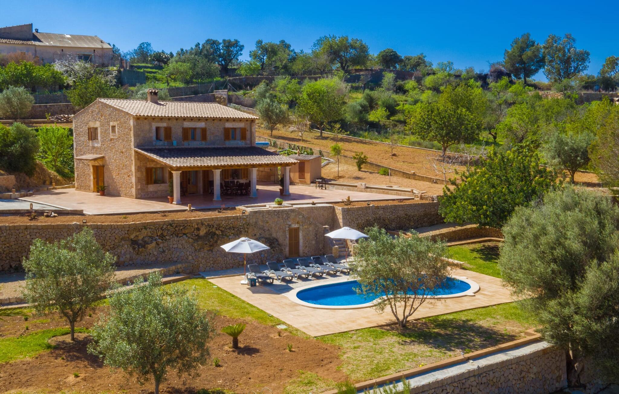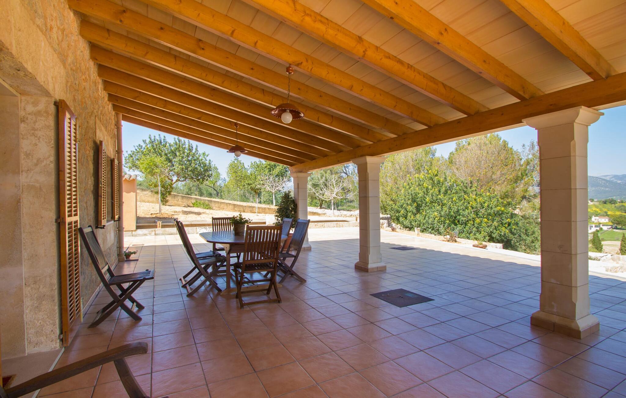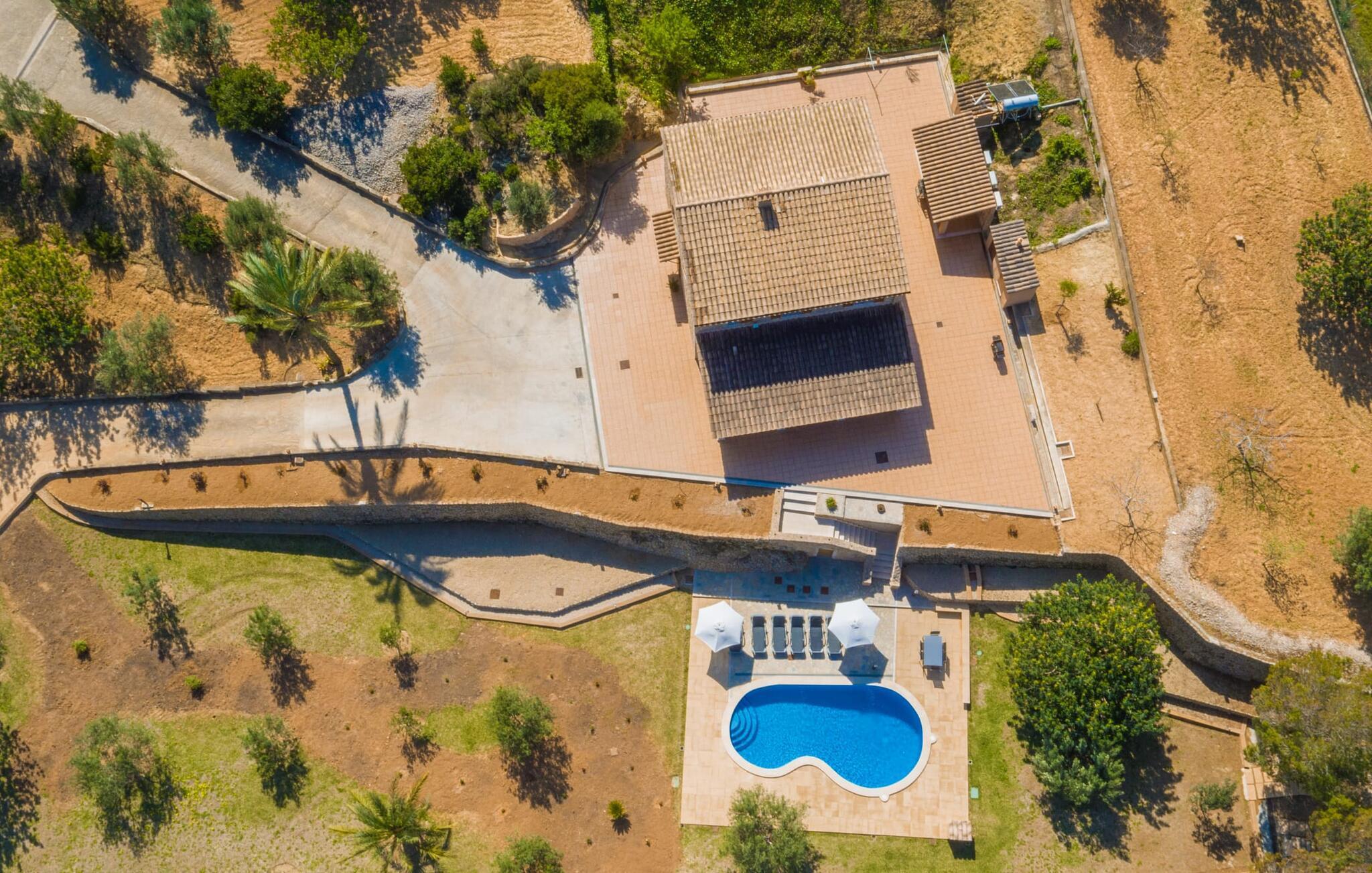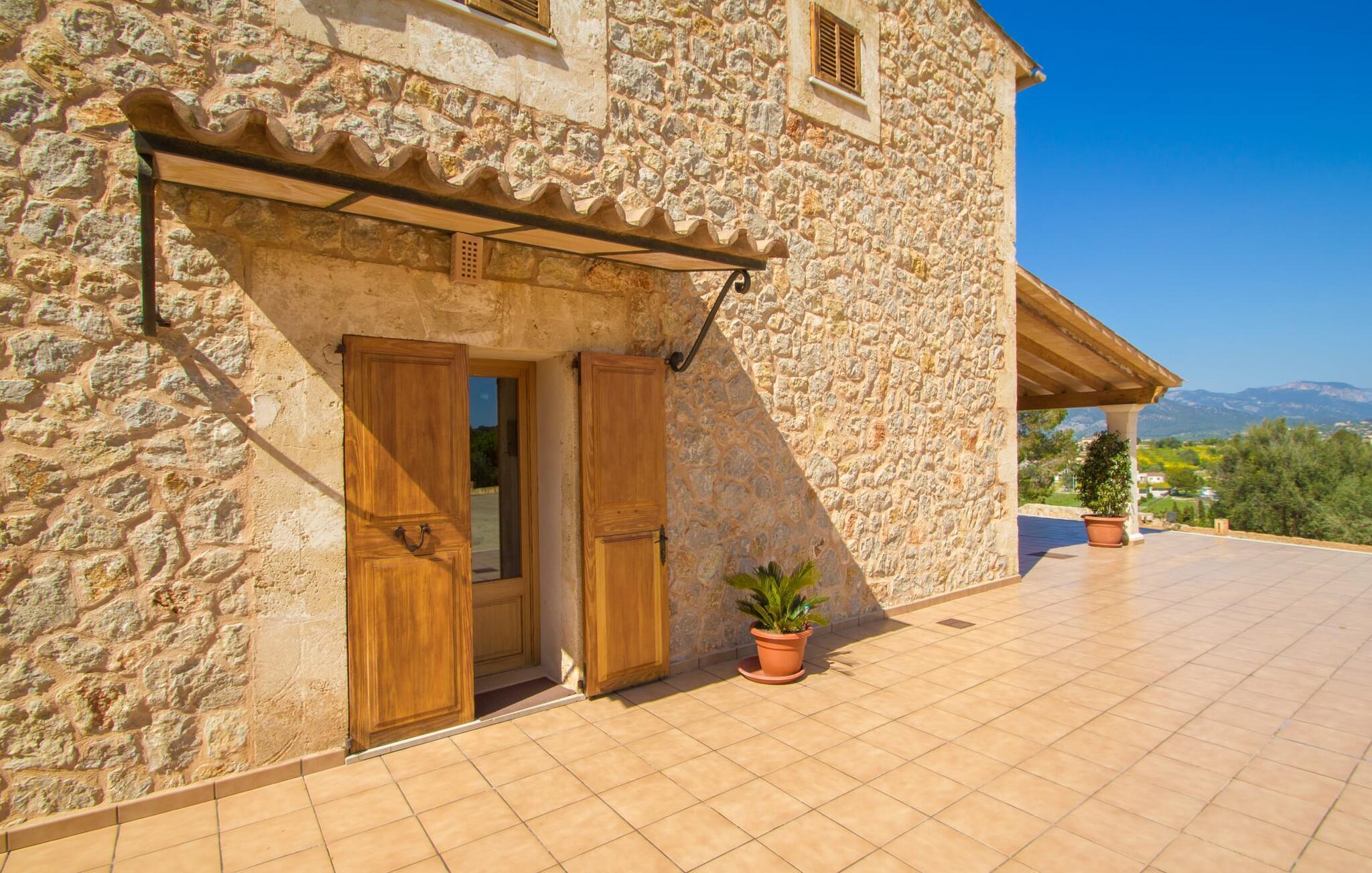 Reiseveranstalter werben oft mit dem Bild eines glitzernden blauen Pools, umgeben von Liegestühlen. Normalerweise muss man diesen idyllischen Urlaubsort mit anderen erholungssuchenden Reisenden teilen, was im schlimmsten Fall mit viel Lärm verbunden sein kann. In der Villa „Can Mirlo“ werden Ihre Tage anders sein. Sie werden von erstklassigem Stil umgeben sein und wenn Sie möchten, können Sie den weiten Blick über das Landesinnere Mallorcas bis hin zu den Bergen im Norden genießen. Die Poolterrasse liegt direkt unterhalb des Hauses. Über ein paar Steinstufen gelangen Sie zum Wasser und in den direkt angrenzenden Garten. Eine große Vielfalt an Baumarten weist hier den Weg: Einfach die Sonne scheinen lassen und ansonsten das pure Dasein genießen. Direkt an das Haus grenzt eine überdachte Veranda, auf der Sie abends den Tag bei einer Flasche Wein ausklingen lassen können. Dank eines Außenbades können Sie von morgens bis abends die milde Inselluft in vollen Zügen genießen.