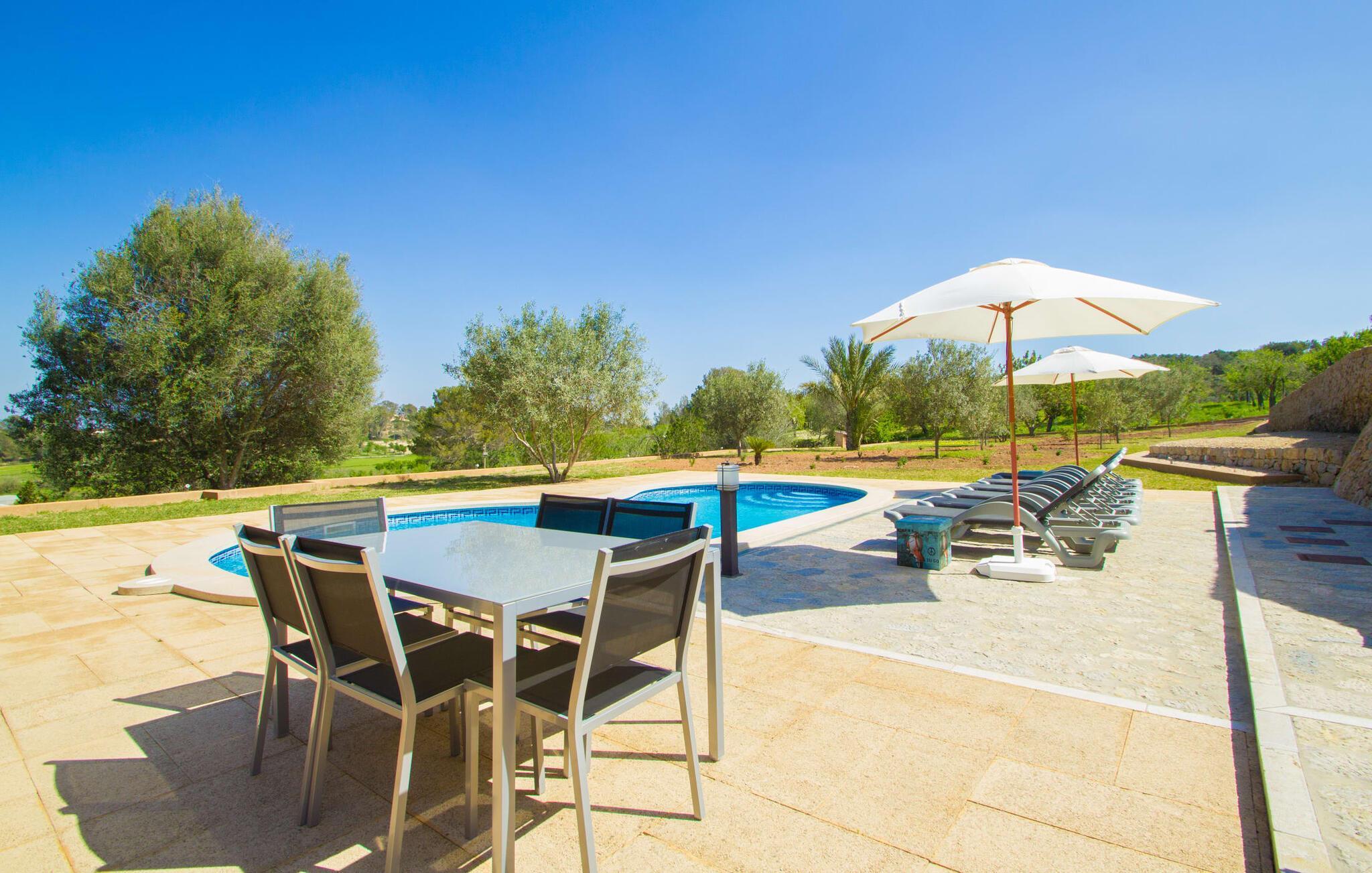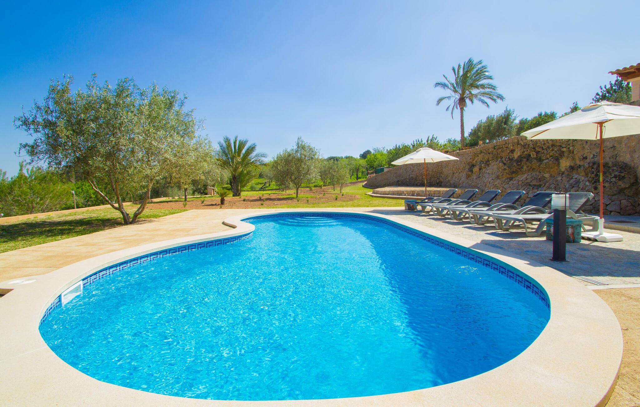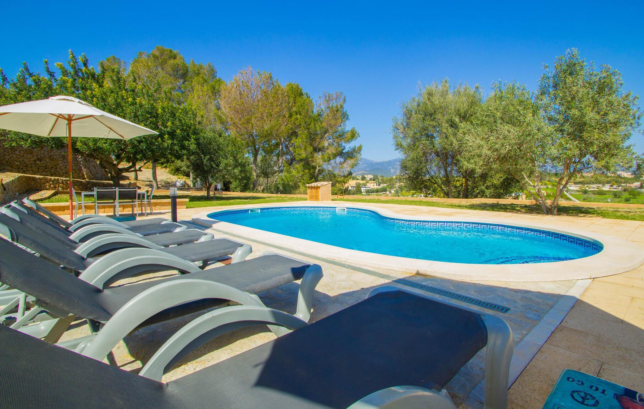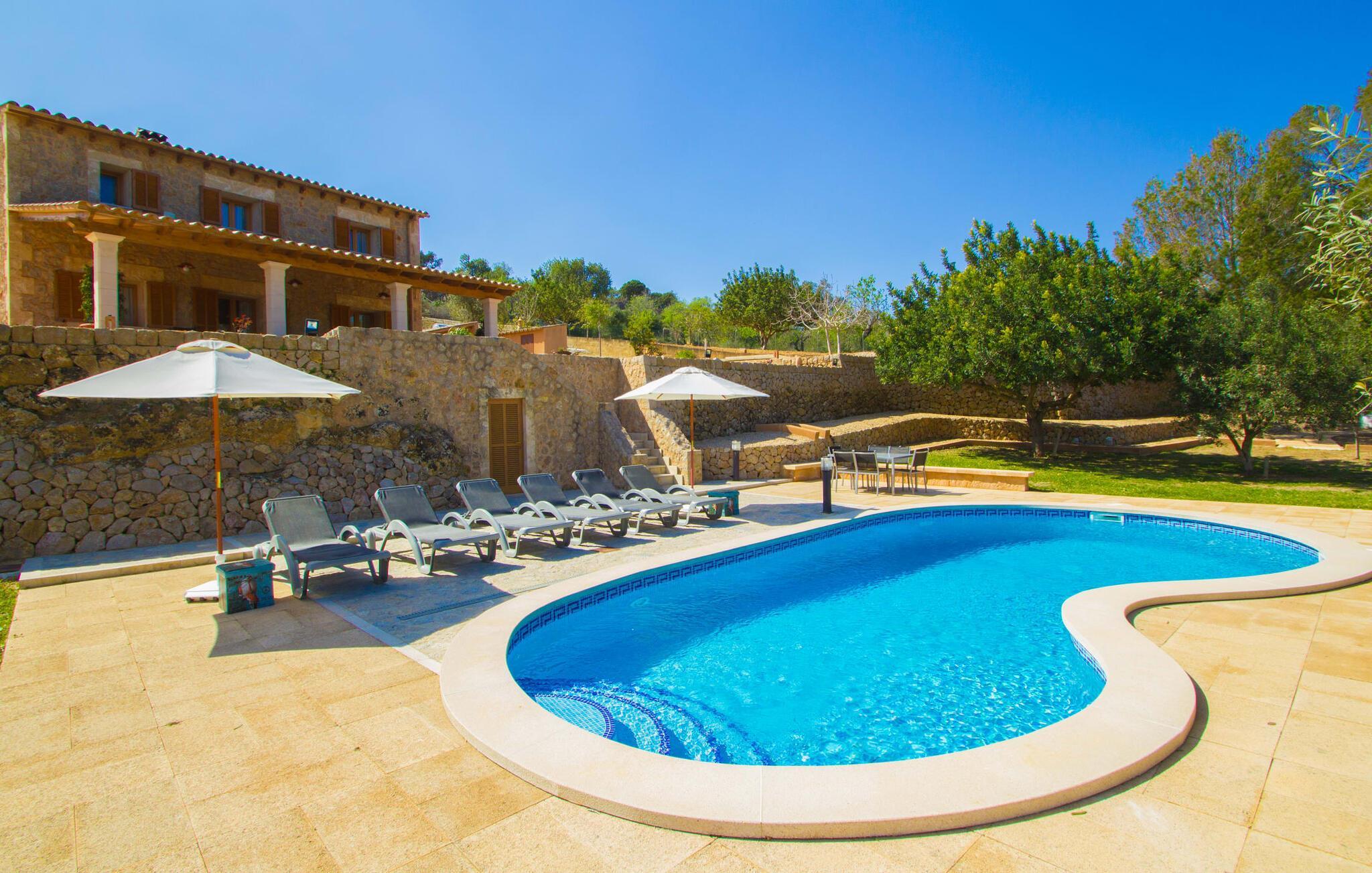 Reiseveranstalter werben oft mit dem Bild eines glitzernden blauen Pools, umgeben von Liegestühlen. Normalerweise muss man diesen idyllischen Urlaubsort mit anderen erholungssuchenden Reisenden teilen, was im schlimmsten Fall mit viel Lärm verbunden sein kann. In der Villa „Can Mirlo“ werden Ihre Tage anders sein. Sie werden von erstklassigem Stil umgeben sein und wenn Sie möchten, können Sie den weiten Blick über das Landesinnere Mallorcas bis hin zu den Bergen im Norden genießen. Die Poolterrasse liegt direkt unterhalb des Hauses. Über ein paar Steinstufen gelangen Sie zum Wasser und in den direkt angrenzenden Garten. Eine große Vielfalt an Baumarten weist hier den Weg: Einfach die Sonne scheinen lassen und ansonsten das pure Dasein genießen. Direkt an das Haus grenzt eine überdachte Veranda, auf der Sie abends den Tag bei einer Flasche Wein ausklingen lassen können. Dank eines Außenbades können Sie von morgens bis abends die milde Inselluft in vollen Zügen genießen.