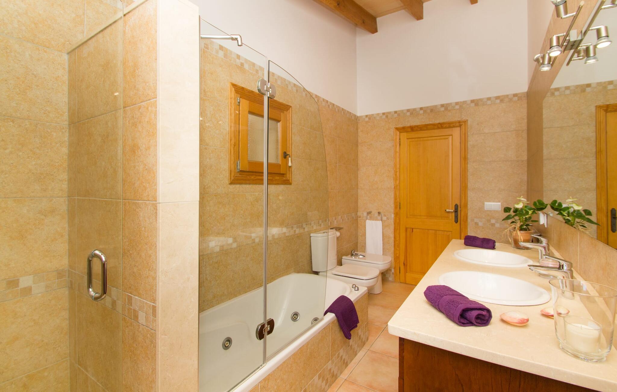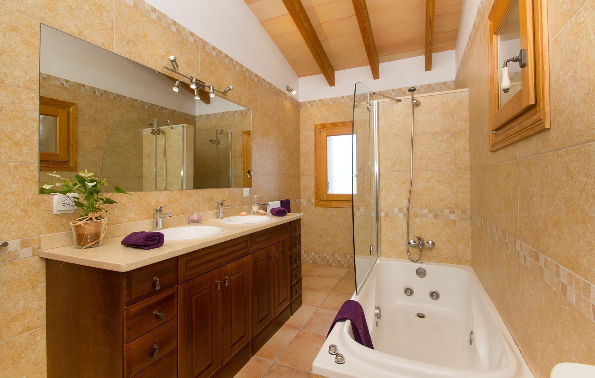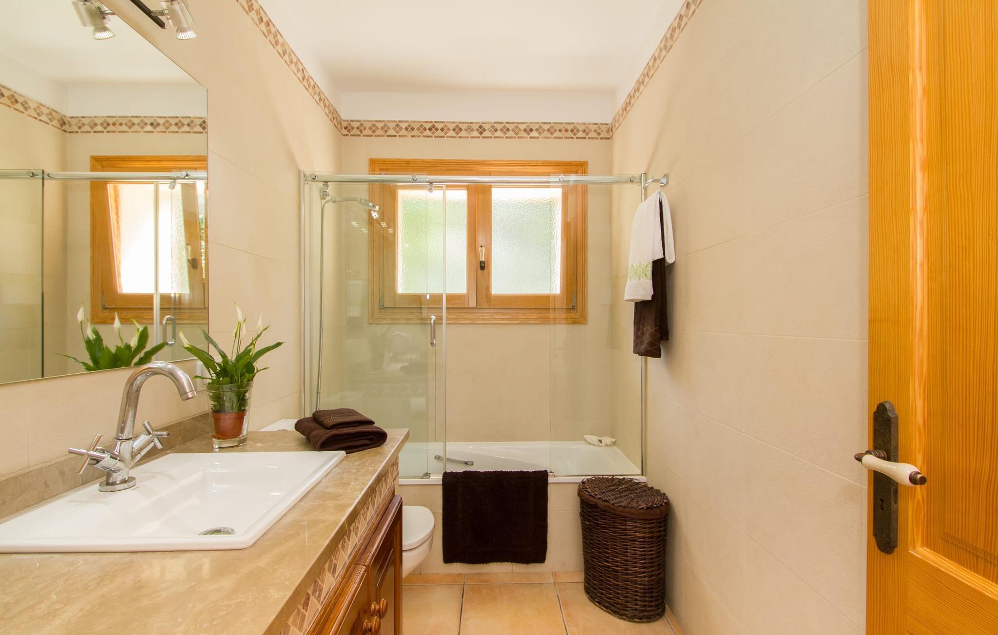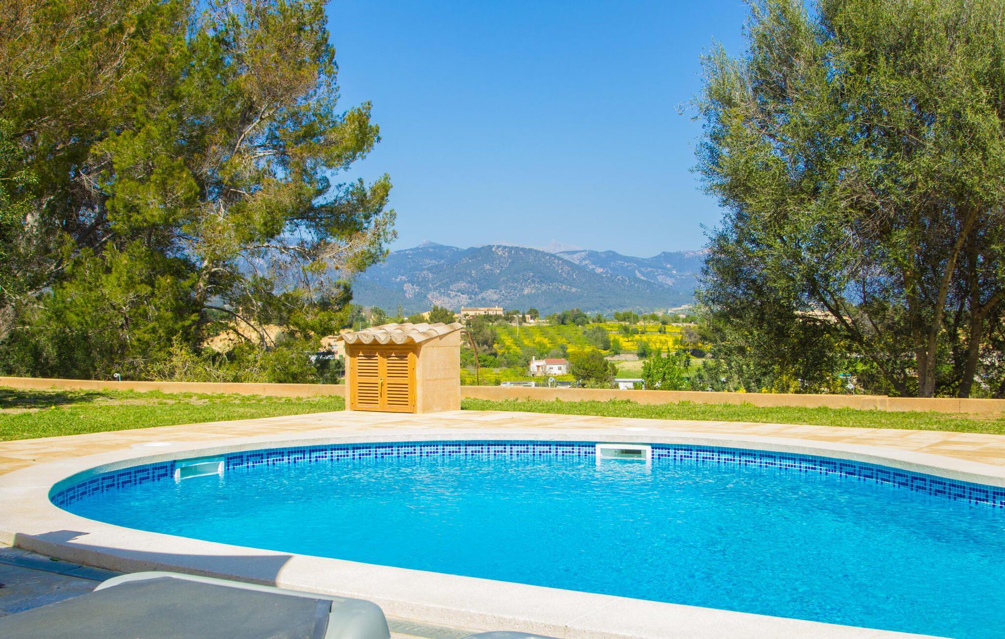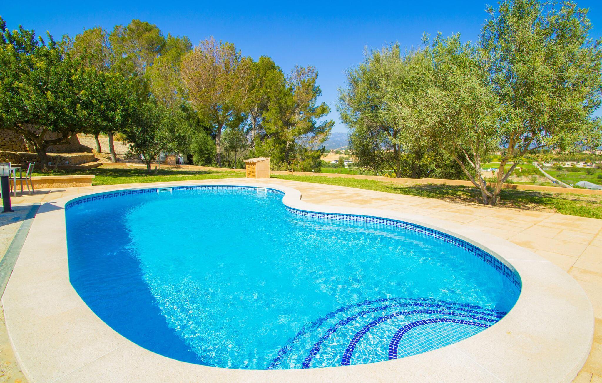 Reiseveranstalter werben oft mit dem Bild eines glitzernden blauen Pools, umgeben von Liegestühlen. Normalerweise muss man diesen idyllischen Urlaubsort mit anderen erholungssuchenden Reisenden teilen, was im schlimmsten Fall mit viel Lärm verbunden sein kann. In der Villa „Can Mirlo“ werden Ihre Tage anders sein. Sie werden von erstklassigem Stil umgeben sein und wenn Sie möchten, können Sie den weiten Blick über das Landesinnere Mallorcas bis hin zu den Bergen im Norden genießen. Die Poolterrasse liegt direkt unterhalb des Hauses. Über ein paar Steinstufen gelangen Sie zum Wasser und in den direkt angrenzenden Garten. Eine große Vielfalt an Baumarten weist hier den Weg: Einfach die Sonne scheinen lassen und ansonsten das pure Dasein genießen. Direkt an das Haus grenzt eine überdachte Veranda, auf der Sie abends den Tag bei einer Flasche Wein ausklingen lassen können. Dank eines Außenbades können Sie von morgens bis abends die milde Inselluft in vollen Zügen genießen.