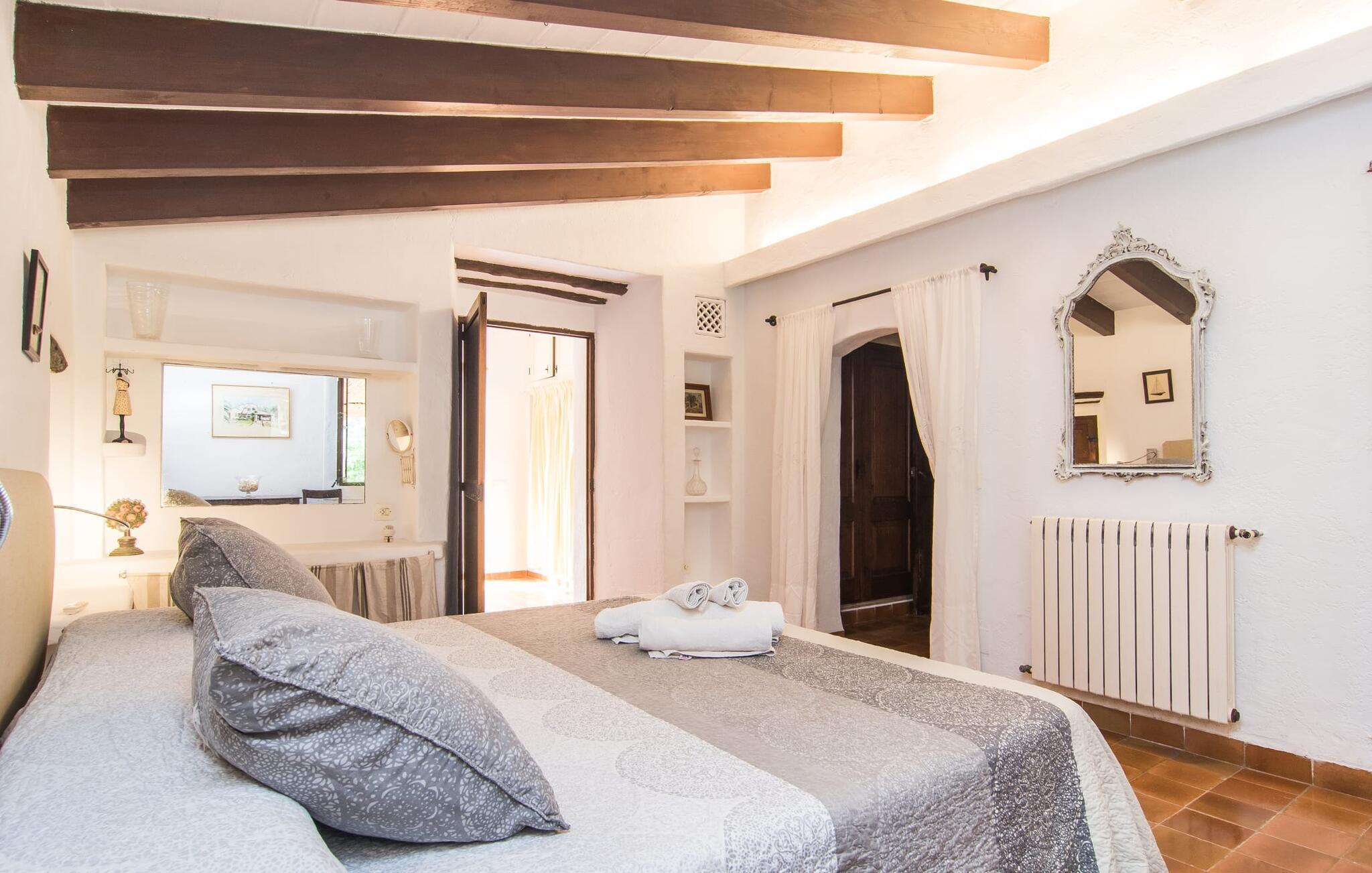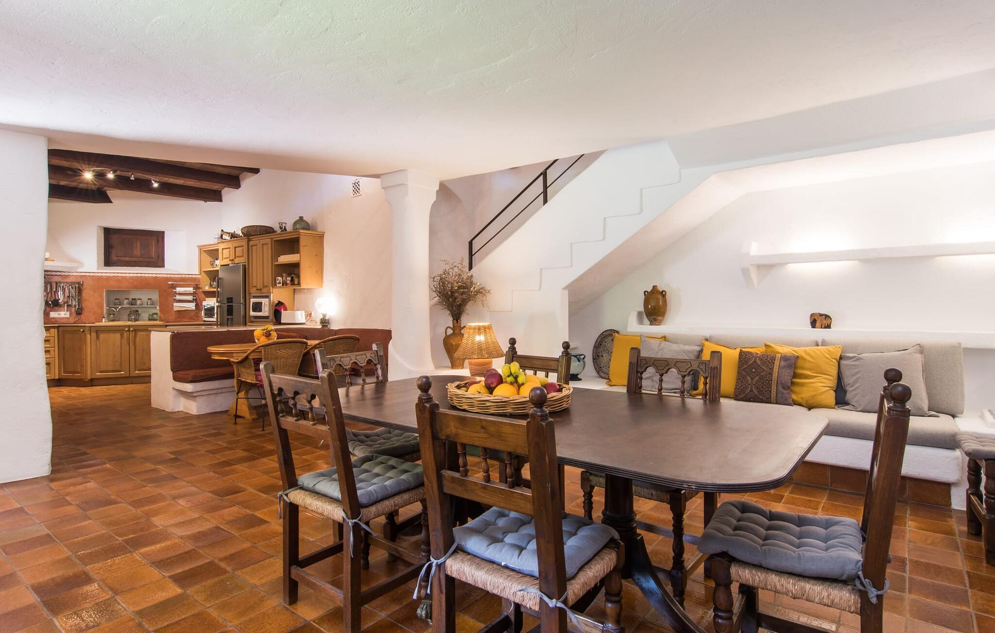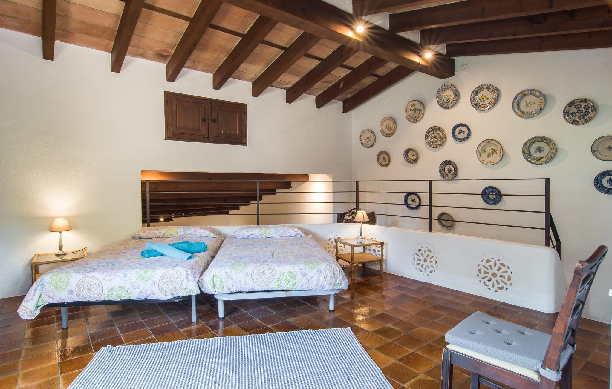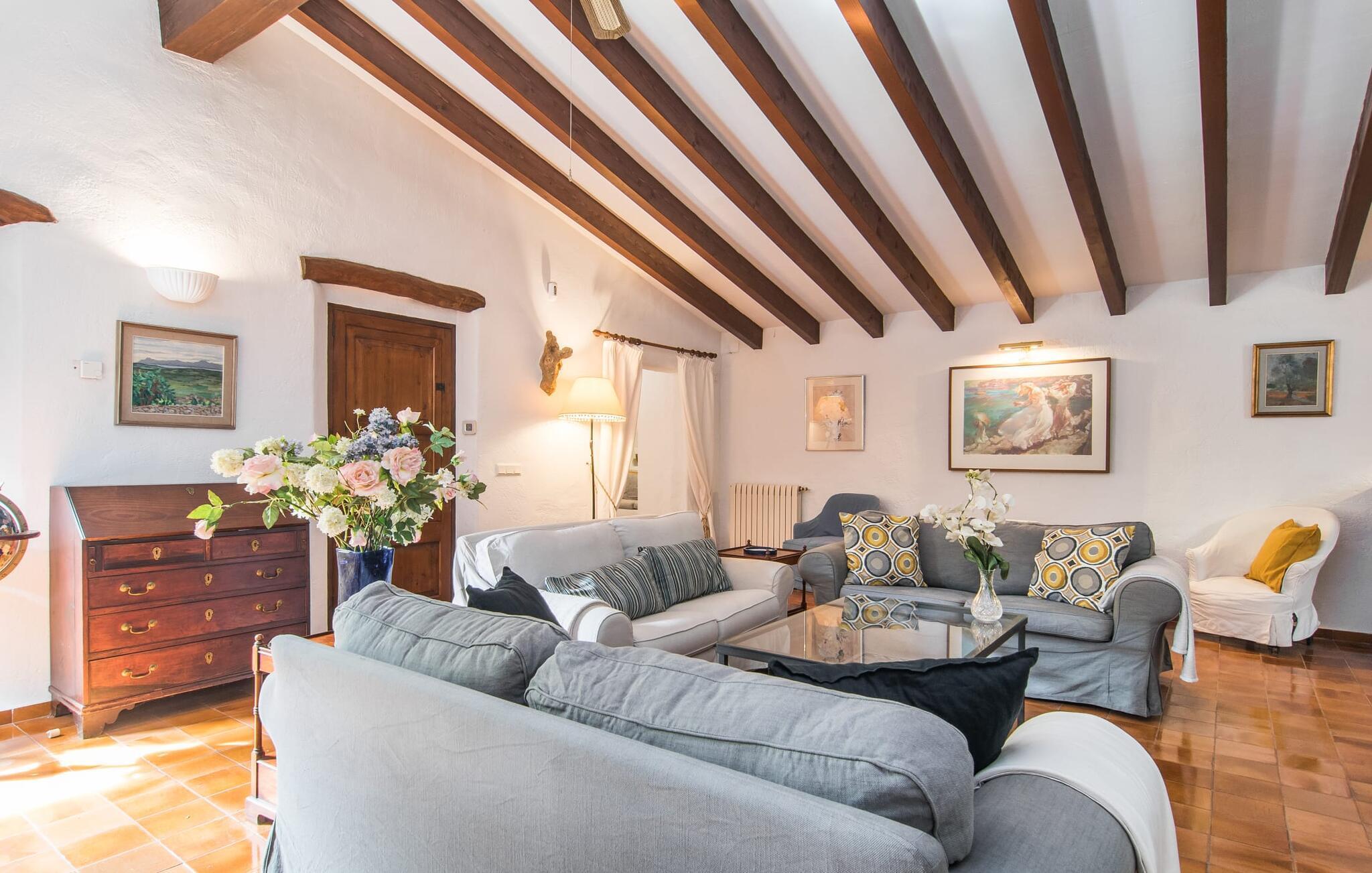 Auch der Innenbereich von „Can Papalaia“ wurde liebevoll dekoriert. Die Atmosphäre der Räume lebt von den vielen kleinen Details, die es zu entdecken gilt: diverse Wandgemälde und andere Wanddekorationen, hübsche Lampen, einzigartige Accessoires. Massive Möbel, viel Holz inklusive klassischer Holzbalken an den Decken runden das mallorquinisch-charmante Flair harmonisch ab. Die voll ausgestattete Küche und das Ess-/Wohnzimmer bilden das Herzstück des Erdgeschosses, wo sich außerdem drei gemütliche Doppelzimmer – eines davon mit einem Einzelzimmer verbunden – und zwei Badezimmer befinden. Im Obergeschoss befindet sich in offener Raumaufteilung der studioartige Schlafbereich mit eigenem Bad. Das Haus, das 450 m² Wohnfläche bietet, ist dank Heizung und Klimaanlage ganzjährig bewohnbar, auf Wunsch kann auch der Kamin genutzt werden. Die idyllisch gelegene Finca „Can Papalaia“ mit üppigem Garten und privatem Pool liegt im Grünen vor den Toren von Port de Pollença und der gleichnamigen Bucht. Einkaufsmöglichkeiten sind nur wenige Autominuten entfernt. Der schöne Küstenort verfügt außerdem über einen feinsandigen Stadtstrand und zahlreiche Bars und Restaurants. Auch andere Sandstrände sind in kurzer Zeit erreichbar, so ist Can Cap de Bou beispielsweise nur 10 Autominuten entfernt.