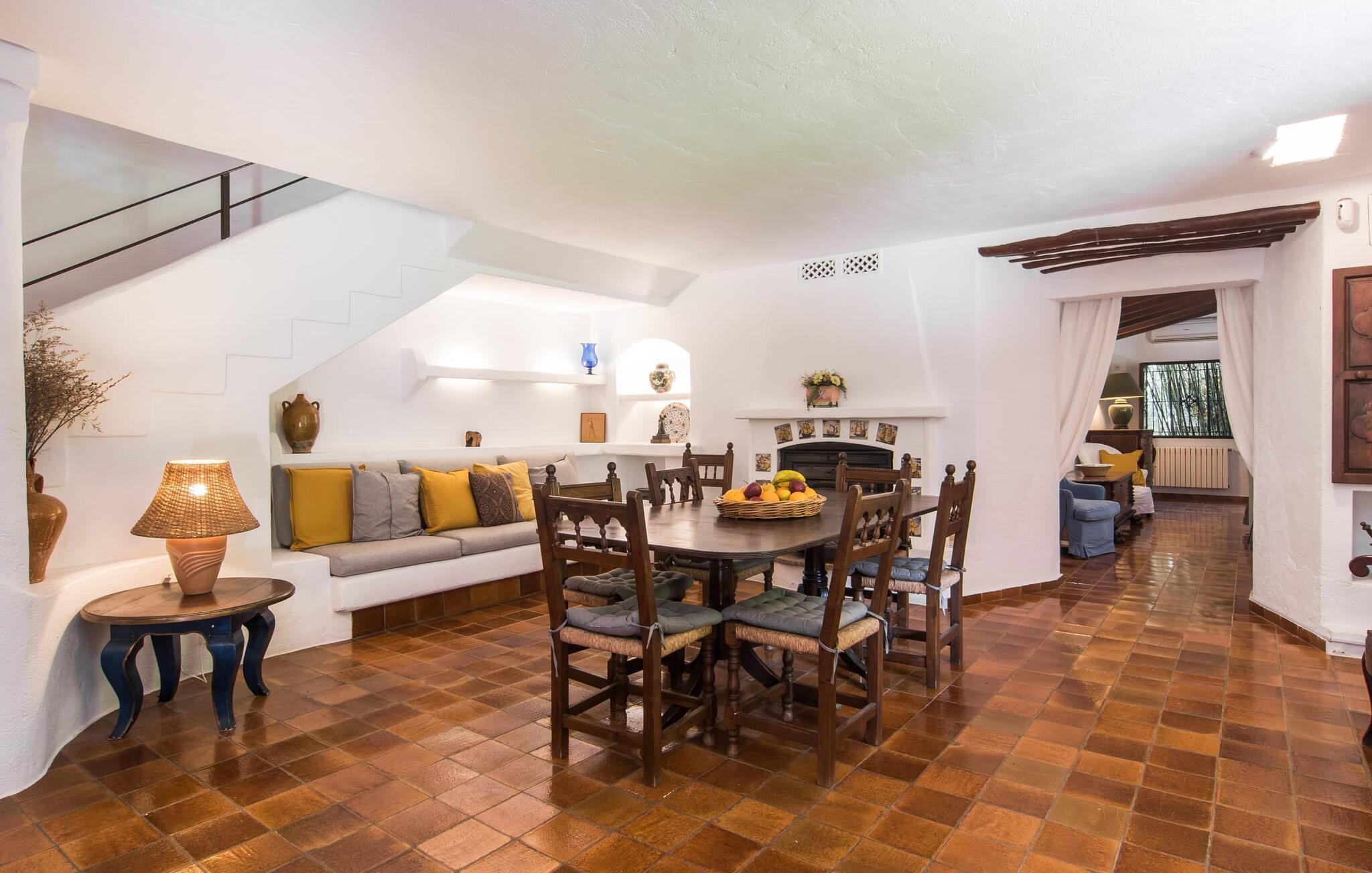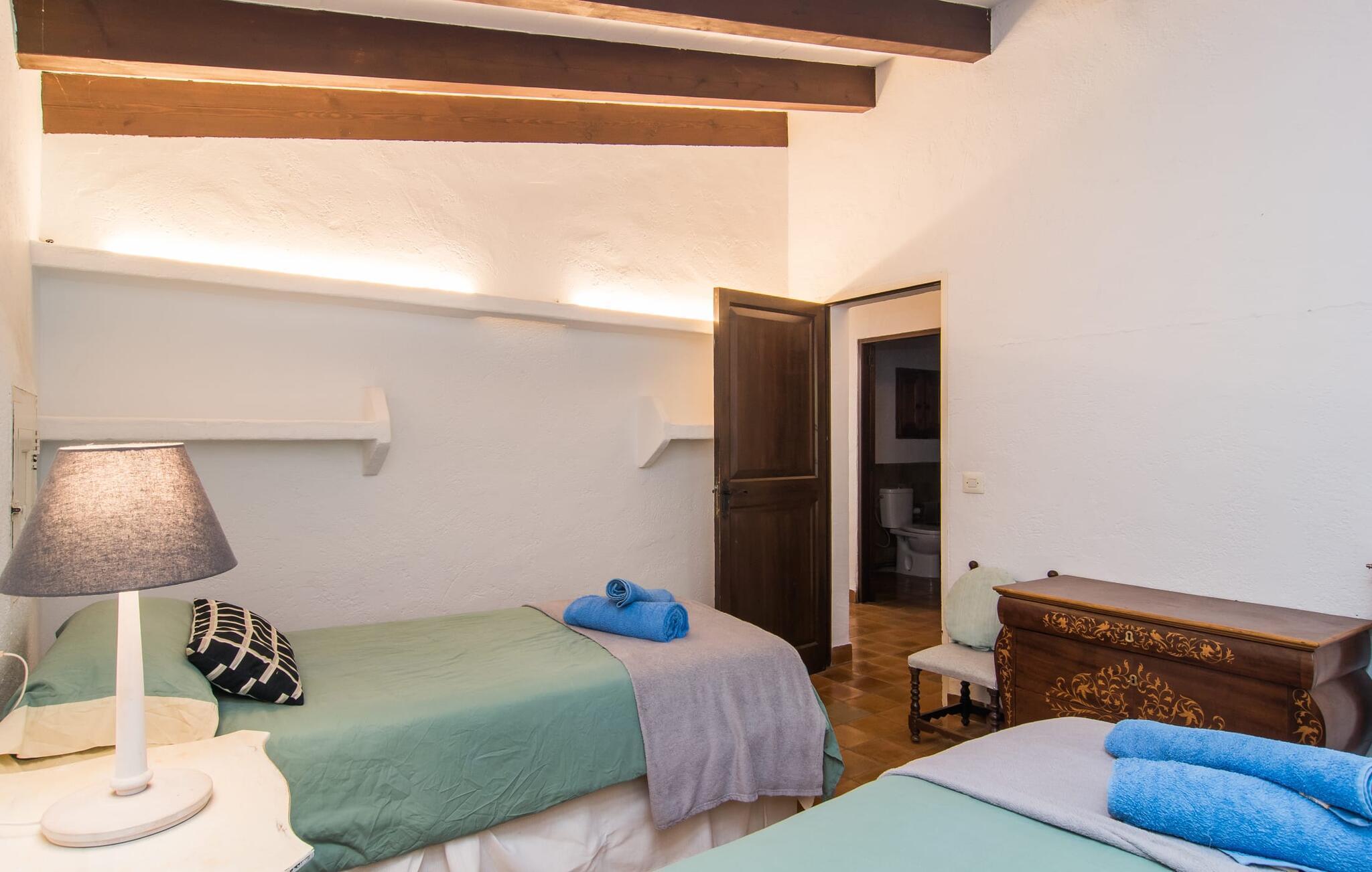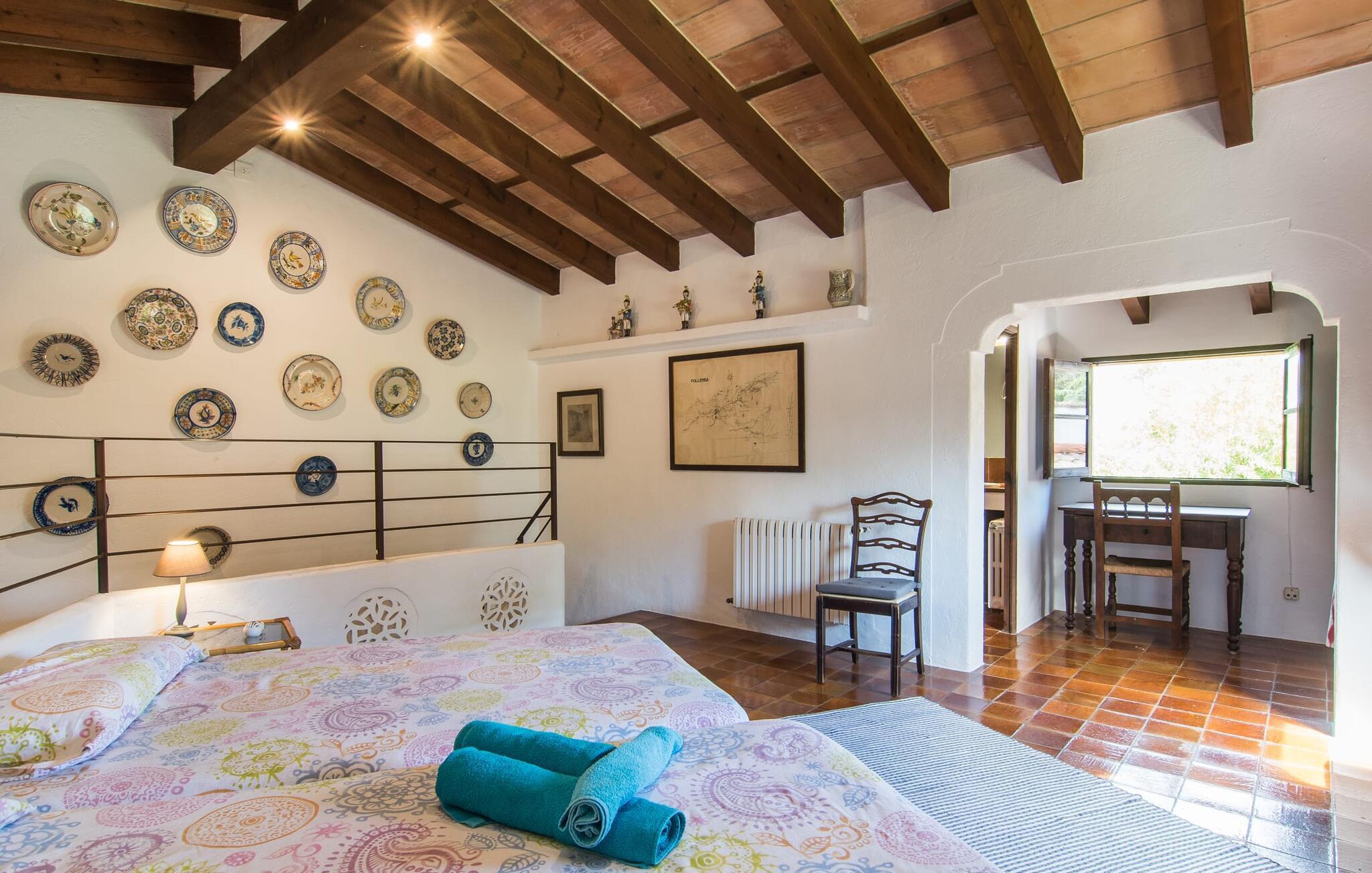 Auch der Innenbereich von „Can Papalaia“ wurde liebevoll dekoriert. Die Atmosphäre der Räume lebt von den vielen kleinen Details, die es zu entdecken gilt: diverse Wandgemälde und andere Wanddekorationen, hübsche Lampen, einzigartige Accessoires. Massive Möbel, viel Holz inklusive klassischer Holzbalken an den Decken runden das mallorquinisch-charmante Flair harmonisch ab. Die voll ausgestattete Küche und das Ess-/Wohnzimmer bilden das Herzstück des Erdgeschosses, wo sich außerdem drei gemütliche Doppelzimmer – eines davon mit einem Einzelzimmer verbunden – und zwei Badezimmer befinden. Im Obergeschoss befindet sich in offener Raumaufteilung der studioartige Schlafbereich mit eigenem Bad. Das Haus, das 450 m² Wohnfläche bietet, ist dank Heizung und Klimaanlage ganzjährig bewohnbar, auf Wunsch kann auch der Kamin genutzt werden. Die idyllisch gelegene Finca „Can Papalaia“ mit üppigem Garten und privatem Pool liegt im Grünen vor den Toren von Port de Pollença und der gleichnamigen Bucht. Einkaufsmöglichkeiten sind nur wenige Autominuten entfernt. Der schöne Küstenort verfügt außerdem über einen feinsandigen Stadtstrand und zahlreiche Bars und Restaurants. Auch andere Sandstrände sind in kurzer Zeit erreichbar, so ist Can Cap de Bou beispielsweise nur 10 Autominuten entfernt.