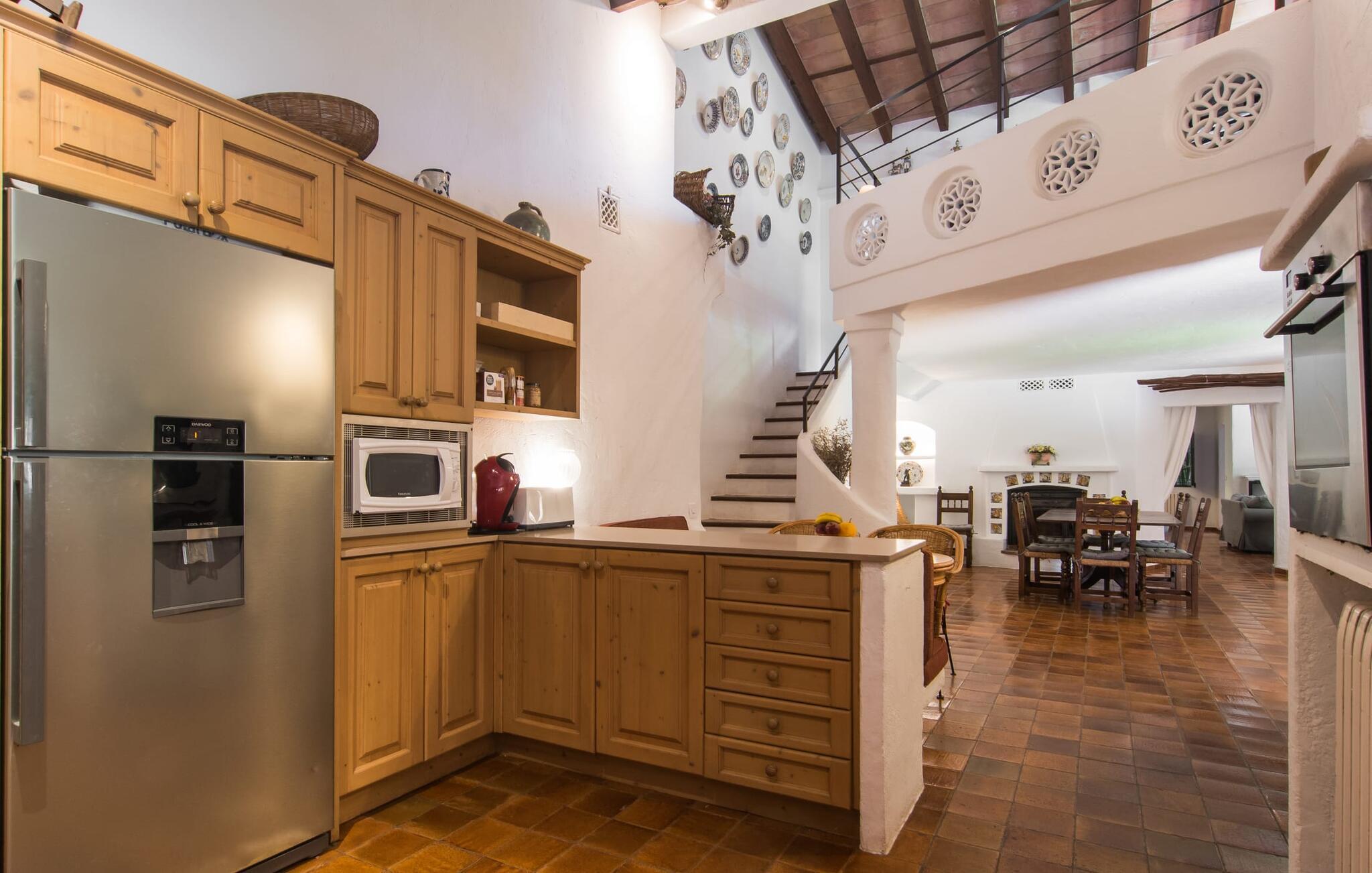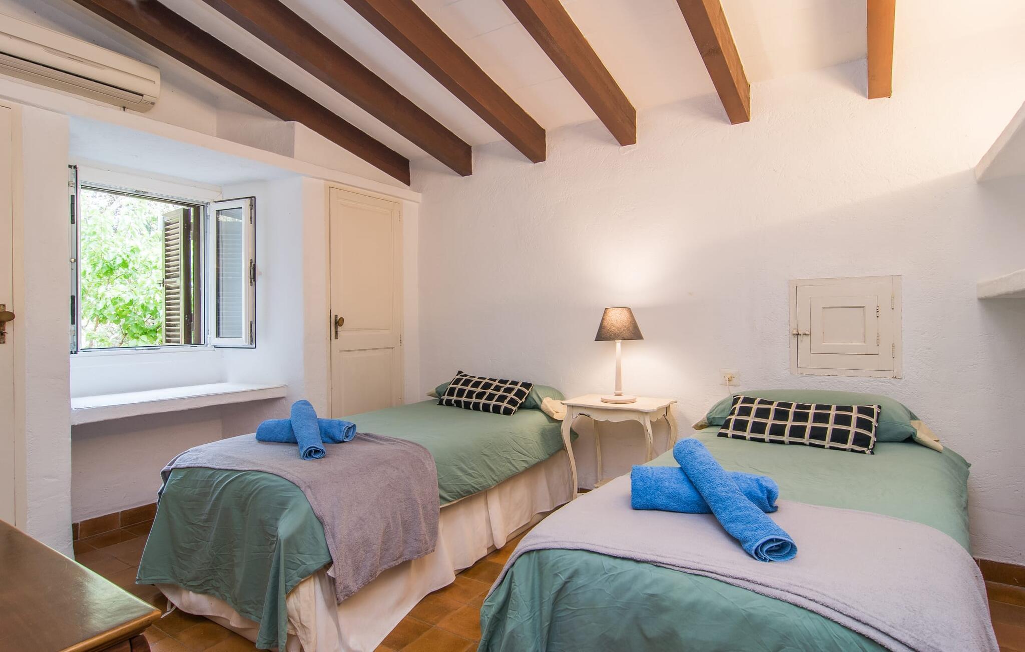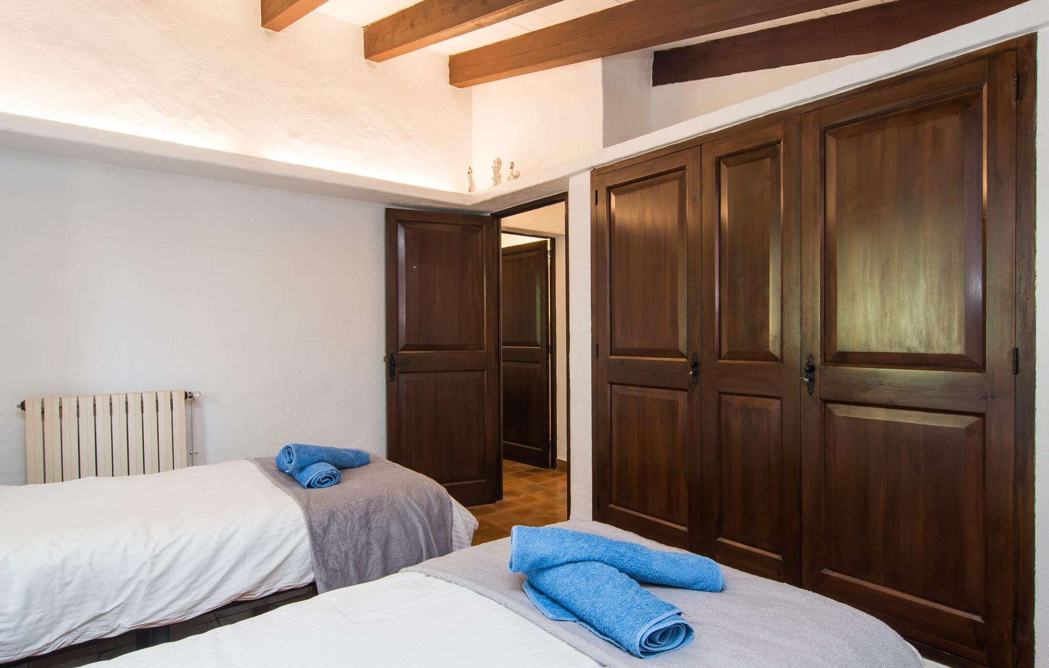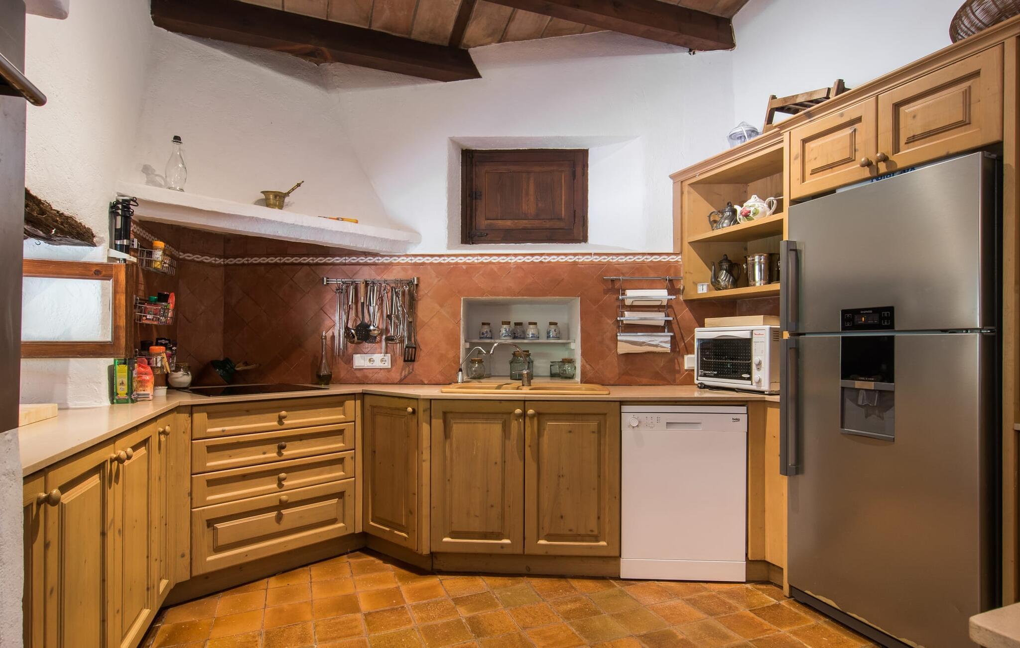 Auch der Innenbereich von „Can Papalaia“ wurde liebevoll dekoriert. Die Atmosphäre der Räume lebt von den vielen kleinen Details, die es zu entdecken gilt: diverse Wandgemälde und andere Wanddekorationen, hübsche Lampen, einzigartige Accessoires. Massive Möbel, viel Holz inklusive klassischer Holzbalken an den Decken runden das mallorquinisch-charmante Flair harmonisch ab. Die voll ausgestattete Küche und das Ess-/Wohnzimmer bilden das Herzstück des Erdgeschosses, wo sich außerdem drei gemütliche Doppelzimmer – eines davon mit einem Einzelzimmer verbunden – und zwei Badezimmer befinden. Im Obergeschoss befindet sich in offener Raumaufteilung der studioartige Schlafbereich mit eigenem Bad. Das Haus, das 450 m² Wohnfläche bietet, ist dank Heizung und Klimaanlage ganzjährig bewohnbar, auf Wunsch kann auch der Kamin genutzt werden. Die idyllisch gelegene Finca „Can Papalaia“ mit üppigem Garten und privatem Pool liegt im Grünen vor den Toren von Port de Pollença und der gleichnamigen Bucht. Einkaufsmöglichkeiten sind nur wenige Autominuten entfernt. Der schöne Küstenort verfügt außerdem über einen feinsandigen Stadtstrand und zahlreiche Bars und Restaurants. Auch andere Sandstrände sind in kurzer Zeit erreichbar, so ist Can Cap de Bou beispielsweise nur 10 Autominuten entfernt.