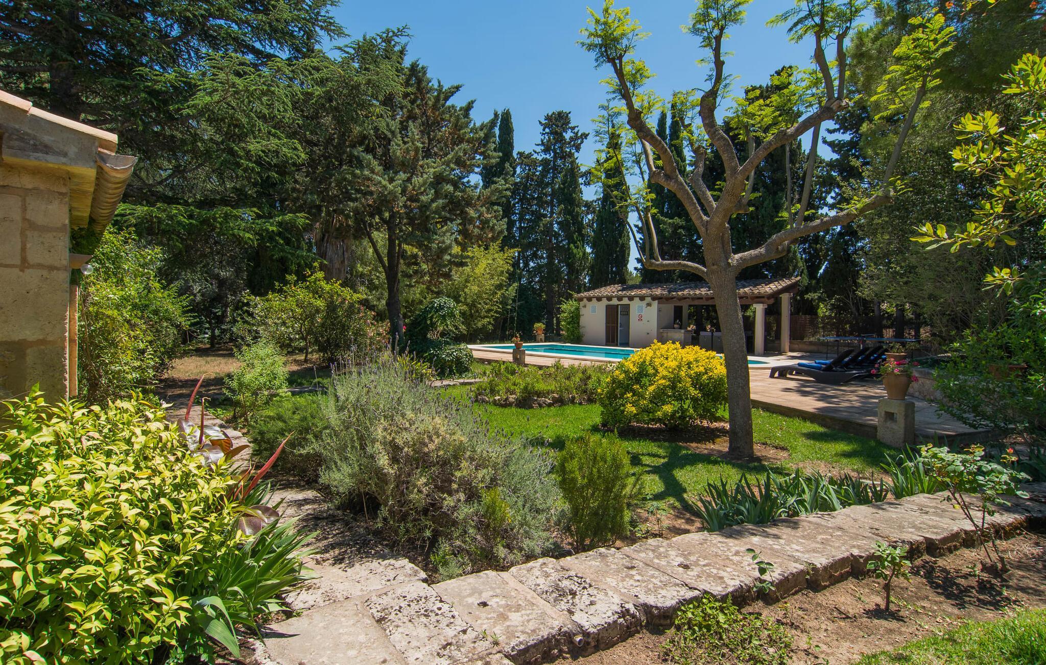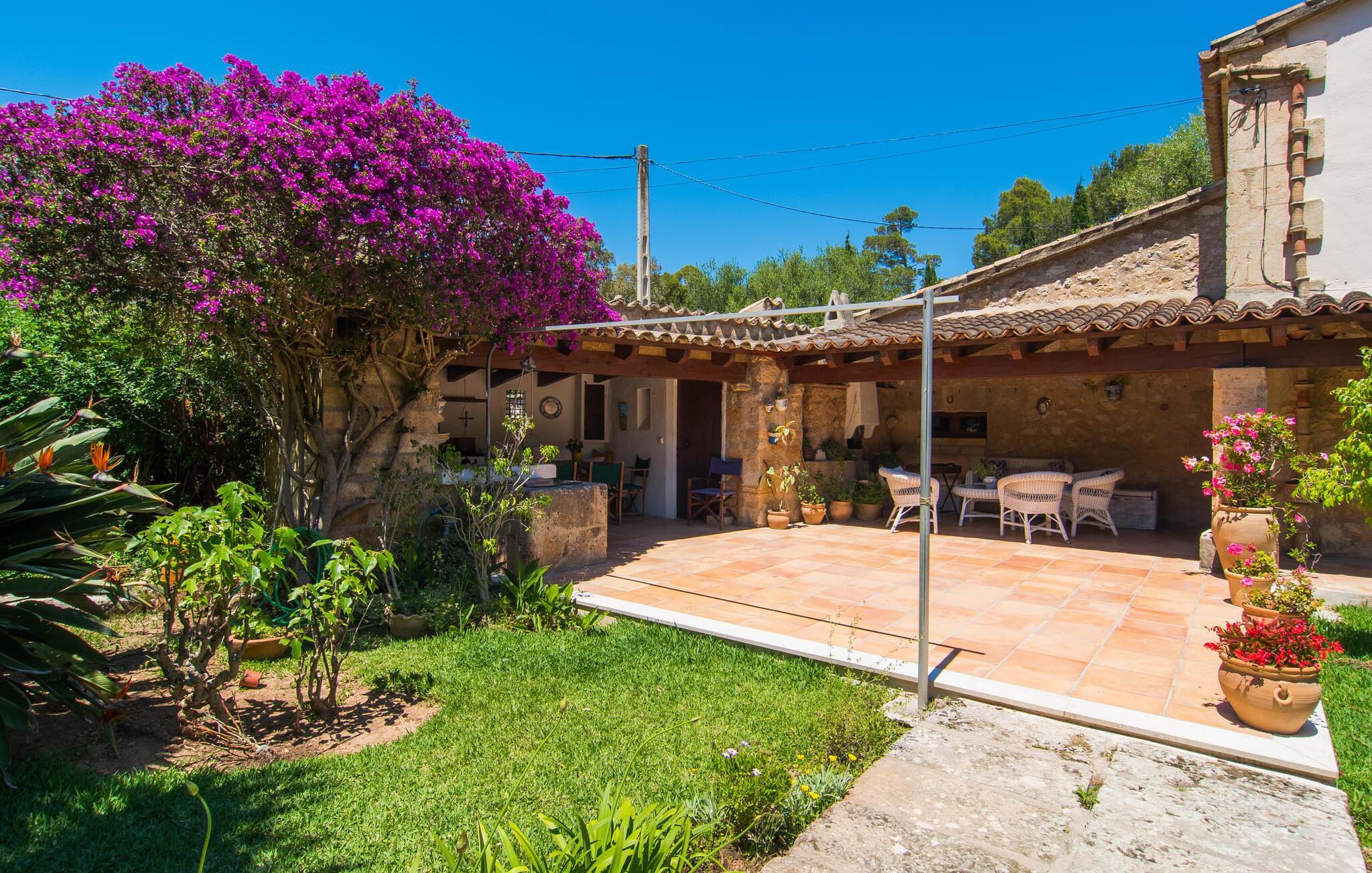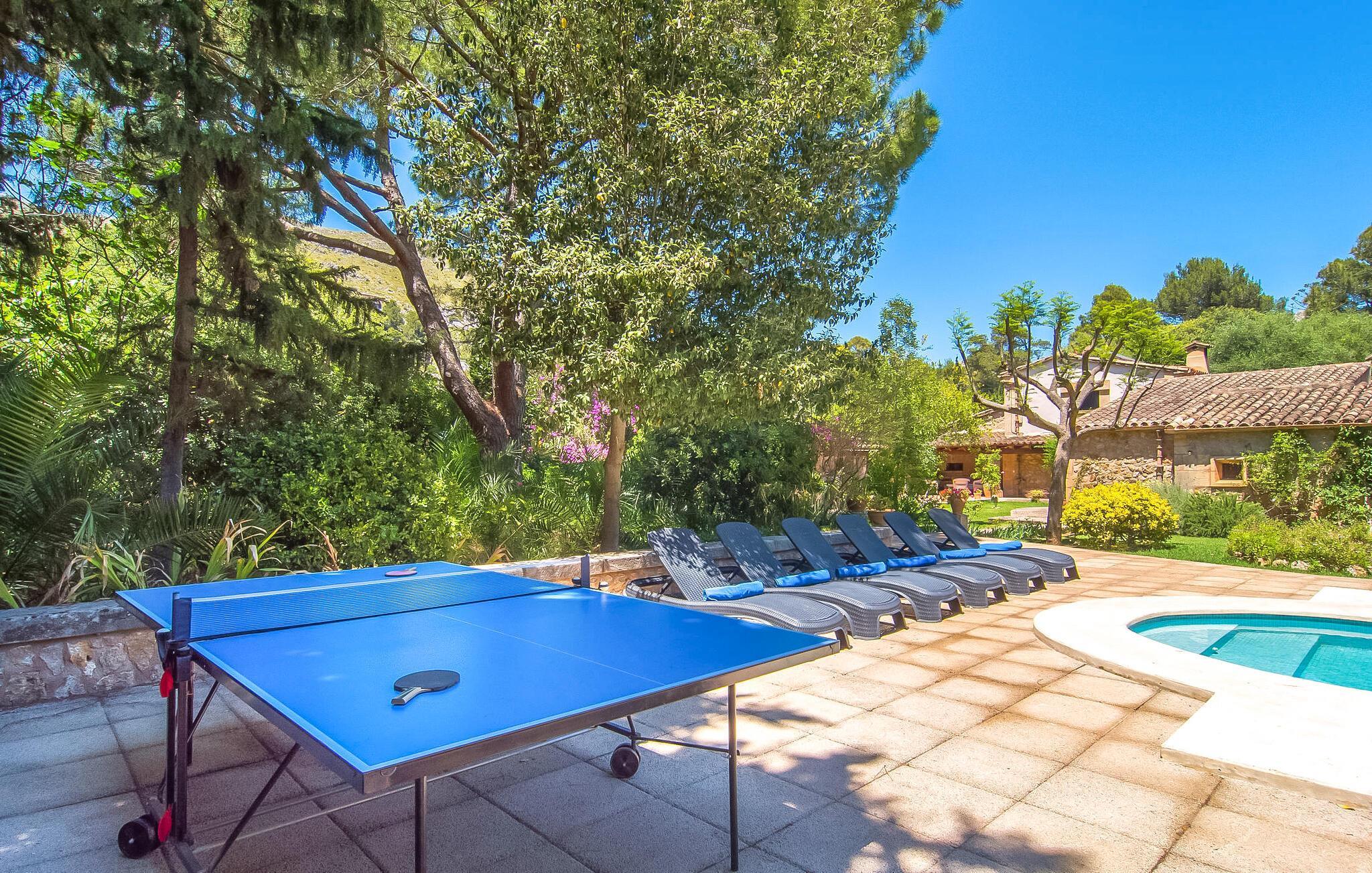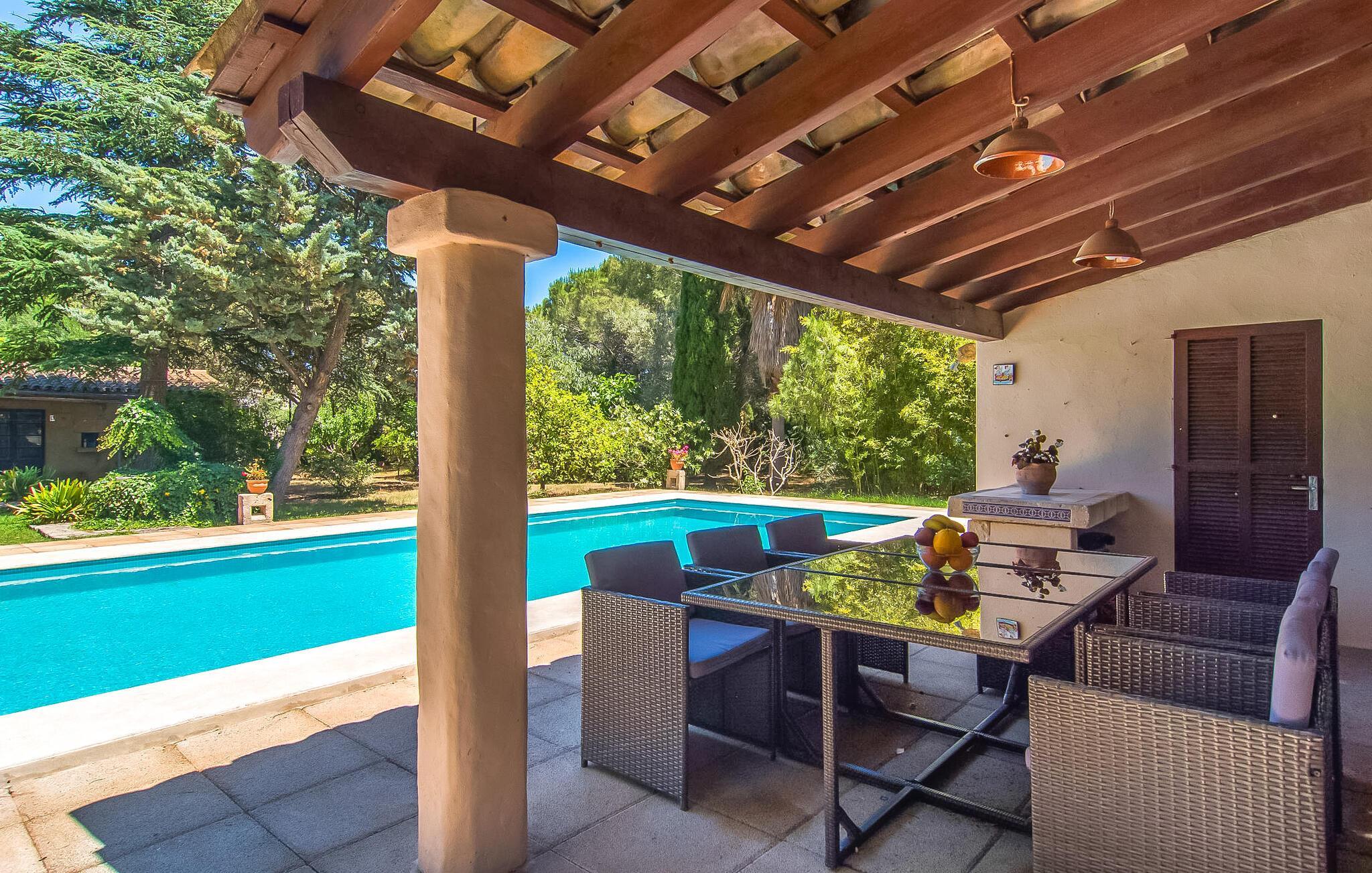 Wer einen echten Rückzugsort für rundum erholsame Ferien sucht, wird hier fündig! Auf einer Fläche von 2.000 m² mit wunderschönen Bäumen und Blumen finden Sie rund um dieses gemütliche Ferienhaus auf Mallorca echte Ruhe, ohne sich gleich an einem einsamen Ort wiederzufinden. Die hohen, abwechslungsreichen Bäume und Sträucher vermitteln ein einladendes Gefühl von Geborgenheit und natürlich angenehm luftigen Naturschatten. Gepflasterte Wege führen zu den verschiedenen hübschen Plätzen, darunter zum flachen Pool, der bequem über eine römische Treppe erreichbar ist, und zur umliegenden Terrasse, wo bequeme Liegestühle auf Sonnenanbeter warten. Ein überdachter Bereich nebenan lädt zum Entspannen im Schatten ein, während Sie die Kinder im Auge behalten, die vielleicht herumplanschen. Auch die Tischtennisplatte für das Match zwischendurch steht hier im Schatten – Abkühlung verspricht die praktische Außendusche. Mehrere überdachte Bereiche direkt am Haus bieten zusätzliche, rustikale Sitzgelegenheiten zum Entspannen oder gemeinsamen Essen, zum Beispiel am Grill, der abends in der Außenküche angeheizt werden darf und auf dem mediterrane Köstlichkeiten schmoren.
