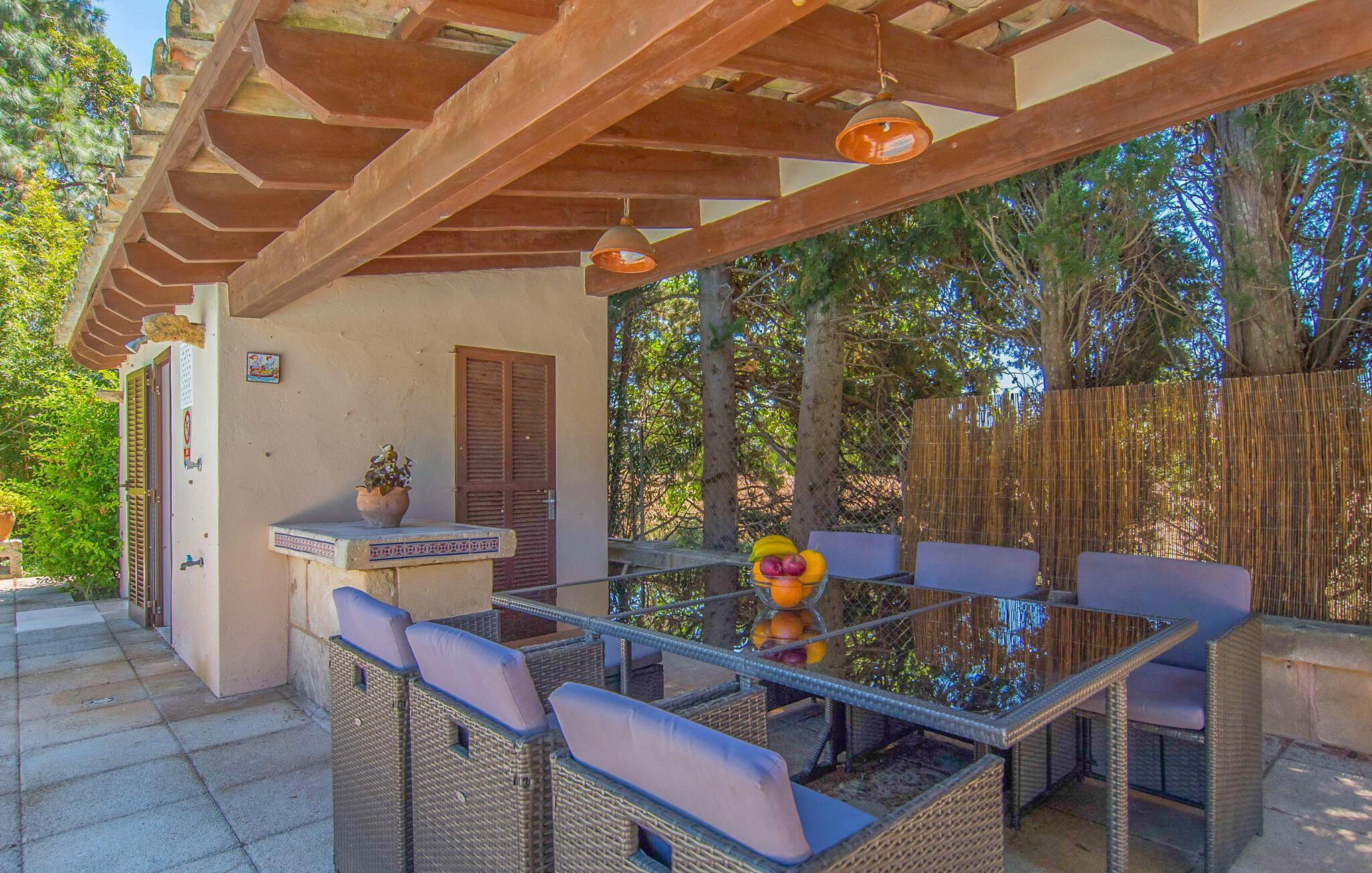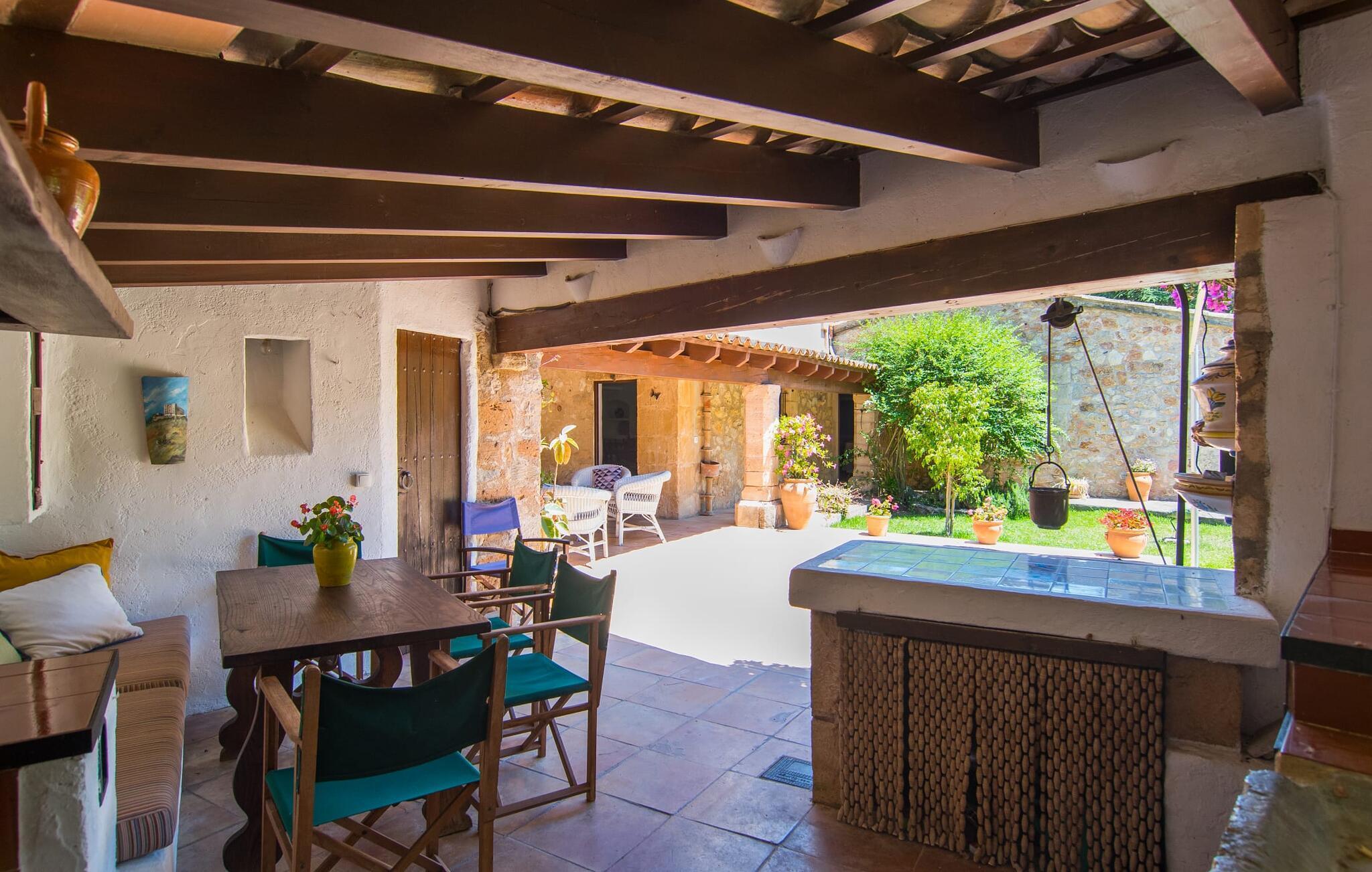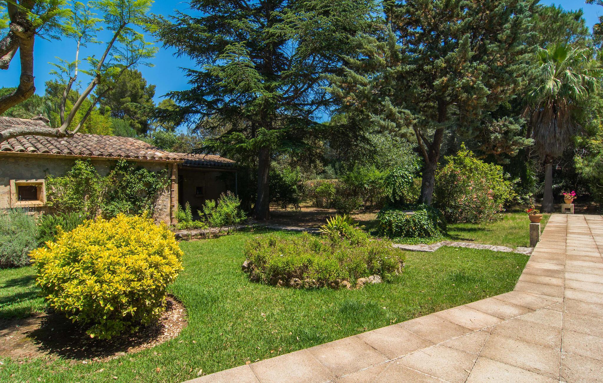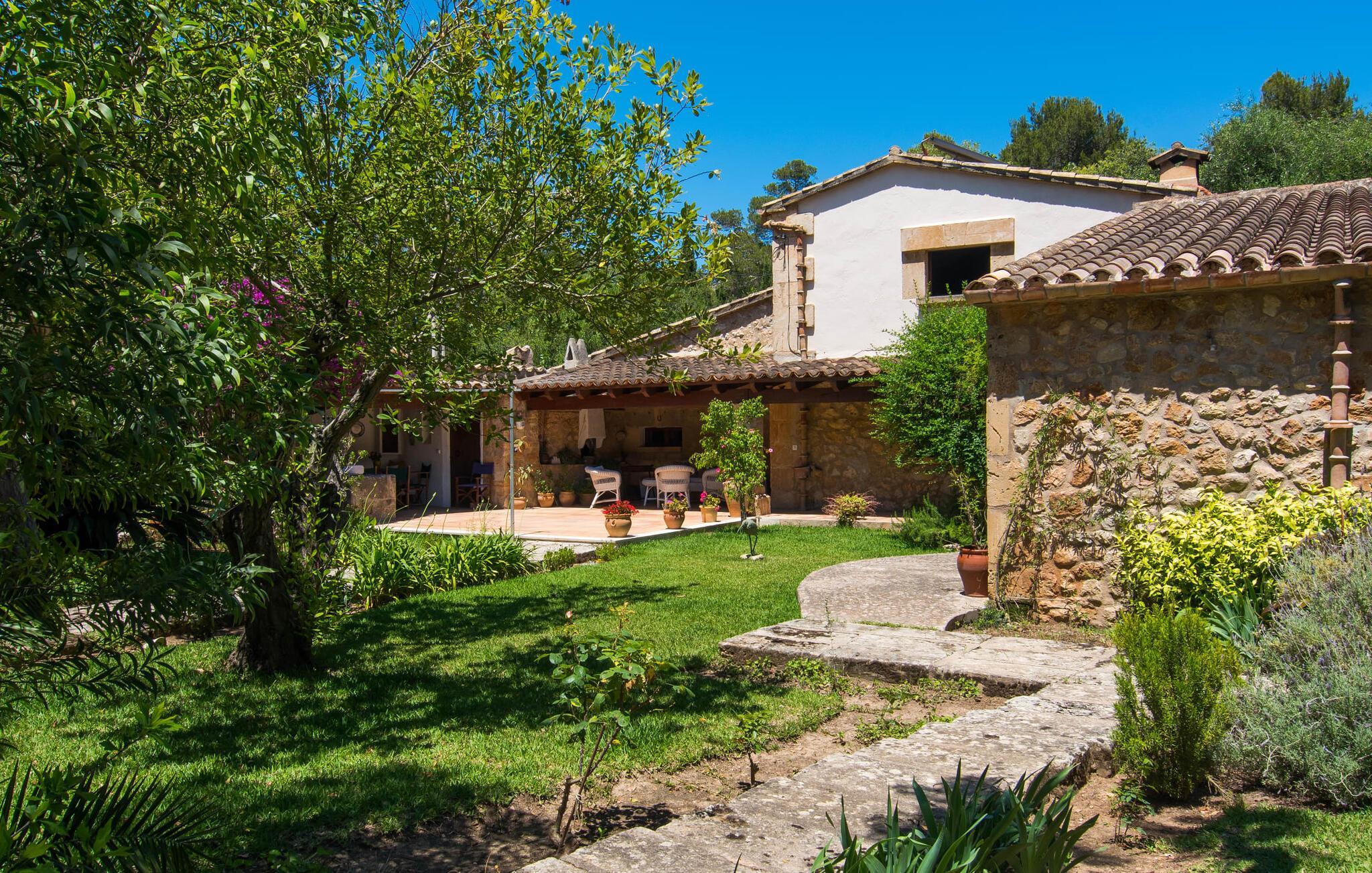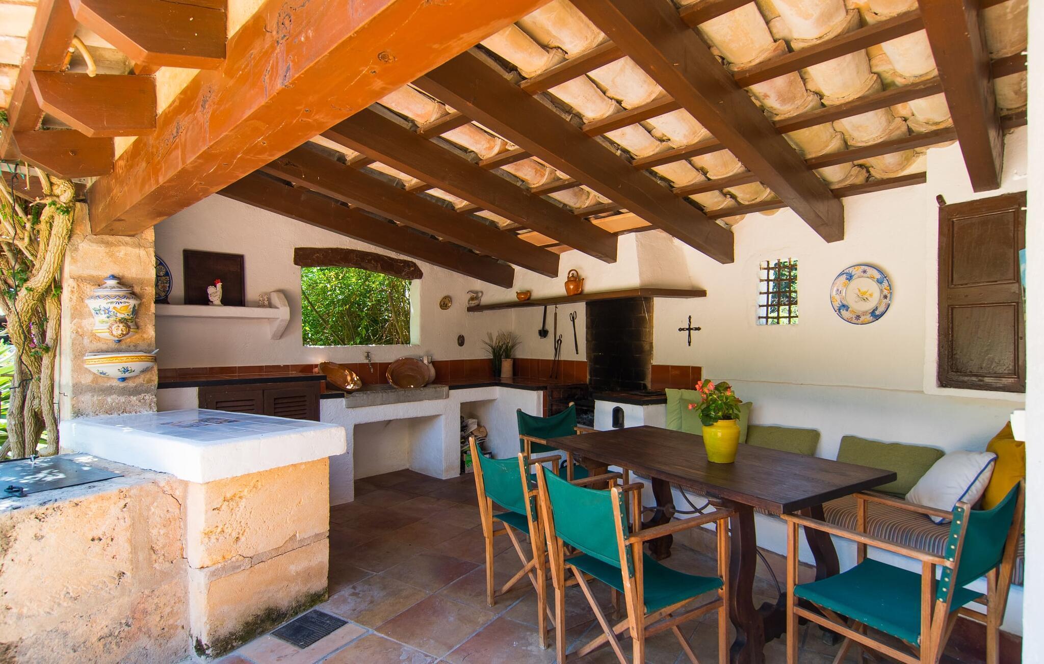 Wer einen echten Rückzugsort für rundum erholsame Ferien sucht, wird hier fündig! Auf einer Fläche von 2.000 m² mit wunderschönen Bäumen und Blumen finden Sie rund um dieses gemütliche Ferienhaus auf Mallorca echte Ruhe, ohne sich gleich an einem einsamen Ort wiederzufinden. Die hohen, abwechslungsreichen Bäume und Sträucher vermitteln ein einladendes Gefühl von Geborgenheit und natürlich angenehm luftigen Naturschatten. Gepflasterte Wege führen zu den verschiedenen hübschen Plätzen, darunter zum flachen Pool, der bequem über eine römische Treppe erreichbar ist, und zur umliegenden Terrasse, wo bequeme Liegestühle auf Sonnenanbeter warten. Ein überdachter Bereich nebenan lädt zum Entspannen im Schatten ein, während Sie die Kinder im Auge behalten, die vielleicht herumplanschen. Auch die Tischtennisplatte für das Match zwischendurch steht hier im Schatten – Abkühlung verspricht die praktische Außendusche. Mehrere überdachte Bereiche direkt am Haus bieten zusätzliche, rustikale Sitzgelegenheiten zum Entspannen oder gemeinsamen Essen, zum Beispiel am Grill, der abends in der Außenküche angeheizt werden darf und auf dem mediterrane Köstlichkeiten schmoren.