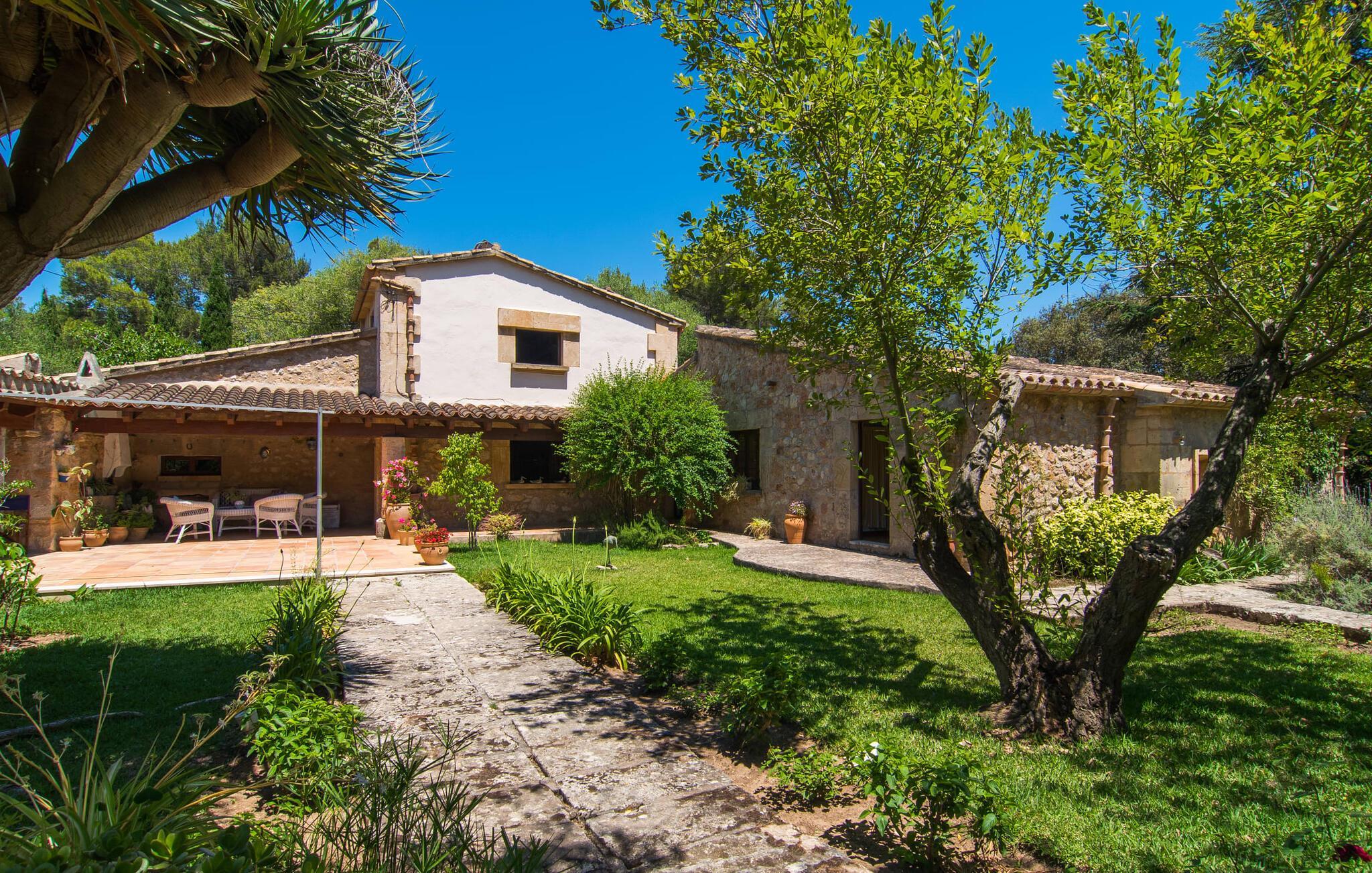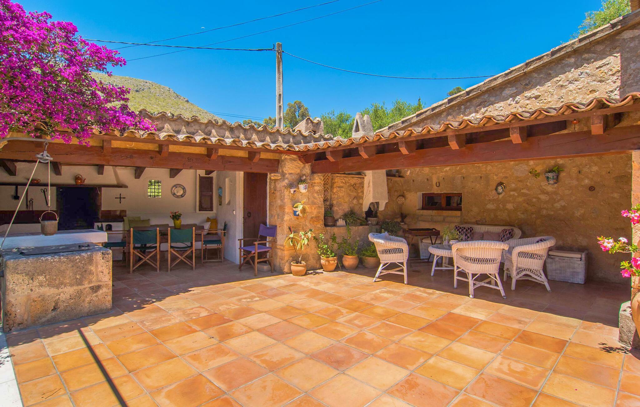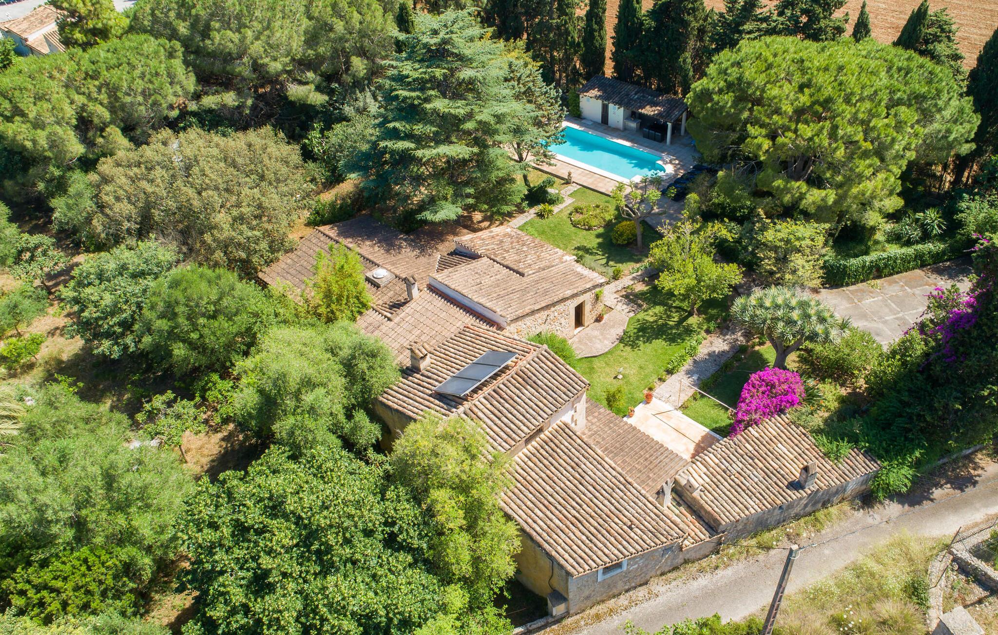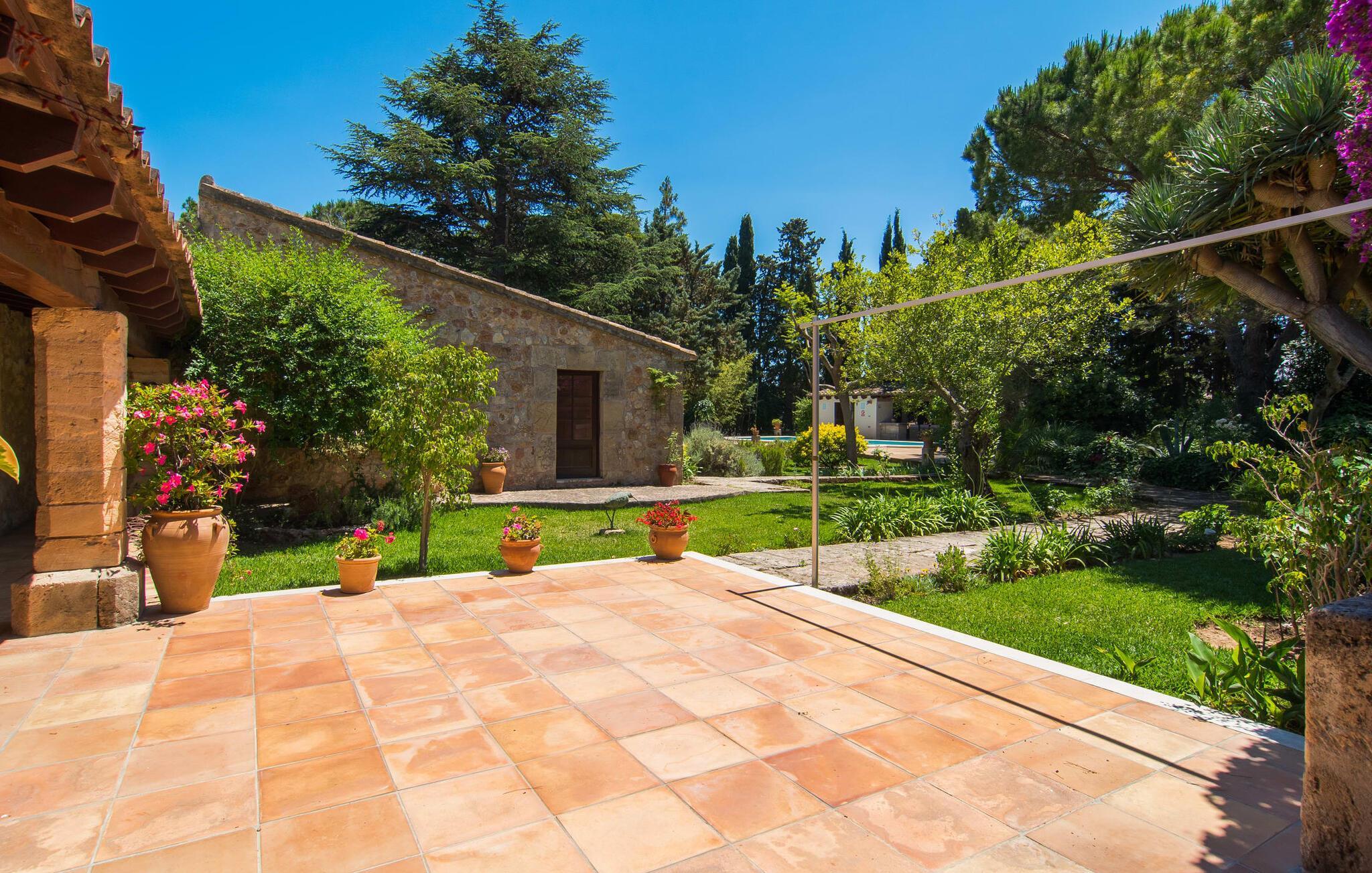 Wer einen echten Rückzugsort für rundum erholsame Ferien sucht, wird hier fündig! Auf einer Fläche von 2.000 m² mit wunderschönen Bäumen und Blumen finden Sie rund um dieses gemütliche Ferienhaus auf Mallorca echte Ruhe, ohne sich gleich an einem einsamen Ort wiederzufinden. Die hohen, abwechslungsreichen Bäume und Sträucher vermitteln ein einladendes Gefühl von Geborgenheit und natürlich angenehm luftigen Naturschatten. Gepflasterte Wege führen zu den verschiedenen hübschen Plätzen, darunter zum flachen Pool, der bequem über eine römische Treppe erreichbar ist, und zur umliegenden Terrasse, wo bequeme Liegestühle auf Sonnenanbeter warten. Ein überdachter Bereich nebenan lädt zum Entspannen im Schatten ein, während Sie die Kinder im Auge behalten, die vielleicht herumplanschen. Auch die Tischtennisplatte für das Match zwischendurch steht hier im Schatten – Abkühlung verspricht die praktische Außendusche. Mehrere überdachte Bereiche direkt am Haus bieten zusätzliche, rustikale Sitzgelegenheiten zum Entspannen oder gemeinsamen Essen, zum Beispiel am Grill, der abends in der Außenküche angeheizt werden darf und auf dem mediterrane Köstlichkeiten schmoren.