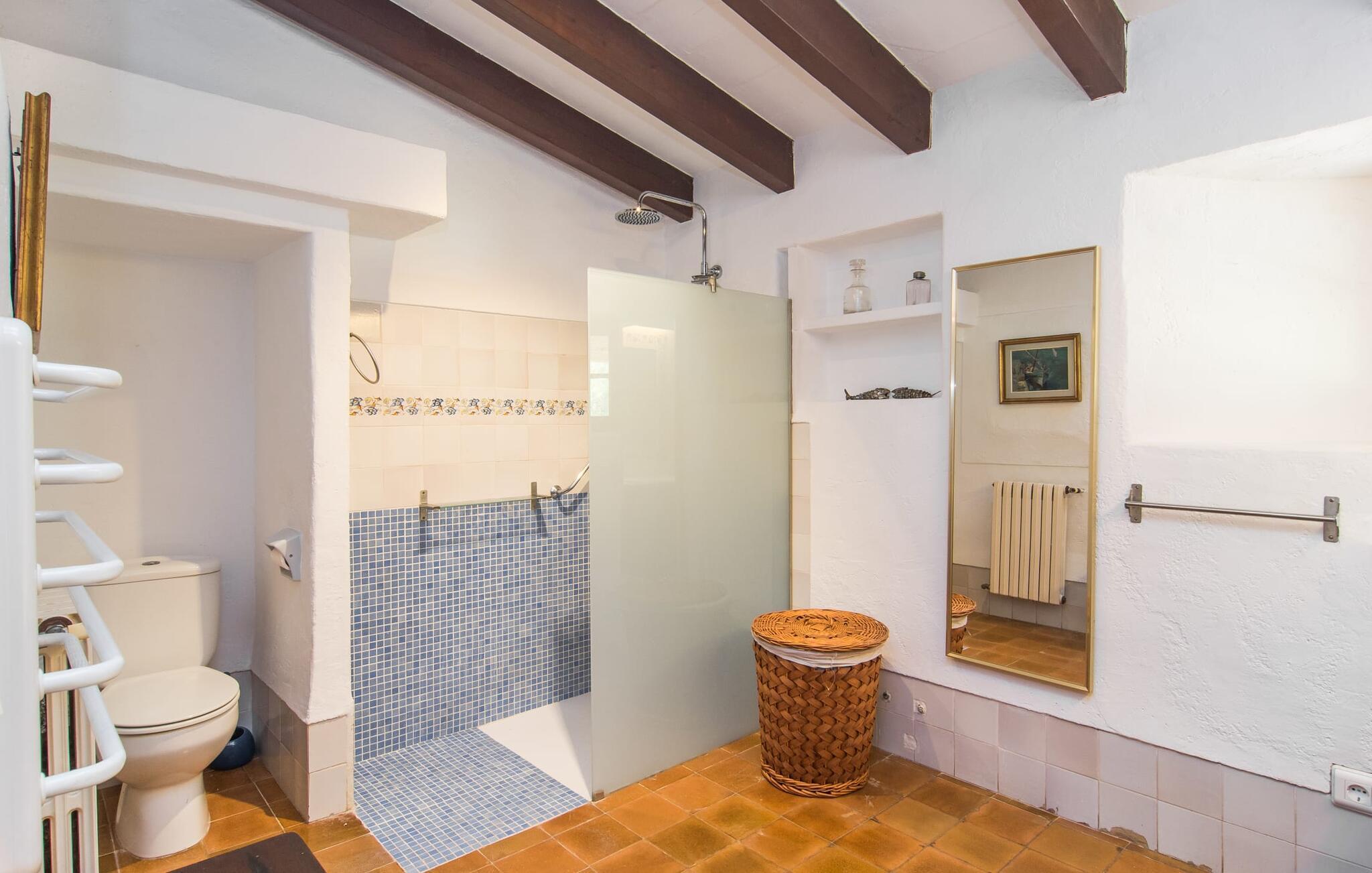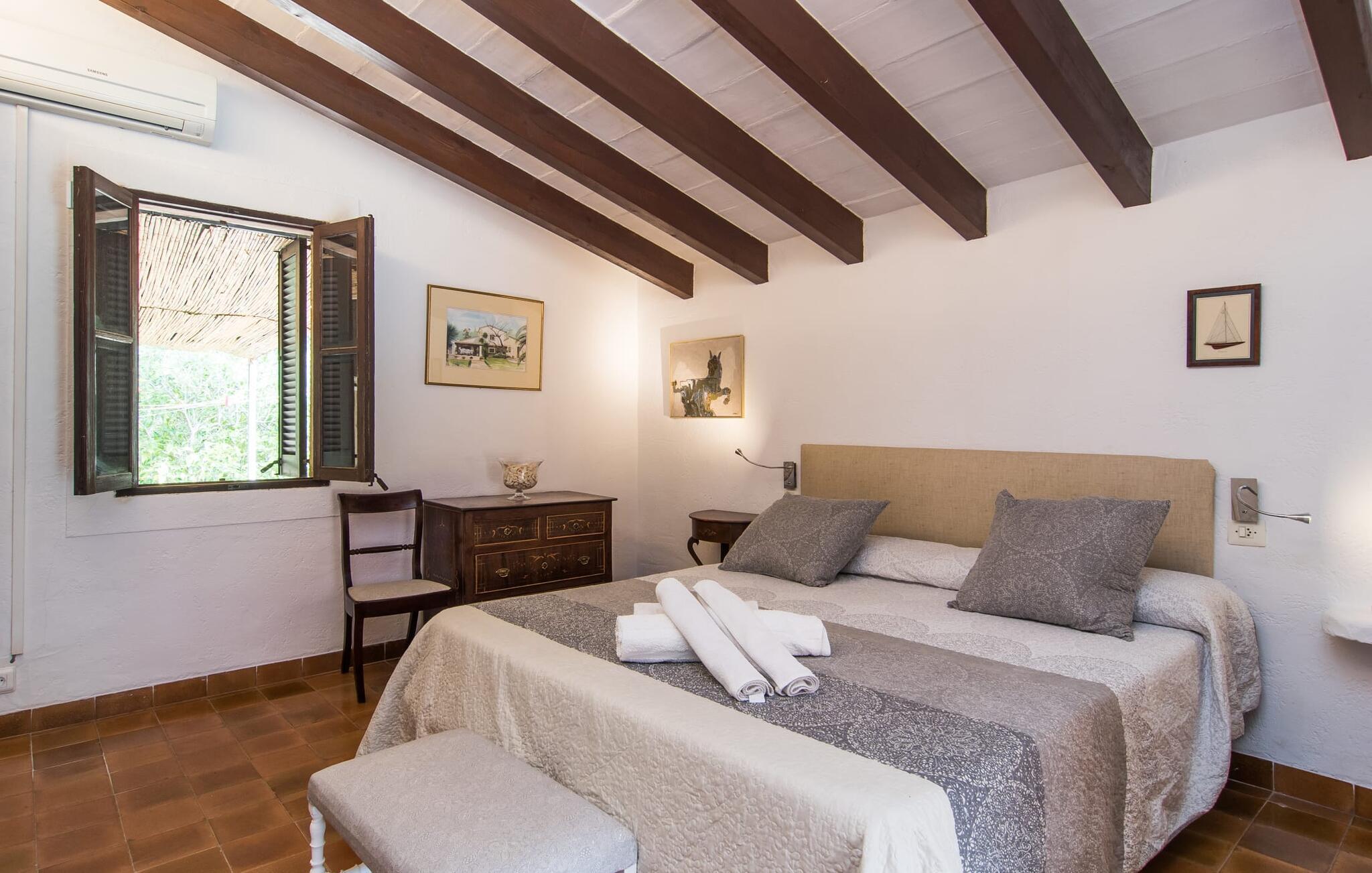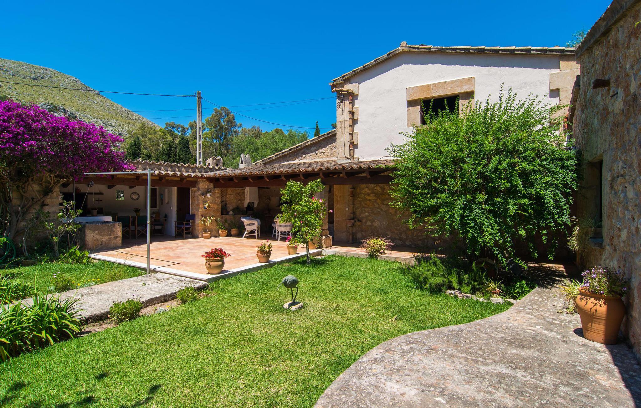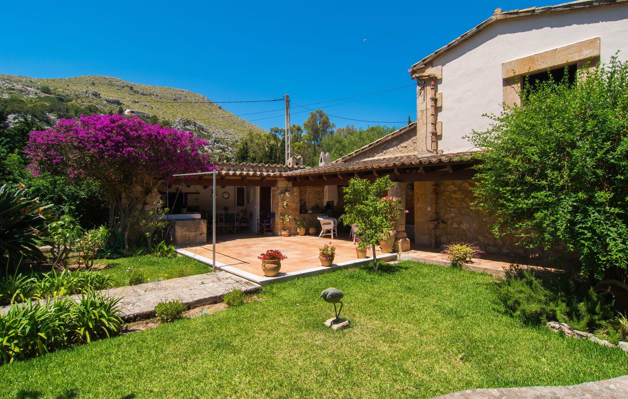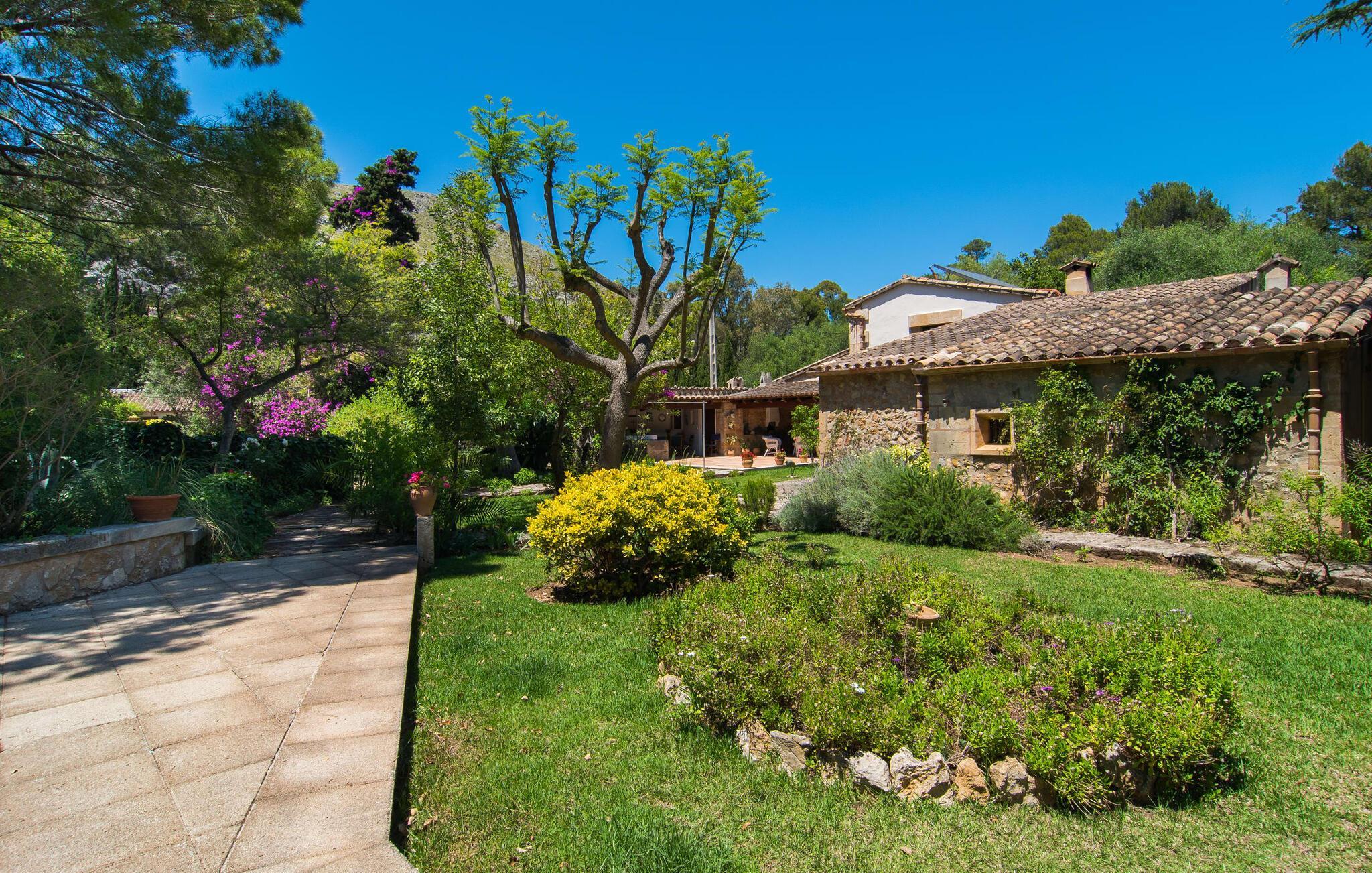 Wer einen echten Rückzugsort für rundum erholsame Ferien sucht, wird hier fündig! Auf einer Fläche von 2.000 m² mit wunderschönen Bäumen und Blumen finden Sie rund um dieses gemütliche Ferienhaus auf Mallorca echte Ruhe, ohne sich gleich an einem einsamen Ort wiederzufinden. Die hohen, abwechslungsreichen Bäume und Sträucher vermitteln ein einladendes Gefühl von Geborgenheit und natürlich angenehm luftigen Naturschatten. Gepflasterte Wege führen zu den verschiedenen hübschen Plätzen, darunter zum flachen Pool, der bequem über eine römische Treppe erreichbar ist, und zur umliegenden Terrasse, wo bequeme Liegestühle auf Sonnenanbeter warten. Ein überdachter Bereich nebenan lädt zum Entspannen im Schatten ein, während Sie die Kinder im Auge behalten, die vielleicht herumplanschen. Auch die Tischtennisplatte für das Match zwischendurch steht hier im Schatten – Abkühlung verspricht die praktische Außendusche. Mehrere überdachte Bereiche direkt am Haus bieten zusätzliche, rustikale Sitzgelegenheiten zum Entspannen oder gemeinsamen Essen, zum Beispiel am Grill, der abends in der Außenküche angeheizt werden darf und auf dem mediterrane Köstlichkeiten schmoren.