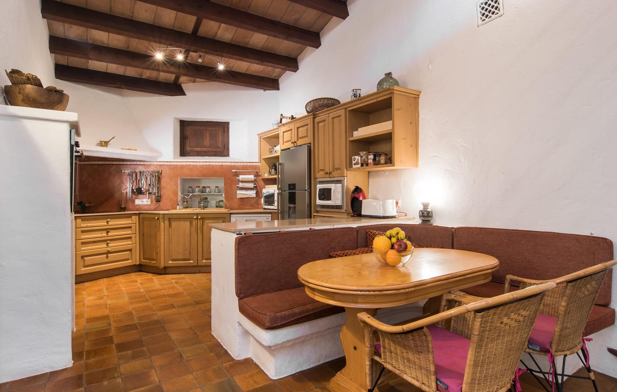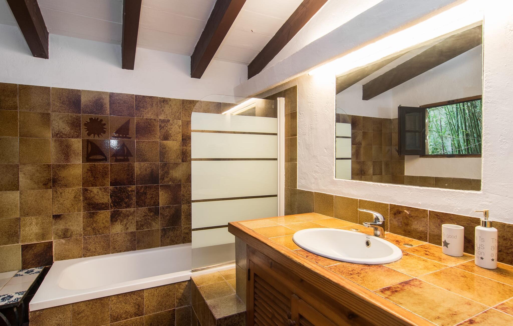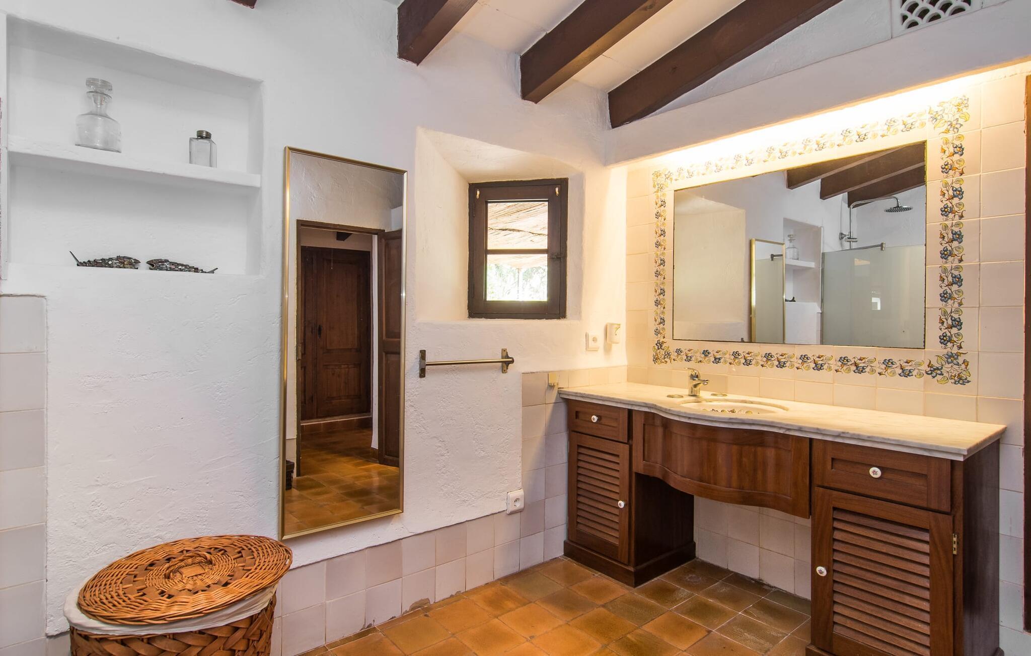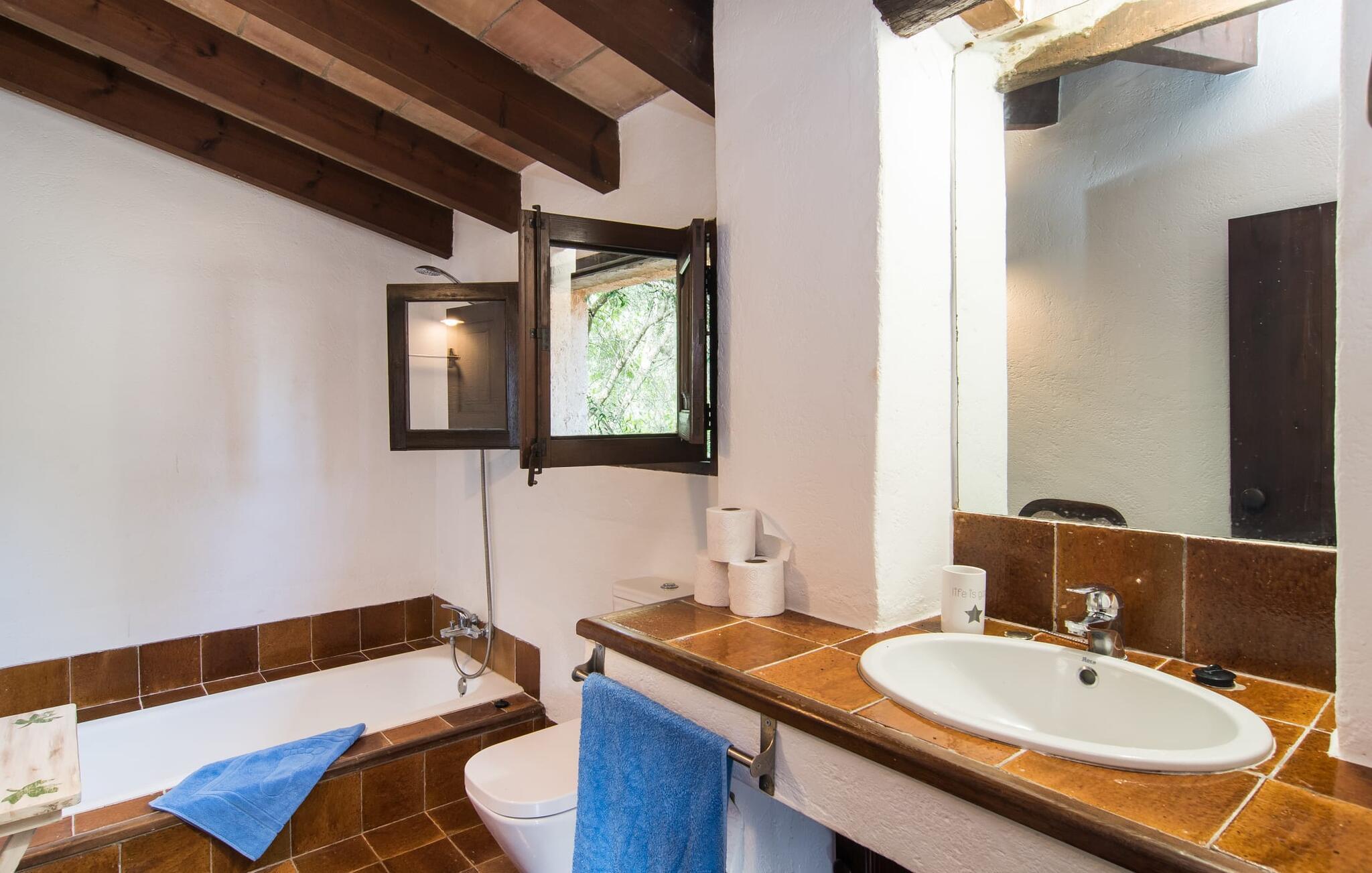 Wer einen echten Rückzugsort für rundum erholsame Ferien sucht, wird hier fündig! Auf einer Fläche von 2.000 m² mit wunderschönen Bäumen und Blumen finden Sie rund um dieses gemütliche Ferienhaus auf Mallorca echte Ruhe, ohne sich gleich an einem einsamen Ort wiederzufinden. Die hohen, abwechslungsreichen Bäume und Sträucher vermitteln ein einladendes Gefühl von Geborgenheit und natürlich angenehm luftigen Naturschatten. Gepflasterte Wege führen zu den verschiedenen hübschen Plätzen, darunter zum flachen Pool, der bequem über eine römische Treppe erreichbar ist, und zur umliegenden Terrasse, wo bequeme Liegestühle auf Sonnenanbeter warten. Ein überdachter Bereich nebenan lädt zum Entspannen im Schatten ein, während Sie die Kinder im Auge behalten, die vielleicht herumplanschen. Auch die Tischtennisplatte für das Match zwischendurch steht hier im Schatten – Abkühlung verspricht die praktische Außendusche. Mehrere überdachte Bereiche direkt am Haus bieten zusätzliche, rustikale Sitzgelegenheiten zum Entspannen oder gemeinsamen Essen, zum Beispiel am Grill, der abends in der Außenküche angeheizt werden darf und auf dem mediterrane Köstlichkeiten schmoren.