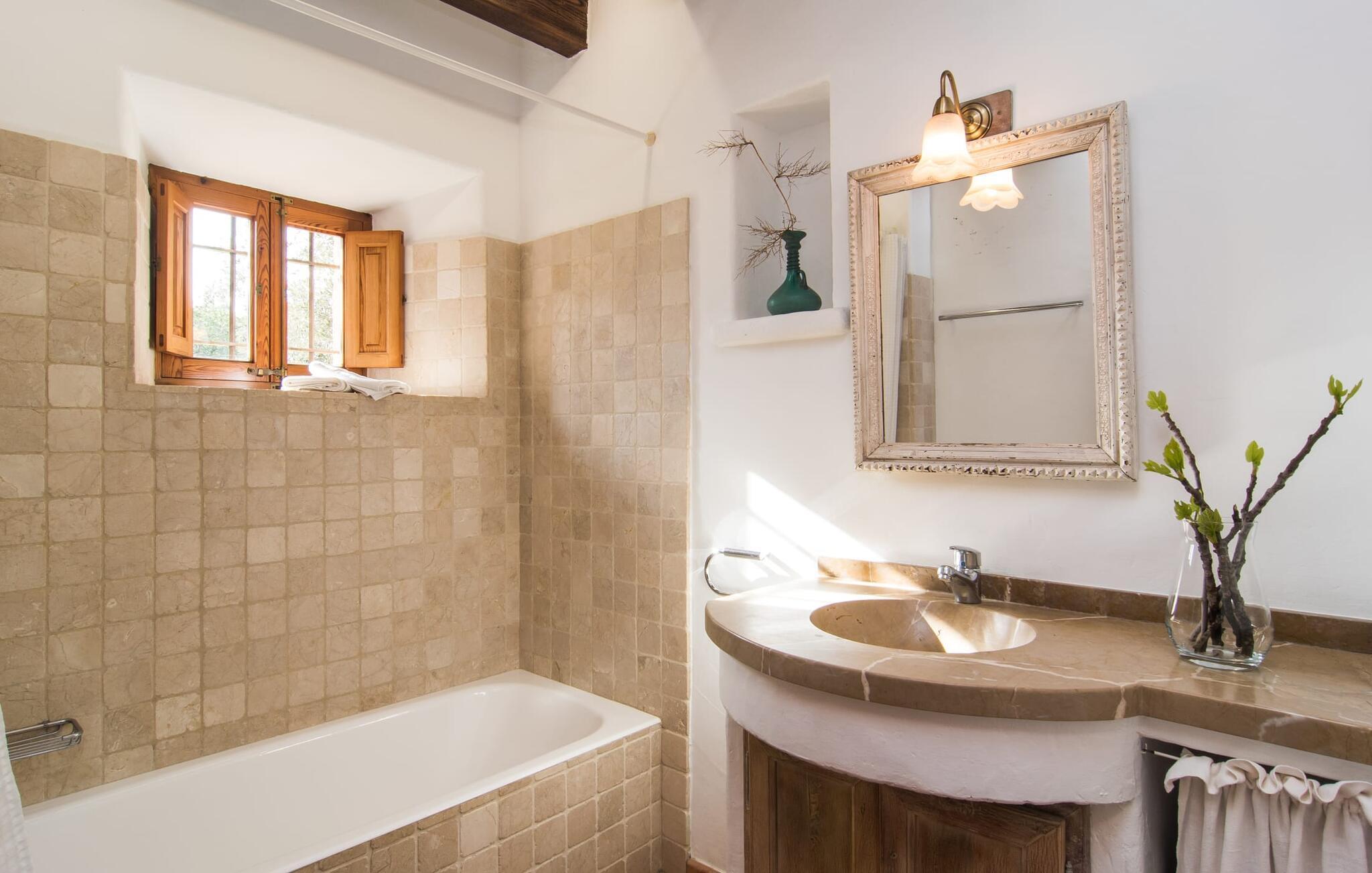 Dieses Bauernhaus im Norden Mallorcas ist ein wahres Juwel und wartet auf bis zu acht Urlauber, die eine schöne Zeit in ruhiger Atmosphäre verbringen möchten. Die Umgebung könnte malerischer kaum sein: In der Ferne das imposante Tramuntana-Gebirge, rund um das Grundstück eine grüne Ebene mit Wiesen, Feldern und vielen alten Bäumen – Idylle pur! Dies setzt sich harmonisch auf dem mit Steinmauern und Hecken dekorativ umschlossenen Finca-eigenen Grundstück fort: Hier wechseln sich Rasenflächen und Terrassenflächen ab, mediterrane Pflanzen beleben das Gesamtbild gelungen. Angenehm nah am Haus lädt der Pool, der sehr bequem über eine römische Treppe zu erreichen ist, zum Abkühlen, Planschen und Schwimmen ein und selbstverständlich gibt es eine praktische Außendusche. Zum Sonnenbaden stehen bequeme Sonnenliegen zur Verfügung – und zum Sitzen steht die überdachte Terrasse mit Loungebereich und Esstisch mit Blick auf den Poolbereich, den Garten und die Bergkulisse zur Verfügung. Auf der gegenüberliegenden Seite des Hauses bietet ein weiterer großer Terrassenbereich die Möglichkeit, unter freiem Himmel zu sitzen oder die wunderbaren Möglichkeiten der Außenküche zu nutzen, um Ihre Urlaubsköstlichkeiten im Freien zuzubereiten und zu genießen.