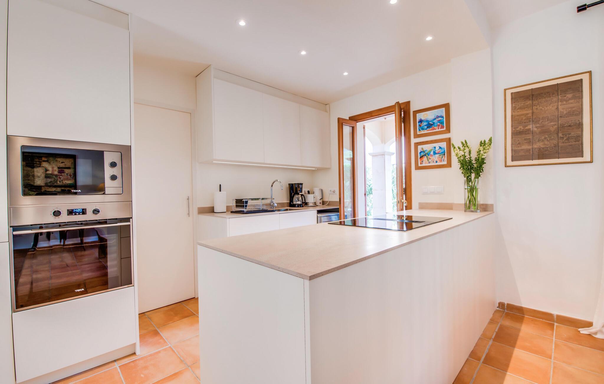 Von der Holzterrasse führt eine Doppeltür direkt in das Esszimmer mit einer neuen, voll ausgestatteten offenen Küche und einem Wohnzimmer, wo Sie viel Komfort in einem sehr stilvollen Interieur finden, um Ihre Momente drinnen zu genießen. Der Innenraum besteht aus einzigartigen, hochwertigen Möbeln. Die hellen Farben sorgen für eine wunderbar entspannte Atmosphäre. Ein schickes Badezimmer rundet den Raum im Erdgeschoss ab. Im ersten Stock finden Sie zwei sehr hübsche und geräumige Schlafzimmer mit Holzbalkendecken und herrlicher Aussicht. Ein Schlafzimmer verfügt über eine große Terrasse auf der Rückseite des Hauses mit herrlicher Aussicht auf die Berge und den Pool. Das geräumige zweite Badezimmer ist mit Dusche, Badewanne und Bidet ausgestattet und befindet sich auf dieser Etage. Die Villa „Can Petit Estel“ ist ein wahres Juwel für alle, die Stil und Komfort mögen und liegt in einer ruhigen, exklusiven Gegend, die auch einfachen Zugang zu Restaurants, Märkten und Einkaufsmöglichkeiten sowie atemberaubenden Spaziergängen und Golfplätzen bietet. Die moderne Doppelhaushälfte mit zwei Schlafzimmern befindet sich in einem kleinen Komplex aus 8 Villen im atemberaubend malerischen Dorf Betlem, einem versteckten Juwel am östlichen Ende der Bucht von Alcudia, mit Blick auf die Berge und umgeben von einem Naturschutzgebiet mit fantastischen Wanderwegen und Wanderwege und nur 250 m vom Meer entfernt. Die zerklüftete Küste verfügt über zahlreiche felsige Buchten und weiße Sandstrände, die durch mehrere beliebte Golfplätze hervorgehoben werden. 3 km entlang der Küste liegt Colonia de Sant Pere mit einer Promenade, einem Yachthafen, einer großen Auswahl an Restaurants, Banken, kleinen Supermärkten und einer Apotheke.