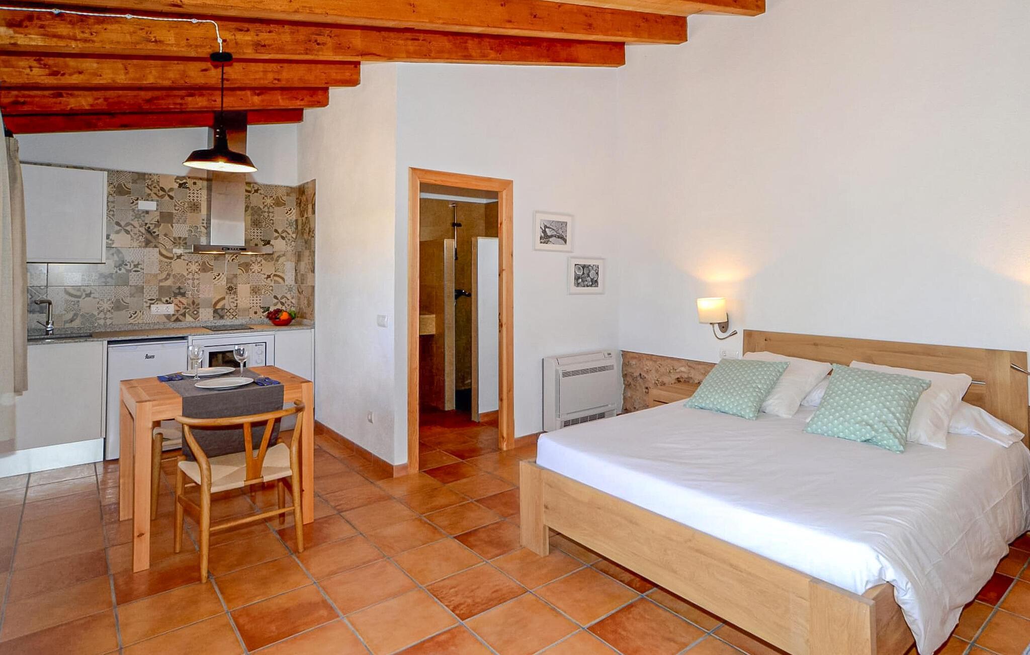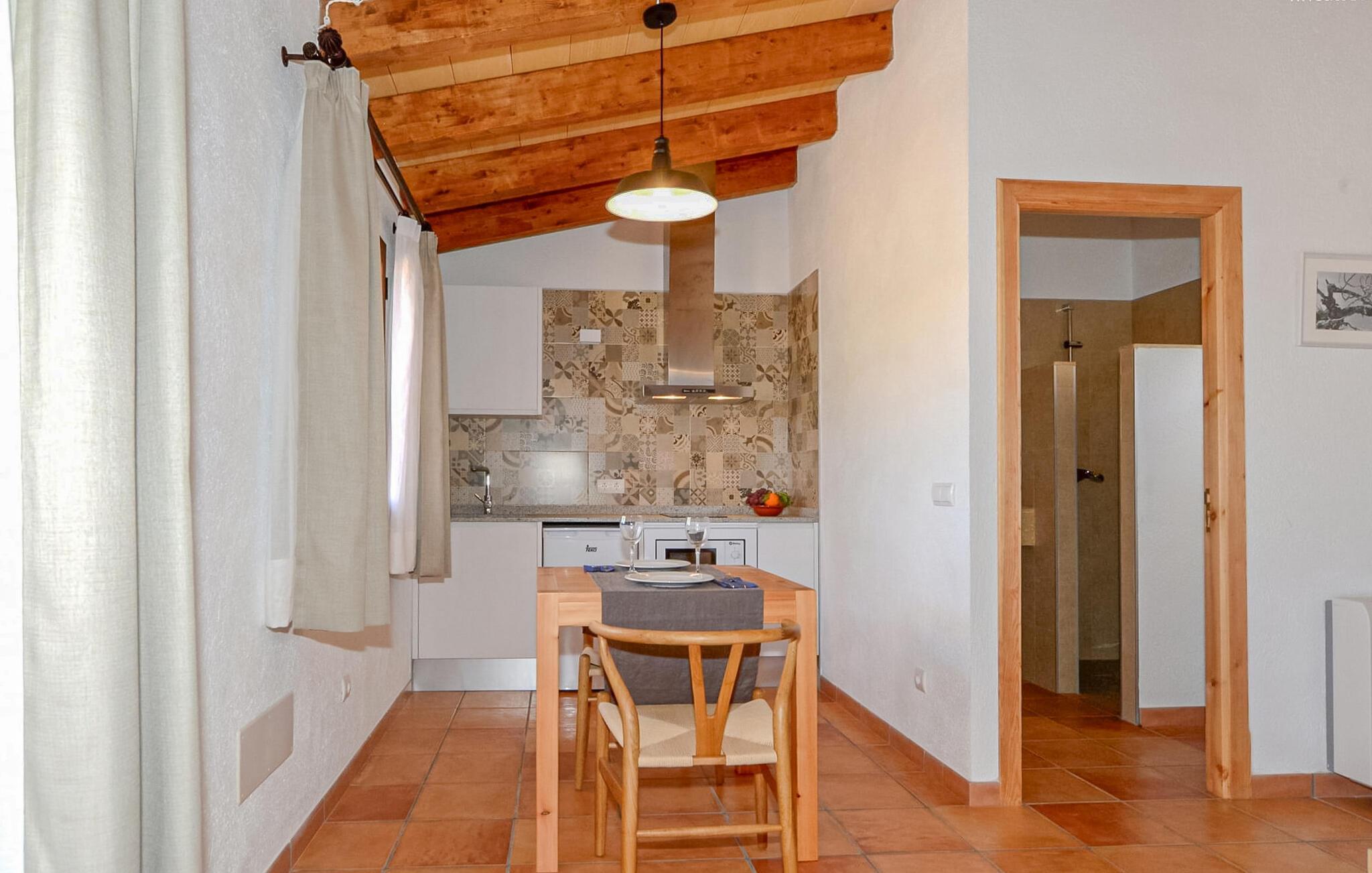 Das 30 m² große Studio-Apartment "Can Porreti El Colomer" sorgt mit weißen Wänden, Naturstein und spanischen Fliesen für ein gemütliches Ambiente. Es verfügt über ein Doppelbett, ein Badezimmer mit Dusche, eine Küchenzeile und eine gemütliche Sitzecke. Klimaanlage, WLAN und ein Flachbildfernseher verschönern Ihren Aufenthalt. Ein herrlicher Gemeinschaftsraum mit Holzofen lädt zu Zusammenkünften ein, und das Frühstück ist inbegriffen.
