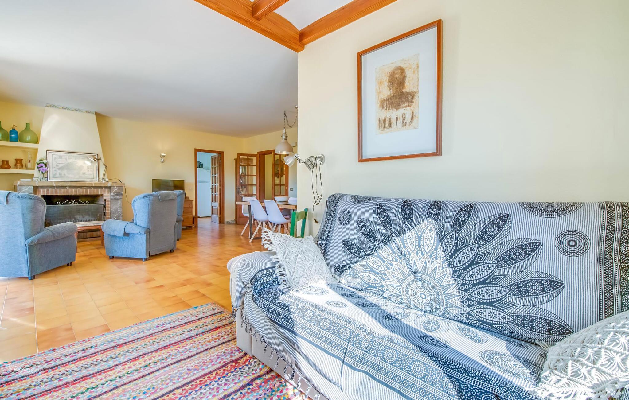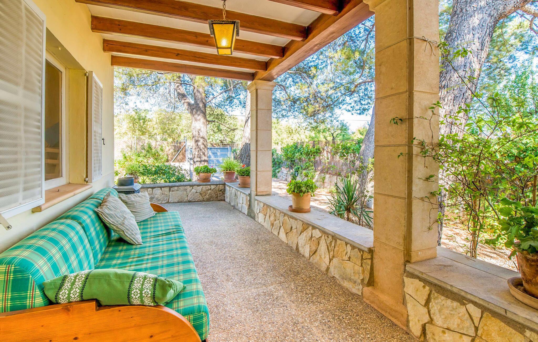Das alte, teilweise renovierte, einstöckige Gebäude verfügt auf einer Gesamtfläche von 160 m² über einen Flur, einen Wohnbereich, eine Küche, zwei Schlafzimmer und zwei Badezimmer, eines davon en-suite. Zu einem der Schlafzimmer gelangt man über ein paar Stufen, die nach unten führen. Die Schlafzimmer sind individuell und gemütlich eingerichtet und sollen einen angenehmen Rahmen für eine erholsame Nachtruhe schaffen. Im kombinierten Wohn-/Esszimmer laden die schönen karierten Sessel zum Entspannen ein und an kühleren Abenden sorgt der Kamin für zusätzliche Wärme und zusätzliche Gemütlichkeit. Wenn Sie doch drinnen essen möchten, gibt es im Wohnzimmer einen schönen freistehenden Holztisch. Auf der bequemen Couch können Sie die schöne Aussicht auf das Tramuntana-Gebirge genießen und dabei ein gutes Buch aus der kleinen Bibliothek lesen. Die Küche ist bestens für die Befriedigung Ihres täglichen Bedarfs geeignet und bietet vom Wasserkocher bis zur Filterkaffeemaschine alles. Die Badezimmer sind sowohl funktional ausgestattet als auch freundlich gestaltet. Ein Bügeleisen und ein Haartrockner sind vorhanden und können von den Gästen selbstverständlich genutzt werden.