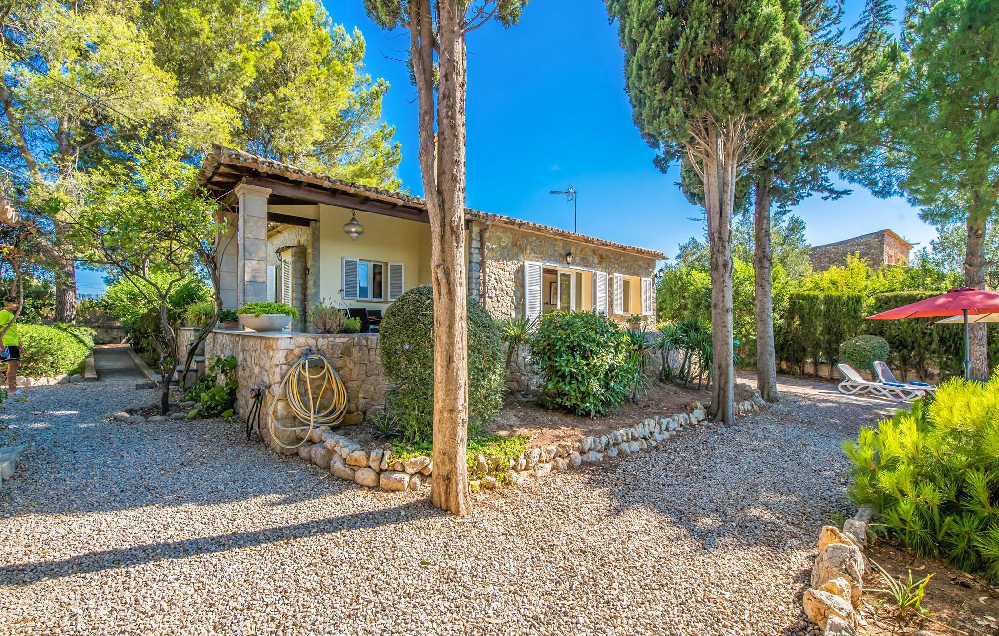 Die Villa „Can Reure“ liegt genau zwischen Mancor de la Vall und Inca; Beide Orte erreichen Sie mit dem Auto in nur fünf Minuten. Auf dem rustikalen, 2.500 m² großen Grundstück finden Sie zahlreiche Mandelbäume, die für einen Hauch typisch mallorquinischen Flairs sorgen und gleichzeitig dem Außenbereich eine gewisse Gemütlichkeit verleihen. Kleine Hecken, Mauern und die große Menge an Natursteinen und Kieselsteinen fügen sich harmonisch ein und unterstreichen dieses Ambiente zusätzlich. Das Herzstück des Außenbereichs ist der Pool, der über eine halbrunde Treppe bequem zu erreichen ist und an heißen Tagen für unvergleichliche Erfrischung sorgt. Auf den Liegestühlen können Sie ausgiebig entspannen und die mediterrane Sonne so richtig genießen. Für den Fall, dass die UV-Strahlung zu stark wird, steht Ihnen ein Sonnenschirm zur Verfügung. Natürlich können Sie auch einige Zeit in einem der luftigen, natürlich schattigen Bereiche verbringen, die hier und da auftauchen. Von der Poolterrasse direkt vor dem Haus kann man den herrlichen Blick auf die Berge so richtig genießen und genießen. Der überdachte Grillplatz eignet sich perfekt für kulinarische Abende am Grill, während Sie als Gruppe zusammen sind.