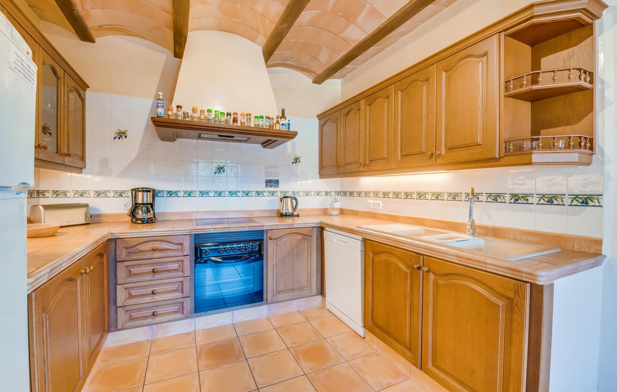Im Inneren ist die Villa hell und luftig, mit großen Fenstern. Das Wohnzimmer mit Kamin und Esstisch ist mit einer gut ausgestatteten Küche verbunden. Im Erdgeschoss befinden sich ein kleines Badezimmer und ein Schlafzimmer mit einem Himmelbett und einem en-suite Whirlpool-Badezimmer. Im Obergeschoss befinden sich drei Doppelzimmer (zwei mit zwei Einzelbetten) und zwei en-suite Badezimmer. Zwei dieser Zimmer haben zudem Zugang zu einem großzügigen Balkon mit Markise.