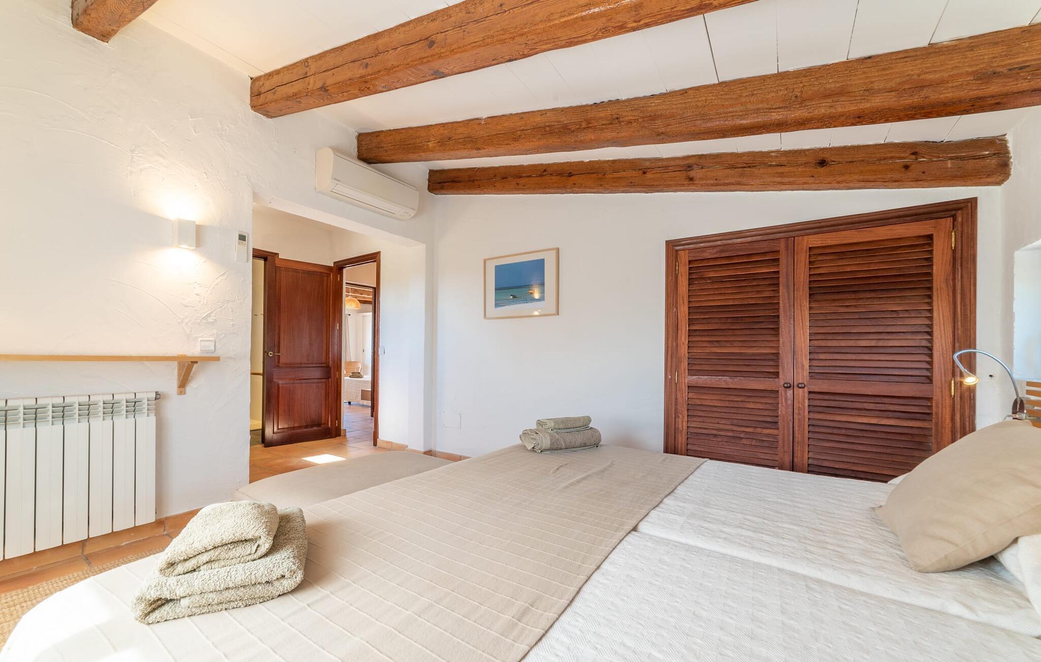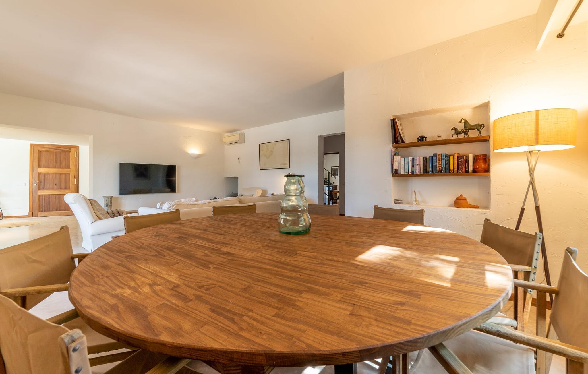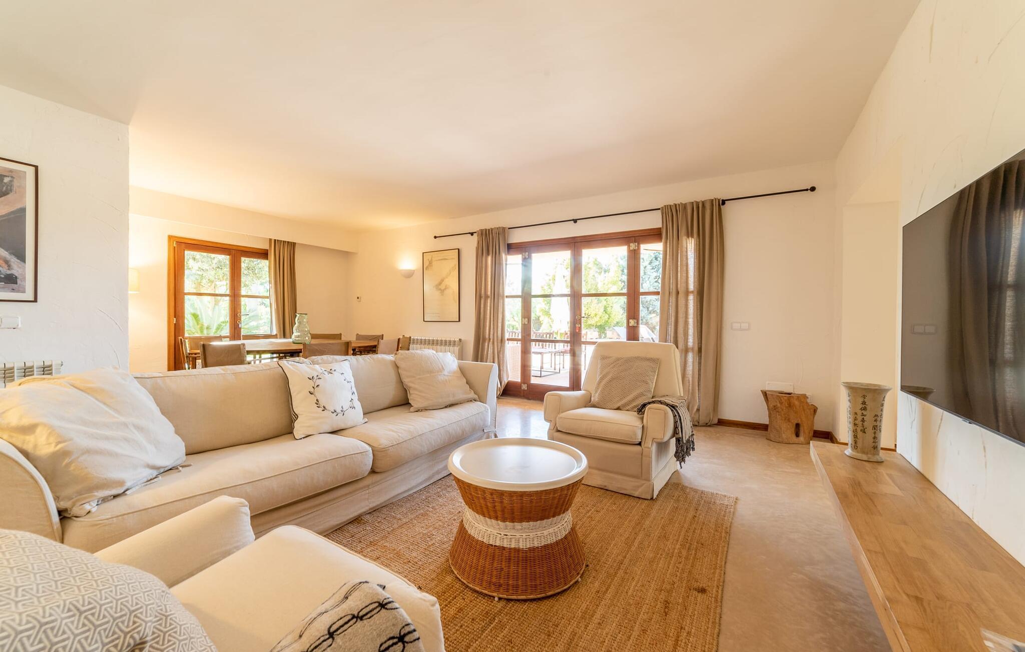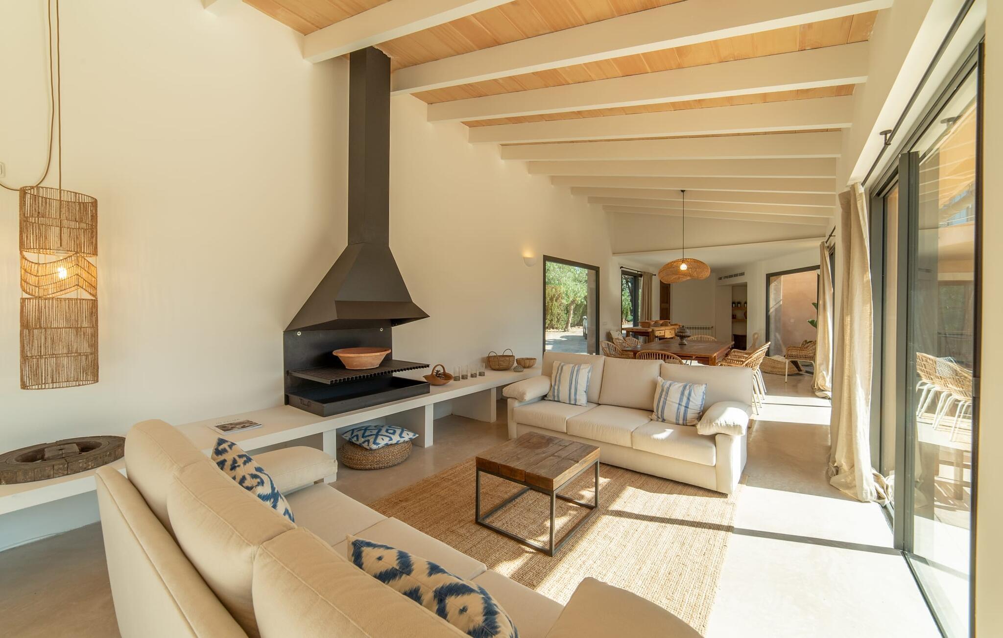 Ob Sie mit zwei oder drei Familien oder befreundeten Paaren reisen – die Finca „Can Riera d’Es Trenc“ ist einfach perfekt für bis zu zwölf Personen, gerade weil die Unterbringung im Haupthaus und im Poolhaus erfolgt. Vier Doppelzimmer befinden sich im „Mutterhaus“ und die anderen beiden im Nebengebäude. Besonders komfortabel ist, dass 5 der 6 Zimmer über ein eigenes Badezimmer verfügen, das zusammen mit einem weiteren Badezimmer insgesamt 6 komplette Waschbecken ergibt, sodass die Privatsphäre wunderbar gewahrt bleibt. Die mit viel Liebe zum Detail renovierten Badezimmer überzeugen durch individuelle Fliesen, bodentiefe Duschen, aufsehenerregende Waschbecken und allgemeinen modischen Chic. Auch in allen klimatisierten Schlafzimmern (!) herrscht ein einheitliches Farbkonzept. Es wirkt angenehm und nüchtern zeitlos, denn Weiß mit grauen und beigen Akzenten sorgt neben den Holzbalken und Türen für einen angenehmen Glanz. Das unbestreitbar warme Material Holz findet ohnehin seinen Zweck – wie im lichtdurchfluteten Wohnzimmer mit Kamin, der hellen Atmosphäre der Sofas und dem indirekten Lichtkonzept für ausnahmslose Behaglichkeit. Besonders gut sieht der Esstisch mit seiner dicken Holzplanke aus. Eine geräumige Küche im rustikalen und dennoch minimalistischen Stil mit Holzfronten. Eine gemütliche Sitzecke und die sanften Farben der Wände runden das Bild einer progressiven Landhausküche mit absolutem Komfort ab. Beide Bereiche sind so gestaltet, dass sich der Gast im angesagten Cottage-Stil wohlfühlt und sich im Urlaub wie zu Hause fühlt. Dies ist dem Eigentümer eindeutig gelungen. Von Zeit zu Zeit möchte man jedoch das Traumanwesen „Can Riera d'Es Trenc“ verlassen, um den wunderschönen Süden der Insel auf einfachen und unterhaltsamen Ausflügen zu erkunden und zu verstehen, die einen zum Besuch eines Polofeldes oder des Strandes führen können.