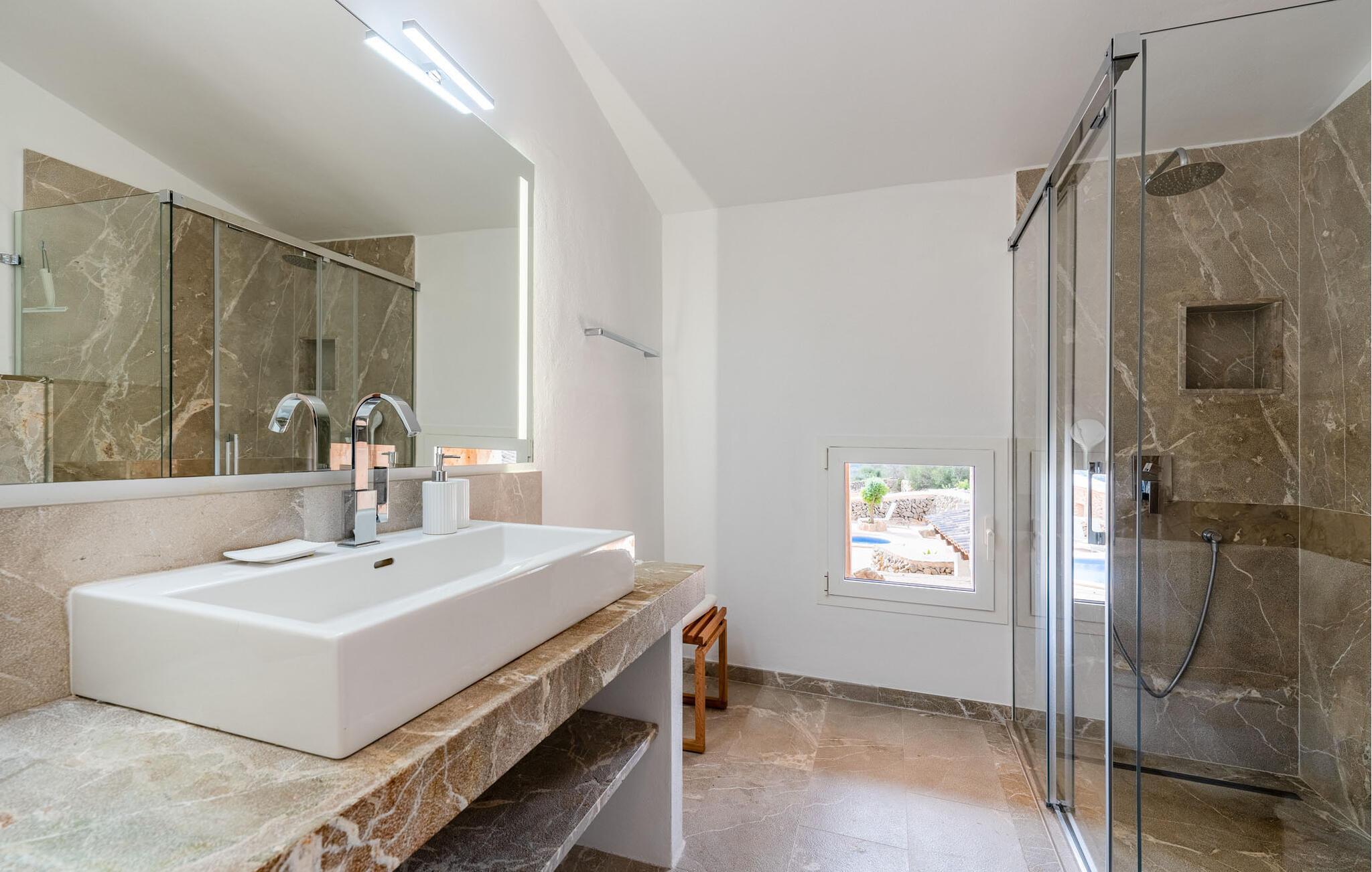 Das Innere des großzügig dimensionierten Gebäudes ist ein Paradebeispiel für den prestigeträchtigen „Rustic Moderno“-Stil. Die sonnendurchfluteten Räume verbinden klare Farben wie strahlendes Weiß, warme Cremetöne und rustikalen Bruchstein mit nachhaltigen Materialien wie Korbgeflecht, Holz und Stein in einer puristischen Symbiose. Gleichzeitig strahlen die Räume eine geradezu sanfte Intimität und Schlichtheit aus, die man das ganze Jahr über mit ein oder zwei Familien oder Freunden genießen kann. Stilsicher ausgewählte Möbel – wie die komplett ausgestattete, weiße Einbauküche im amerikanischen Stil mit einem eher puritanischen Holztisch – interpretieren das rustikale Bauernhaus mit Kamin neu. Der zweite gemauerte Kamin befindet sich im Wohnzimmer mit Chaiselongues und einer Lounge-ähnlichen Fernsehecke. Im Obergeschoss entdecken Sie einen weiteren TV-Bereich mit Sitzsäcken sowie drei der vier komfortablen Doppelzimmer – ausgestattet mit filigranen Dekoartikeln. Genießen Sie puren Badezimmerluxus mit einer begehbaren Duschwanne und zwei weiteren komplett ausgestatteten Badezimmern. Pur, klar und unkompliziert – so soll ein Urlaub sein. Die strahlend schöne Villa „Can Roig de Na Llatzer“ mit ihrem wunderschön gestalteten Garten und Außenbereich ist ein bezauberndes Paradies. Dieses perfekte Anwesen befindet sich in attraktiver und ruhiger Lage zwischen der Küste und Felanitx. Hier können Sie Ihre Einkäufe erledigen, sonntags können Sie aber auch den entspannten Sant Miquel-Markt besuchen. Die wunderschönen Calas de Mallorca, darunter die fjordähnliche Cala D'Or oder Cala Gran, sind nur 7 km entfernt.