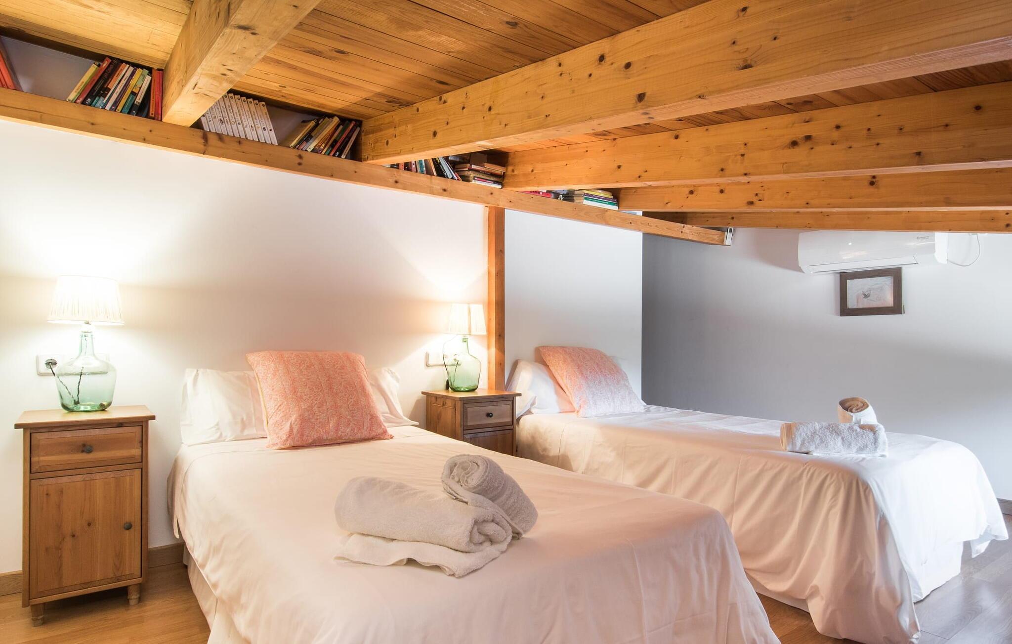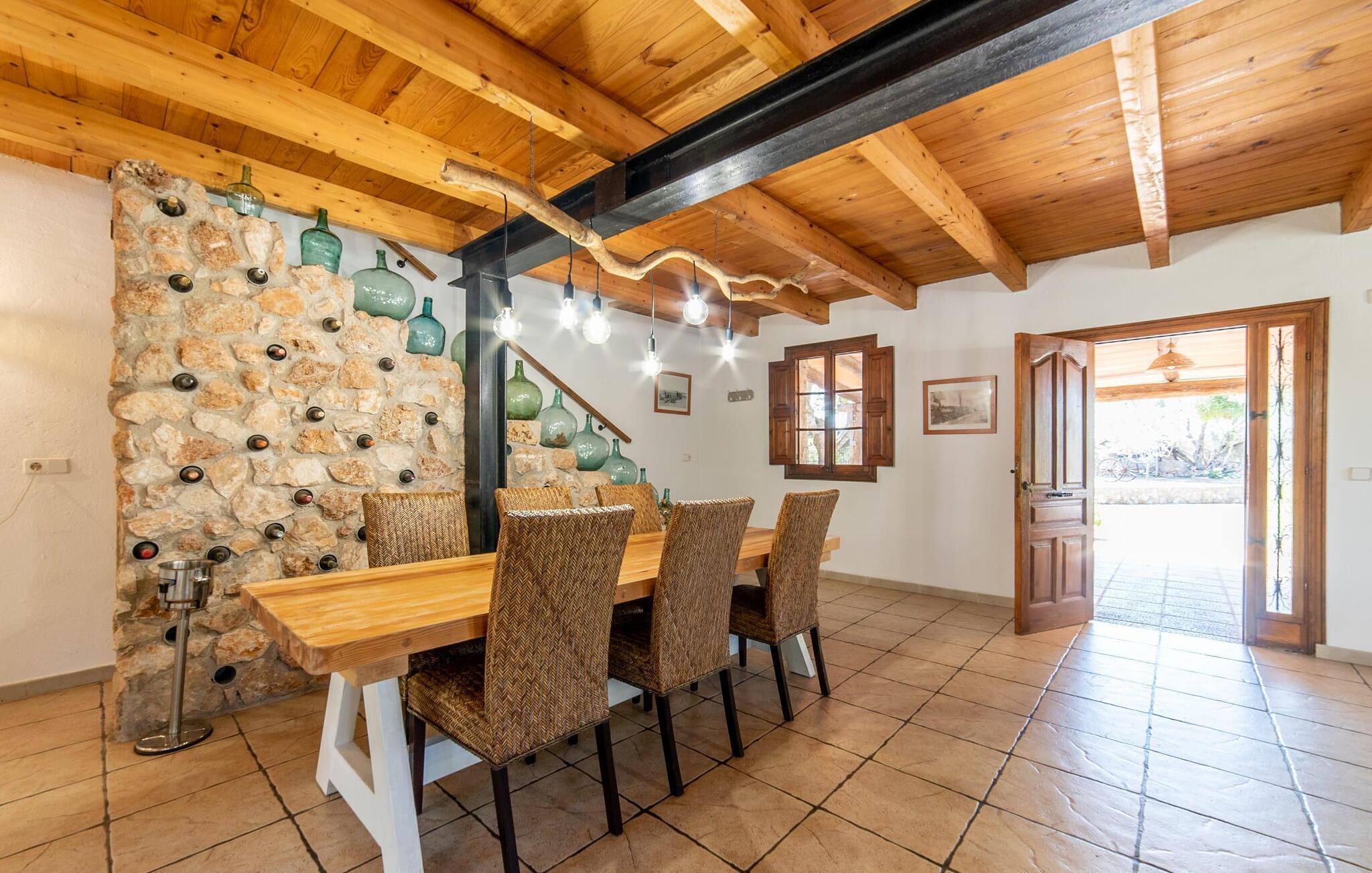 Das Innere des Hauses ist mit vielen originellen Details dekoriert und versprüht ein mallorquinisches, rustikales Ambiente. Eine Holzdecke mit abgesenkten Balken, dunkle Tür- und Fensterrahmen und terrakottafarbene Böden verleihen dem Erdgeschoss ein typisches Villengefühl. Zusammen mit der gepflegten, modernen Einrichtung bietet die Inneneinrichtung den idealen Rahmen für einen gelungenen Inselurlaub. Zu den Highlights dieser Immobilie gehört eine offene Küche im Landhausstil mit wunderschönem Mosaikboden, um einen Kamin angeordneten Sofaelementen und einem massiven Holztisch für Mahlzeiten oder Brettspielabende. Eine offene Holztreppe mit einer Backsteinumrandung, die gleichzeitig als Weinregal dient, führt in den ersten Stock. Wegen der dort abgestellten Flaschen ist beim Treppensteigen mit den kleinen Gästen Vorsicht geboten. Das Obergeschoss ist durch Diagonalen geprägt. Die drei hellen, funktionalen und gemütlichen Doppelzimmer widerlegen die Behauptung, dass Dachschrägen zu klassischen Problemzonen bei der Einrichtung führen. Hier wurden Nischen geschickt in offene Garderoben und Dachschrägen in Bibliotheken umgewandelt. Insgesamt drei Badezimmer, eines davon en-suite, runden das Innere der Villa ab.