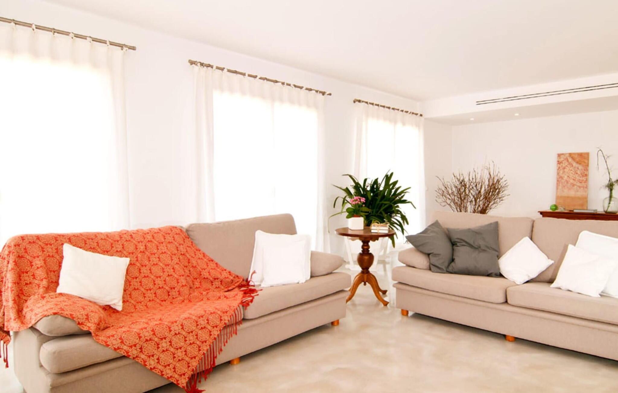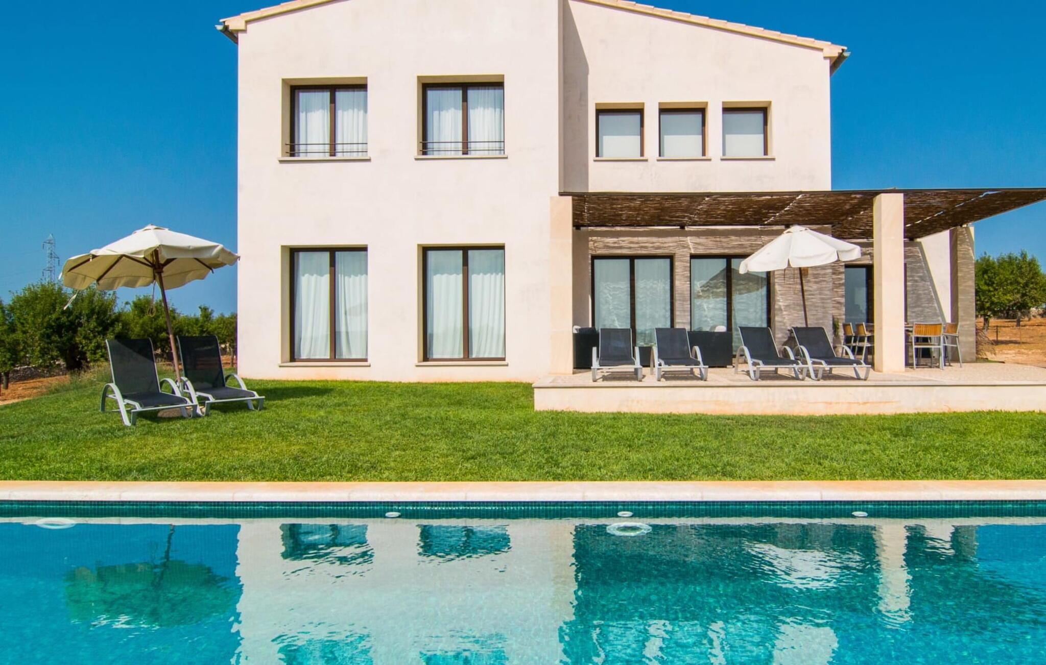 Die Wohnfläche der Villa beträgt 250 m² und erstreckt sich über 2 Etagen, wo Sie sich nach Herzenslust ausbreiten können. Die Räume sind durch bodentiefe Fenster lichtdurchflutet und die hellen, modernen Möbel unterstreichen den modernen Stil und die besonders angenehme Atmosphäre. Das gesamte Haus ist offen gestaltet, sodass der Wohn- und Essbereich im Erdgeschoss in die halboffene Küche übergeht. Die Küche verfügt über weiße Schränke und alle wichtigen Geräte (Geschirrspüler, Waschmaschine, Dunstabzugshaube, großer Kühlschrank). Der helle, glänzende Bodenbelag im Untergeschoss unterstreicht den hellen Charakter dieses Hauses. Im Erdgeschoss finden Sie Wohn-, Ess- und Küchenbereiche sowie ein praktisches Gäste-WC und zwei stilvolle Doppelzimmer mit eigenem Bad. Eine breite Treppe führt in das Obergeschoss. Im Obergeschoss befindet sich die große Suite mit Ankleidezimmer und eigenem Bad. Die Holzmöbel sind weiß, teilweise weiß getüncht, ebenso wie die schönen Landhaustüren. Das Bad verfügt über ausgewählte Möbel, wie ein rundes Waschbecken auf einer sandsteinfarbenen Marmorplatte. Genießen Sie von der privaten Terrasse auf dieser Ebene den atemberaubenden Blick über Mallorca bis zum Tramuntana-Gebirge. Im Obergeschoss befindet sich ein gemütliches Studio mit dem vierten Doppelzimmer. Besonders Kinder lieben dieses Studio, daher können wir Aufenthalte mit bis zu sechs Erwachsenen und zwei Kindern besonders empfehlen.