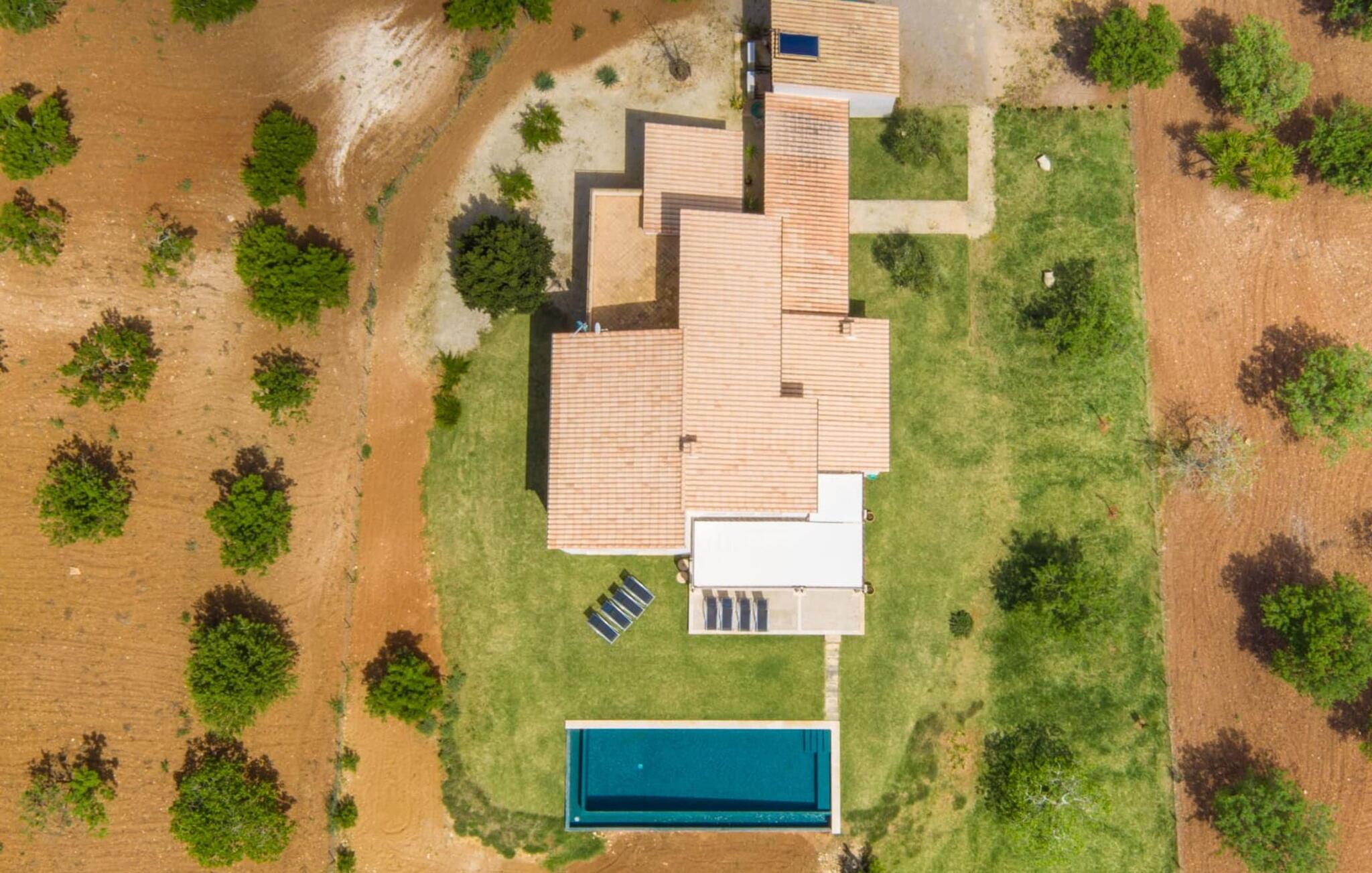 Das Haus ist das zentrale Element eines insgesamt 24.500 m² großen Grundstücks, das leicht erhöht über der umliegenden Landschaft liegt. Dieses Ferienhaus bietet zahlreiche Möglichkeiten, den schönen, gepflegten Garten und die 38 m² große Terrassenlandschaft zu genießen. Es verfügt über zahlreiche Lounge-Sitzgelegenheiten für Sonnenanbeter, einen ansprechenden Essbereich mit Holzmöbeln, einen angrenzenden Bereich zum Entspannen mit schwarzen Liegestühlen und Liegestühle für den Poolbereich, alle mit Sonnenschirmen für Schatten. Moderne, aber traditionell im mallorquinischen Stil gehaltene Schaukelstühle im überdachten Terrassenbereich laden zum Entspannen mit einem Buch ein. Abende lassen sich gemütlich unter freiem Himmel verbringen. Es genügt, dass jemand den Grill anzündet, um den Tag kulinarisch ausklingen zu lassen.