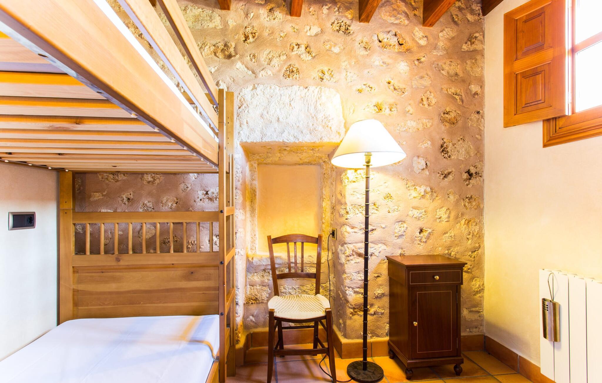 Im Erdgeschoss befindet sich außerdem ein Kinderzimmer mit zwei Doppelstockbetten. Besonders schön sind die Steinwände, die dem Raum das Aussehen einer edlen Unterkunft verleihen. Eines der Badezimmer mit Dusche befindet sich ebenfalls im Erdgeschoss. Die beiden weiteren Badezimmer, ebenfalls mit kunstvollen Steinarmaturen ausgestattet, befinden sich im Obergeschoss, wo sich auch zwei Schlafzimmer befinden. Das dritte Schlafzimmer im Dachgeschoss ist etwas Besonderes: Über die Treppe gelangt man über eine Holzbrücke auf eine offene Galerie – wer früh aufsteht, kann hier übernachten.