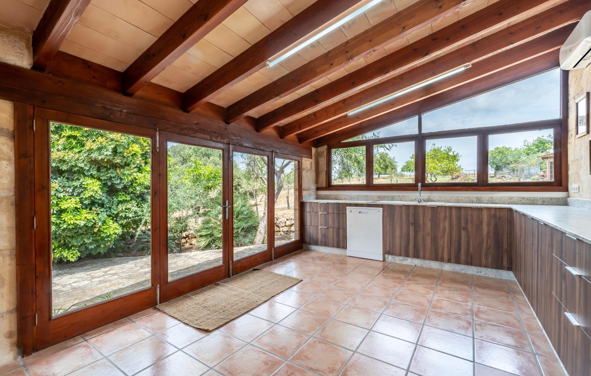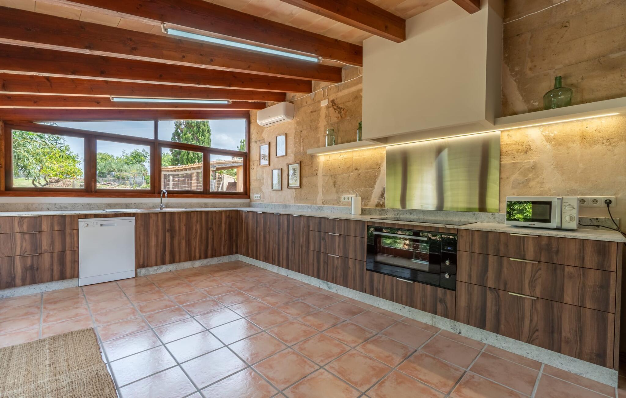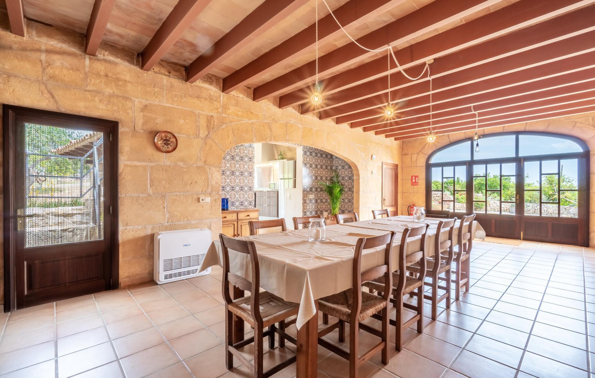 Der Wohnbereich mit großzügigen und geschmackvoll eingerichteten Räumen verteilt sich auf zwei Etagen. Der Eingangsbereich führt direkt in ein großes Esszimmer. Von hier aus führen ein paar Stufen hinunter in ein helles und gemütliches Wohnzimmer. Die Küche ist geräumig und dank der großen Fenster lichtdurchflutet. Darüber hinaus befinden sich im Erdgeschoss drei Schlafzimmer, eines davon mit eigenem Badezimmer. Über eine Treppe im Eingangsbereich gelangt man in das Obergeschoss mit drei weiteren großzügigen Schlafzimmern. Außerdem gibt es eine große Sonnenterrasse mit wunderschönem Ausblick auf die umliegende Landschaft. Das Ferienhaus „Can Setri“ genießt eine ruhige Lage inmitten der sanften Hügellandschaft zwischen Manacor (8 km) und Artà (17 km) im Osten Mallorcas. Kleinere Einkäufe können im 6 Autominuten entfernten Sant Llorenç des Cardassar getätigt werden. Die wunderschönen Sandstrände von Sa Coma, Porto Cristo und Cala Millor sind weniger als 20 Autominuten entfernt.
