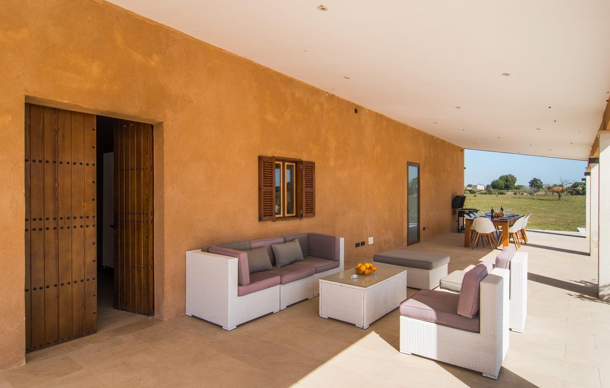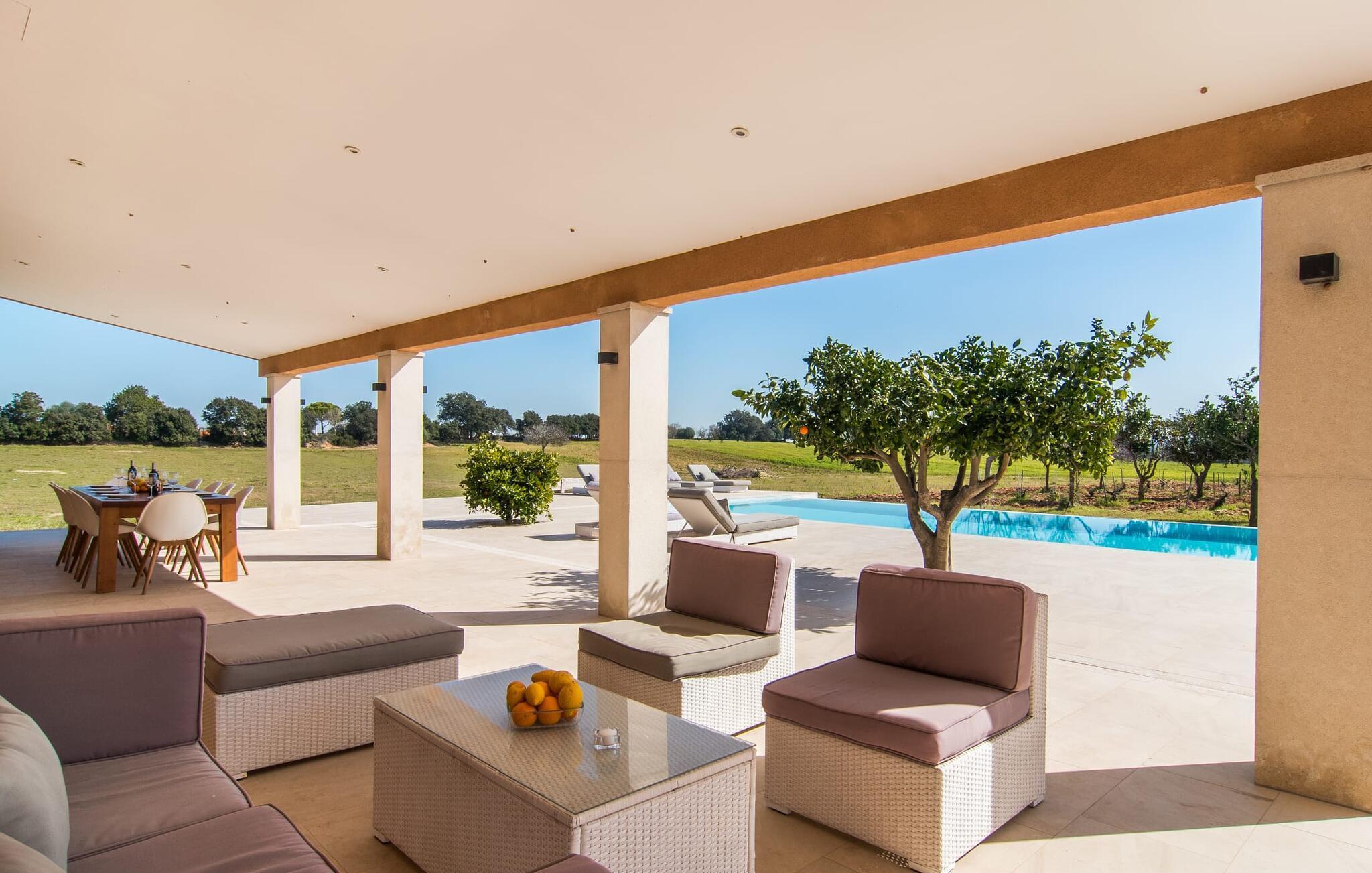 Ein Landhaus in Alleinlage, ausgestattet mit allen modernen Annehmlichkeiten, die man sich nur wünschen kann, wunderbar rustikal und zugleich außergewöhnlich stilvoll – die Villa „Can Tano“ bei Inca im Zentrum der Insel vereint diese vermeintlichen Gegensätze. Es liegt auf einem riesigen Anwesen inmitten der typisch mediterranen, grünen Landschaft Mallorcas, umgeben von weiten Feldern und Mandel-, Oliven- und Orangenbäumen, auf die Sie von der gepflasterten Sonnenterrasse aus einen herrlichen Ausblick genießen können. Mittelpunkt des gepflegten Außenbereichs ist eindeutig der große, beheizte Pool, der sich zum entspannten Faulenzen auf der Lilo genauso gut eignet wie für sportliche Workouts. Anschließend können Sie es sich für eine wohlverdiente Siesta auf einer der bequemen Sonnenliegen rund um den Pool gemütlich machen – besonders schön ist der Platz im Schatten eines der beiden hübschen Orangenbäume. Auch auf der überdachten Terrasse lässt es sich sehr angenehm sitzen, entweder auf den schicken Outdoor-Loungemöbeln oder am langen Holztisch mit Designerstühlen zum Essen.