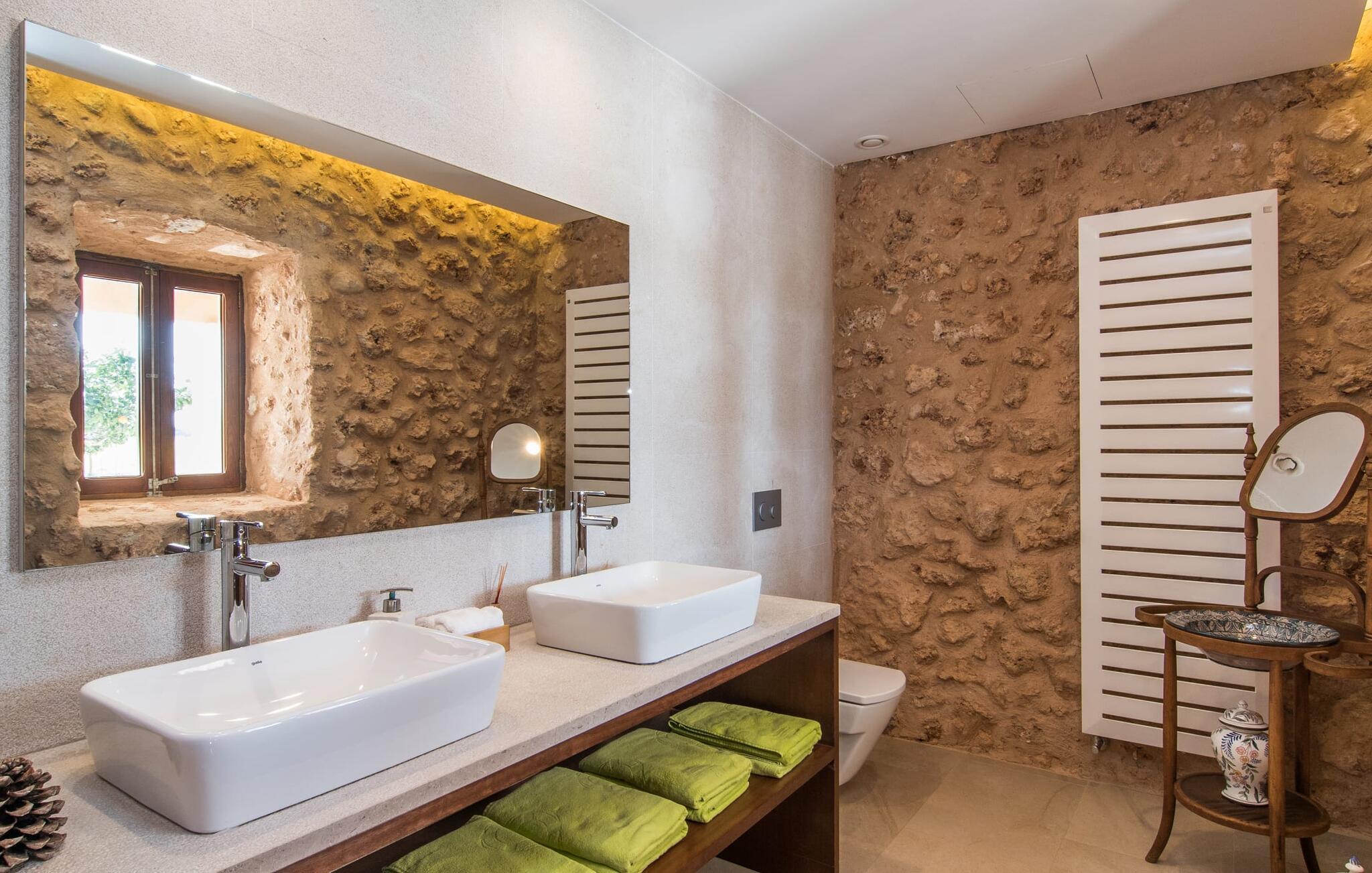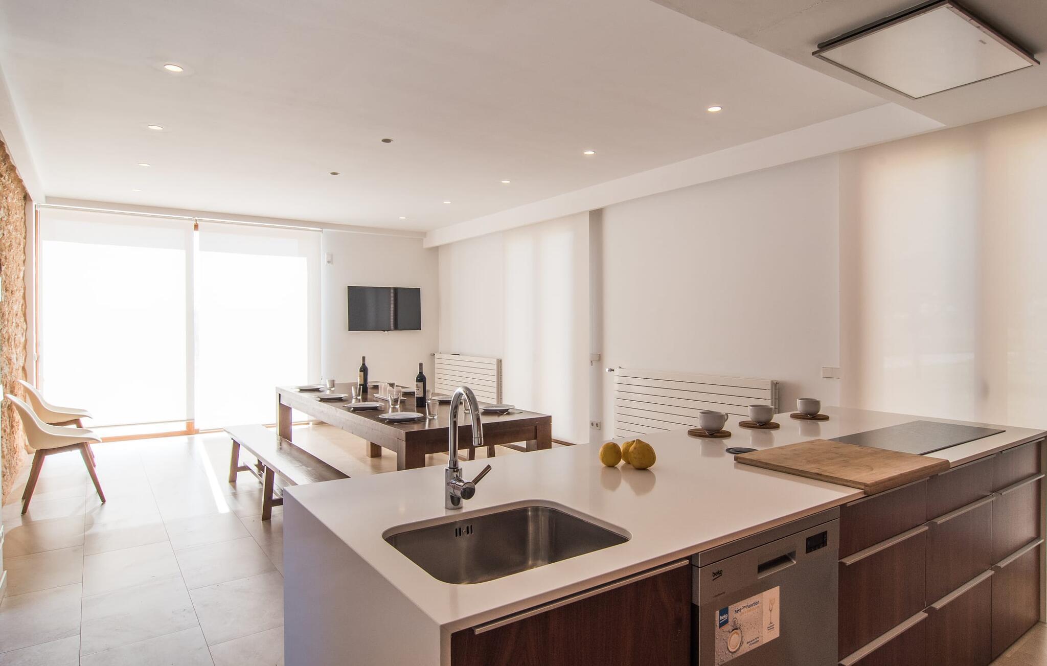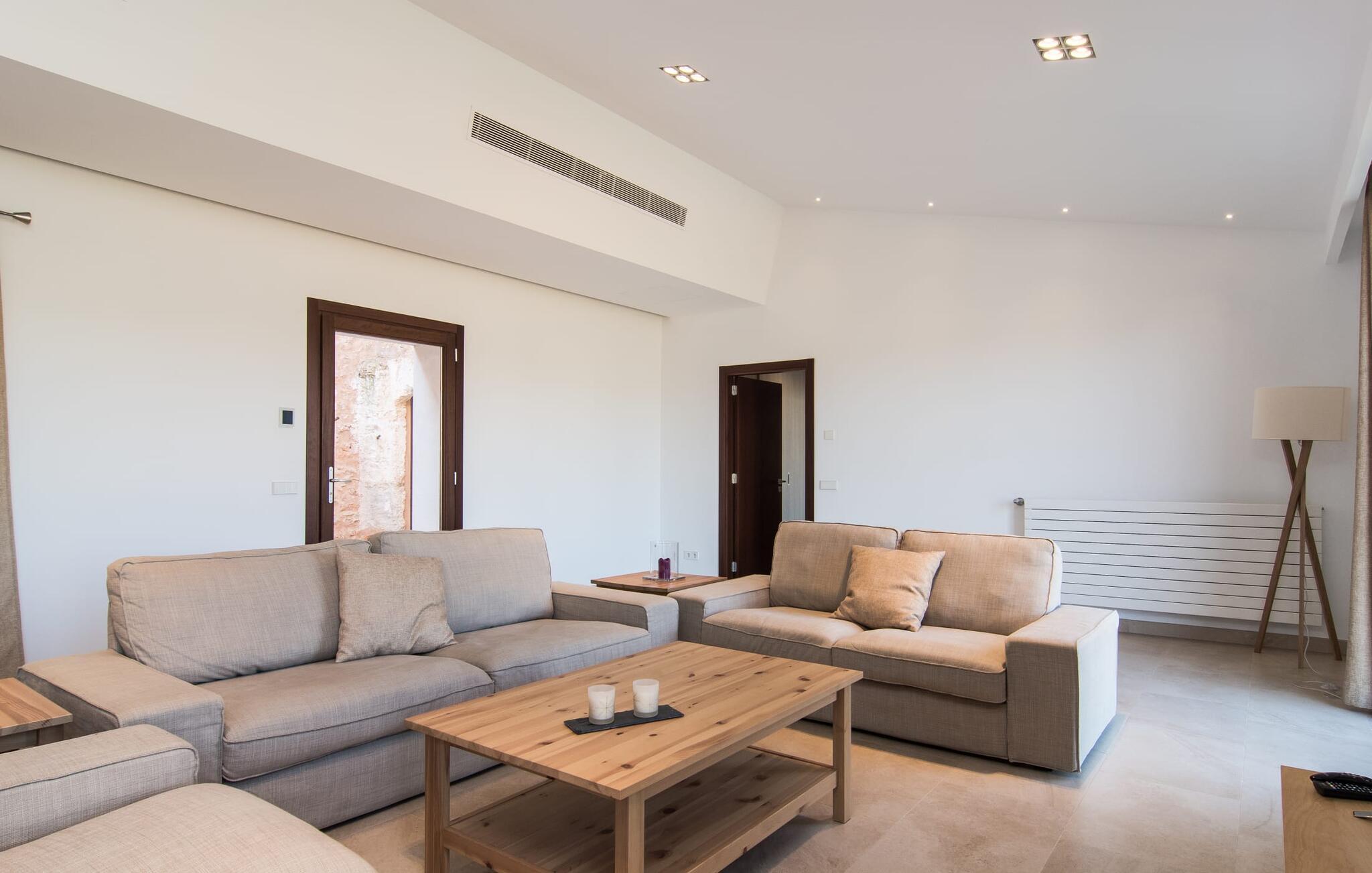 Das Interieur von „Can Tano“ lässt das Herz eines jeden Interior-Design-Liebhabers höher schlagen: Hier wurde aus den Ruinen eines alten Gebäudes etwas völlig Neues geschaffen – und geschickt damit gespielt. Puristisches Design trifft auf rustikale Natursteinwände, weiße Wände in Kombination mit großen Fenstern und geschickt platzierte Deckenspots lassen das Licht herein. Sowohl bei den Möbeln als auch bei den Zimmerdecken und einigen Einrichtungsgegenständen setzt Holz in verschiedenen Farbtönen Akzente, um Farbnuancen zu setzen. Eine Besonderheit ist der Innenhof, der durch alle Räume im Erdgeschoss – bis auf den Eingangsbereich mit dem Gäste-WC – separat zugänglich ist. Dazu gehören die stilvolle Küche mit Holzfronten und einer Theke in einem warmen Braunton, die Natursteinwand und hochwertige Geräte – vom großen Kühlschrank bis zum Einbaubackofen auf Augenhöhe. Im angrenzenden Essbereich lädt ein langer Tisch mit passenden Bänken zum Festessen ein. Nebenan finden Sie das großzügige Wohnzimmer mit drei gemütlichen Sofas, auf denen Sie es sich gemütlich machen können. Apropos Komfort: Diese Eigenschaft gilt auch für die insgesamt sechs dezent eingerichteten Doppelzimmer, davon fünf im Erdgeschoss und eines im Obergeschoss, alle mit eigenem Bad – Privatsphäre garantiert!