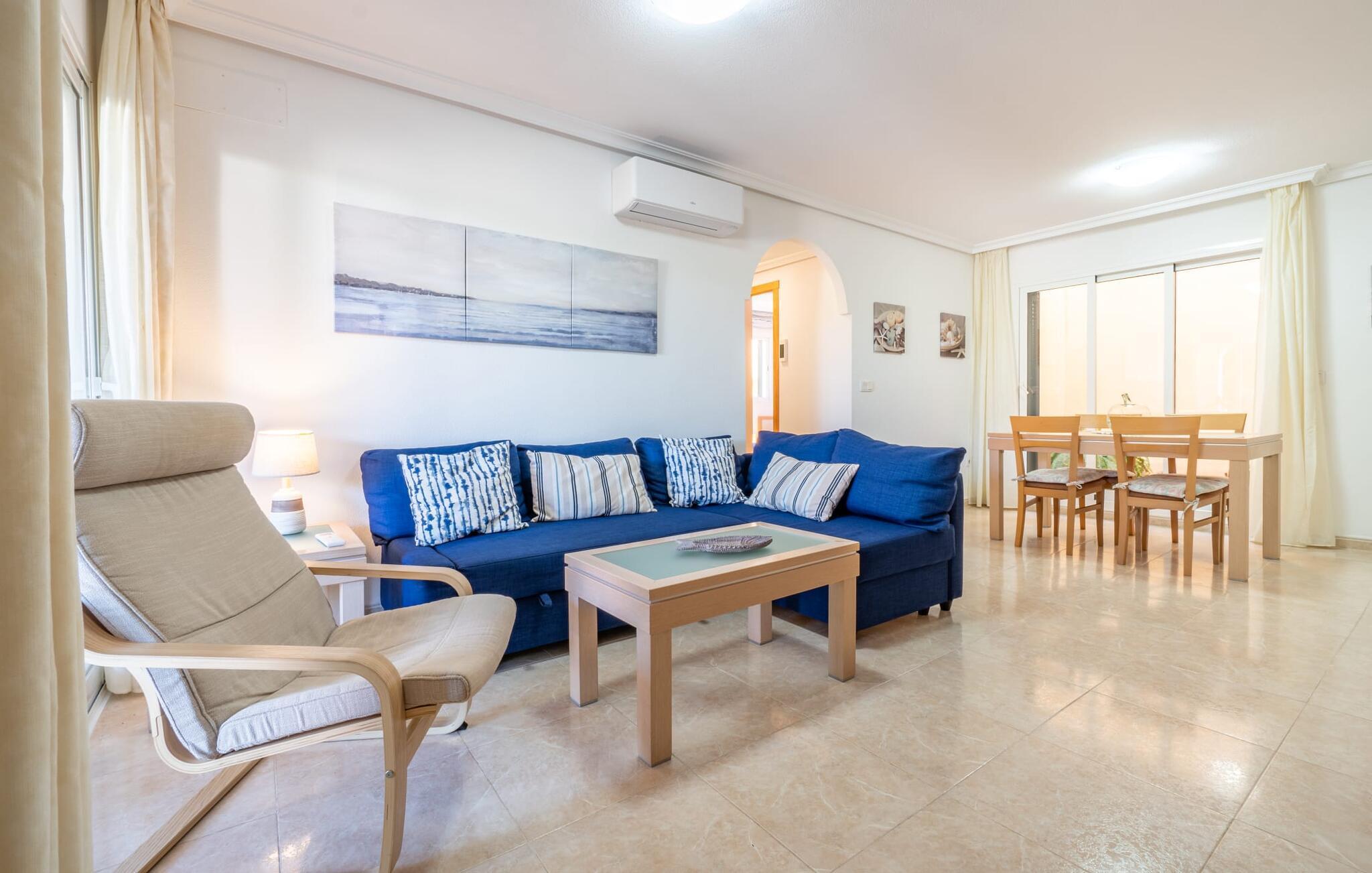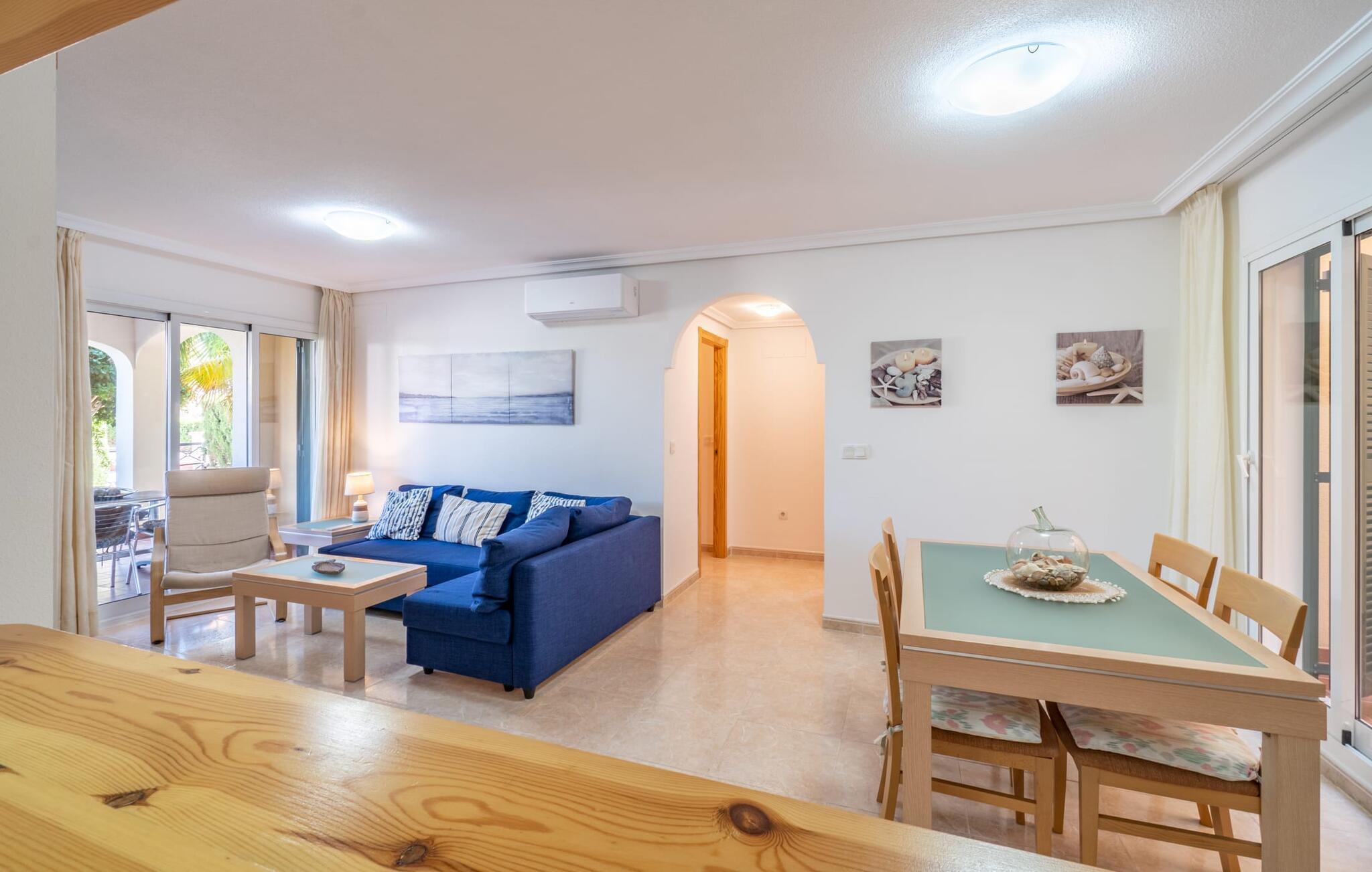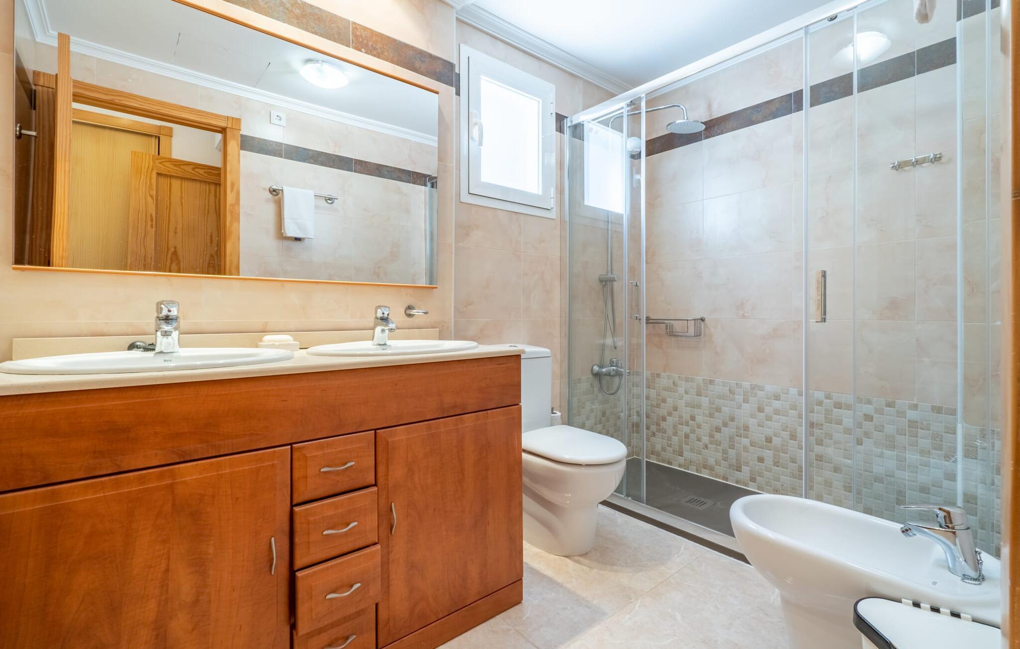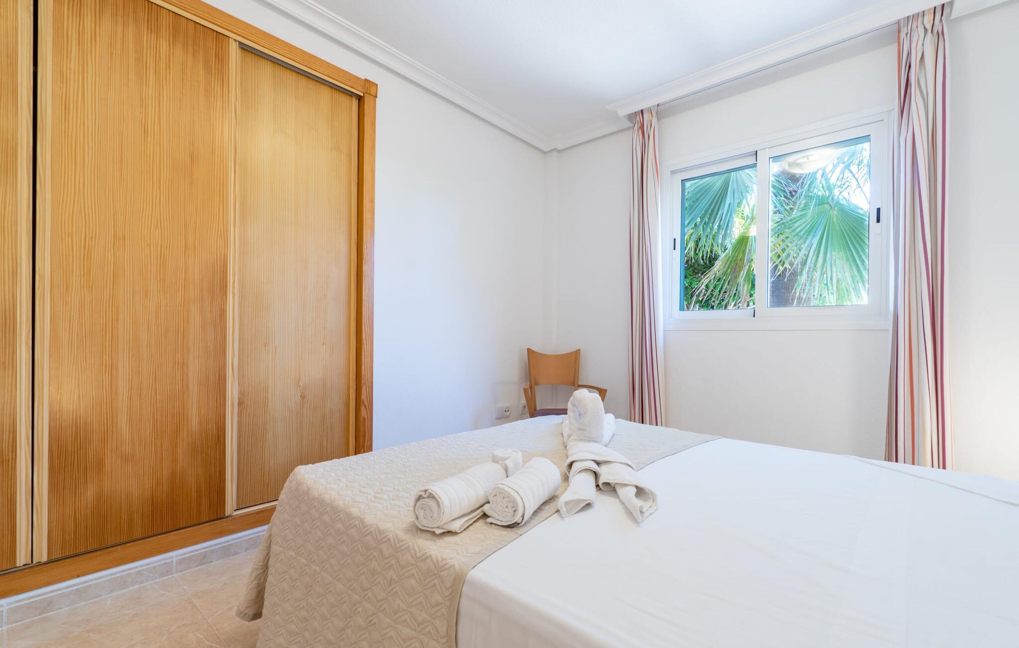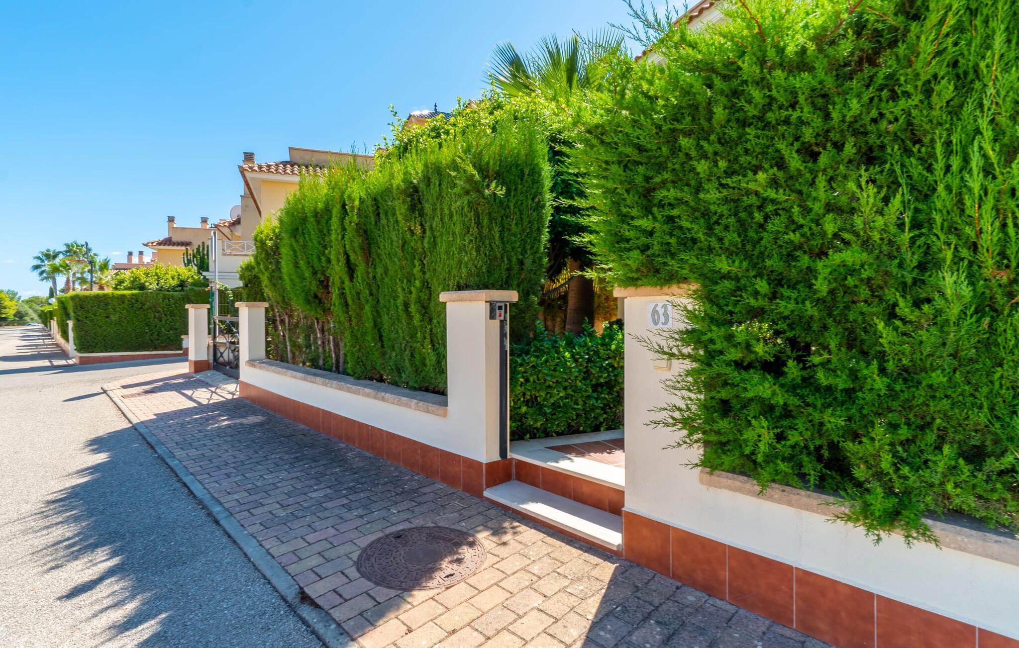 Diese Ferienwohnung auf Mallorca ist das ideale Reiseziel für eine Familie oder zwei Paare. Die überdachte Terrasse mit Essbereich ist ein wunderbarer Ort für gemeinsame Mahlzeiten im Freien. Von hier aus genießen Sie den Blick auf den Garten, der mit mediterranen Pflanzen bepflanzt und mit Kiesflächen begrünt ist. Der Gemeinschaftspool ist eine attraktive Möglichkeit für entspannte Stunden an den heißesten Tagen. Für Kinder gibt es einen extra Bereich. Im Whirlpool, der je nach Jahreszeit beheizt ist, lässt sich das schöne Ambiente wunderbar genießen.