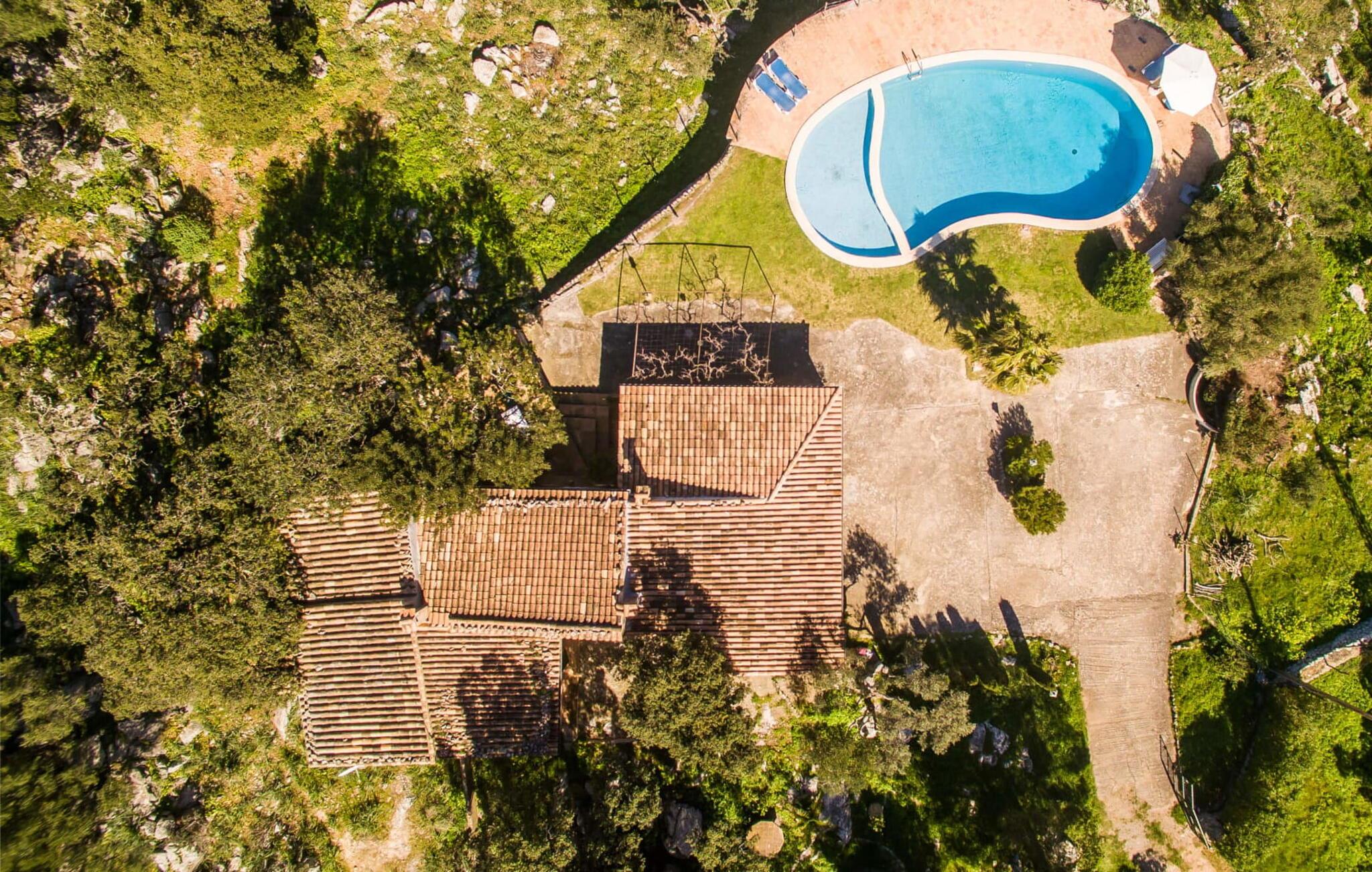 Vor dem Haus erstreckt sich eine große Terrasse, auf deren einer Seite sich ein Pool in Form einer Acht befindet, der für Kinder sicher ist und über einen separaten flachen Bereich verfügt. Mehrere Sitzmöglichkeiten rund um das Anwesen ermöglichen es den Gästen, sich zu entspannen und gleichzeitig die ruhige Umgebung zu genießen.