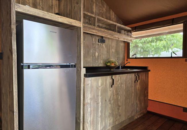 Inside, the tent has a dining area with a kitchen equipped with a refrigerator with freezer, ceramic hob, toaster, Dolce Gusto coffee machine, as well as cutlery, utensils and kitchen crockery. It also has a table designed to enjoy long meals in good company.