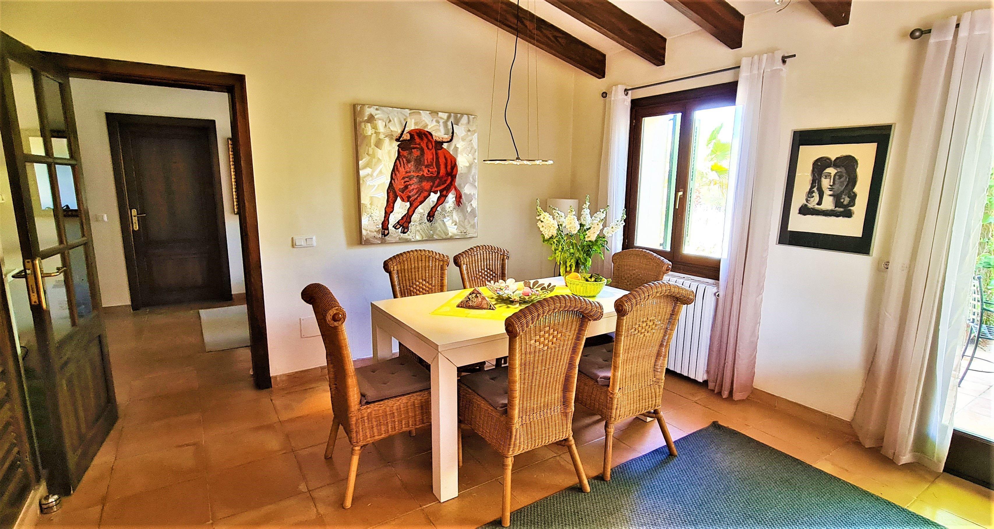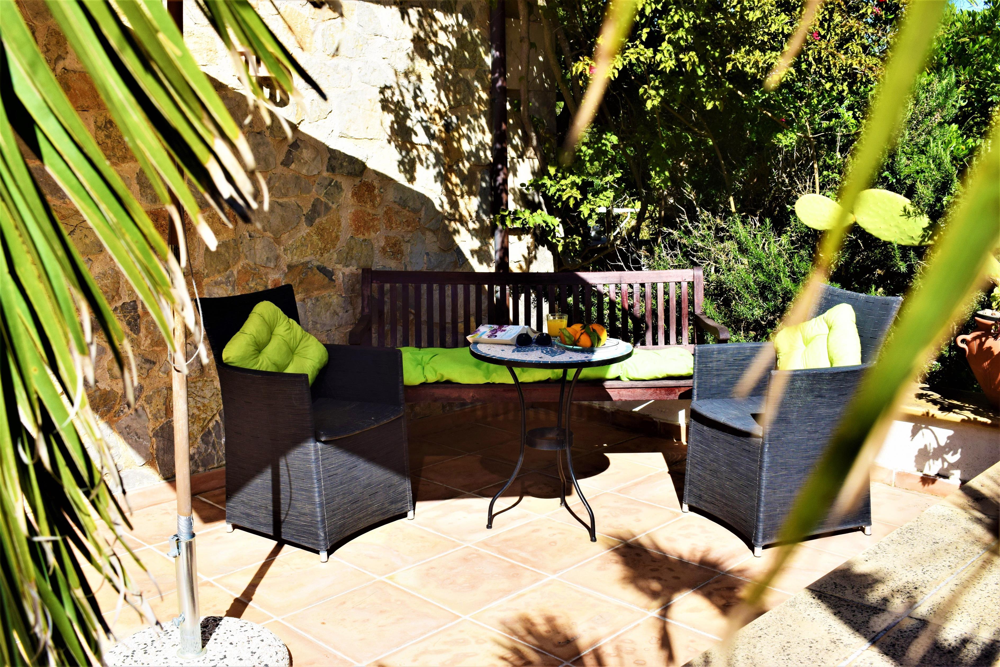 The spaciousness of the finca is perfect for anyone who wants to spend a harmonious holiday alone or with their children, with their parents or with friends. The 2 additional sun and shade terraces in the living/dining area with barbecue, electric grill, lockable patio cover and further terraces in the pool area offer plenty of space for socialising. The 8 x 4 metre pool with easy access via steps and outdoor shower invites you to take a refreshing dip. An automated pool control system ensures consistently good water quality. Depending on your preference, you can choose between sunny and shady spots on the many terrace areas and relax from the stresses of everyday life. In the hot season, the Persians protect all rooms from the sun's rays and still provide pleasant fresh air. The bedrooms are also equipped with air conditioning. The cosy open fireplace in the living/dining area and the oil central heating in all rooms ensure a comfortable atmosphere in the cooler seasons.