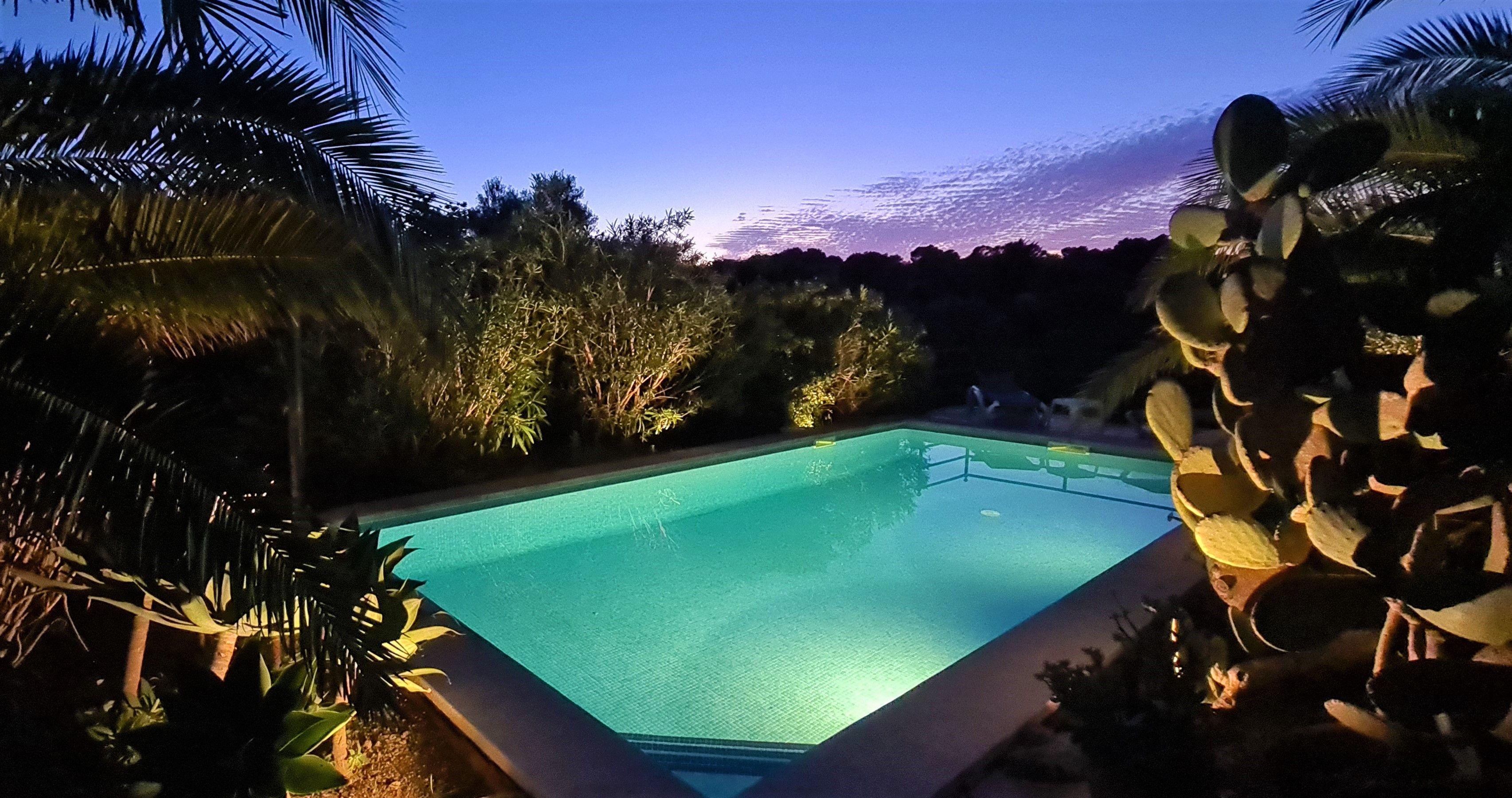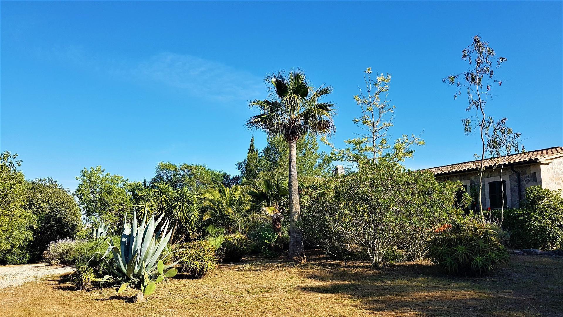 Your holiday begins when the automatic gate of the 7,100 m² plot opens and you drive along the small gravel path to the finca. The entire property is characterised by typical Mediterranean plants. You can explore and enjoy the Mallorcan countryside throughout the property, surrounded by numerous different palm trees, fig trees, almond trees, oleander bushes and much more. There are a total of 7 terrace areas around the entire house.