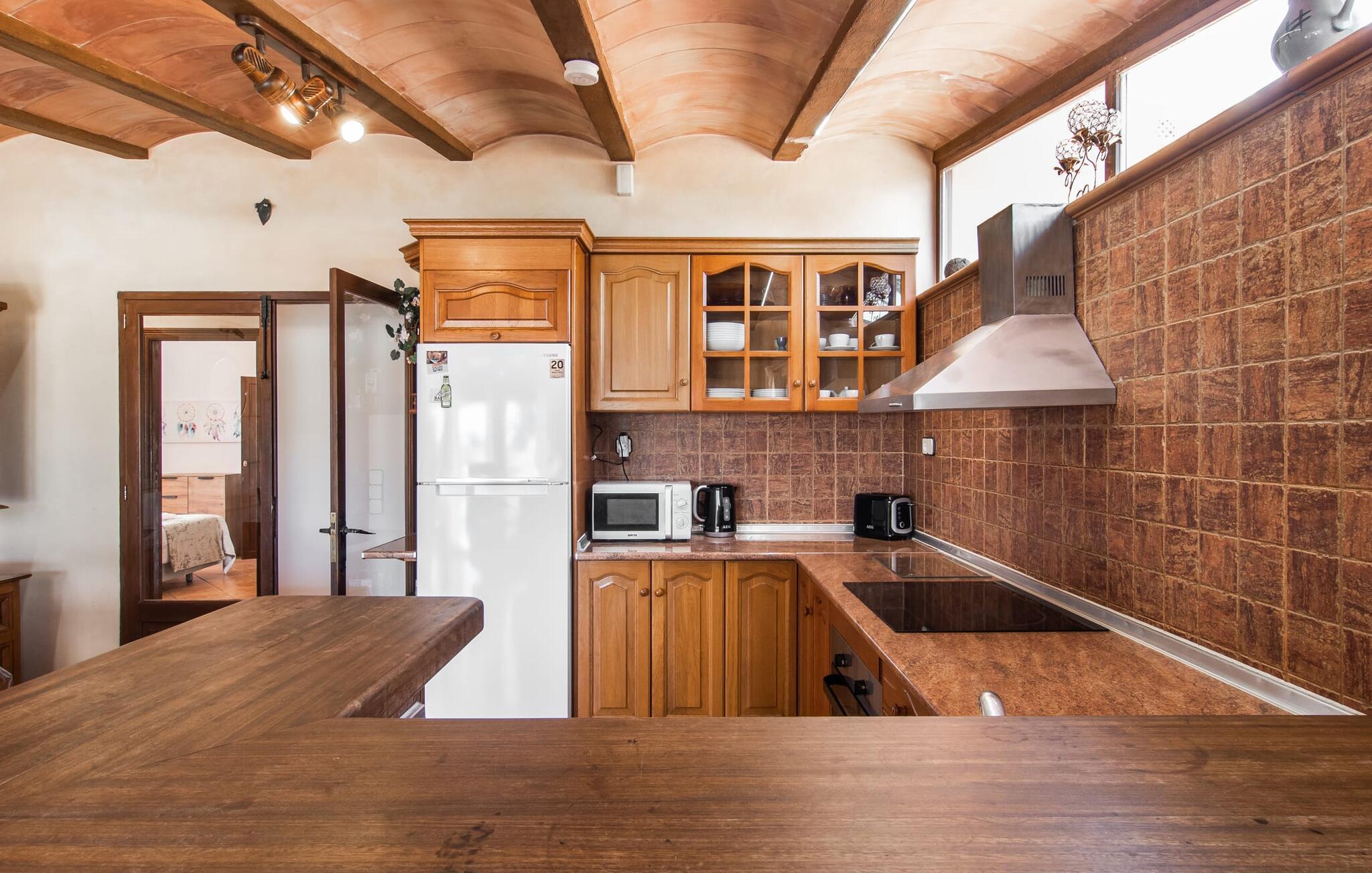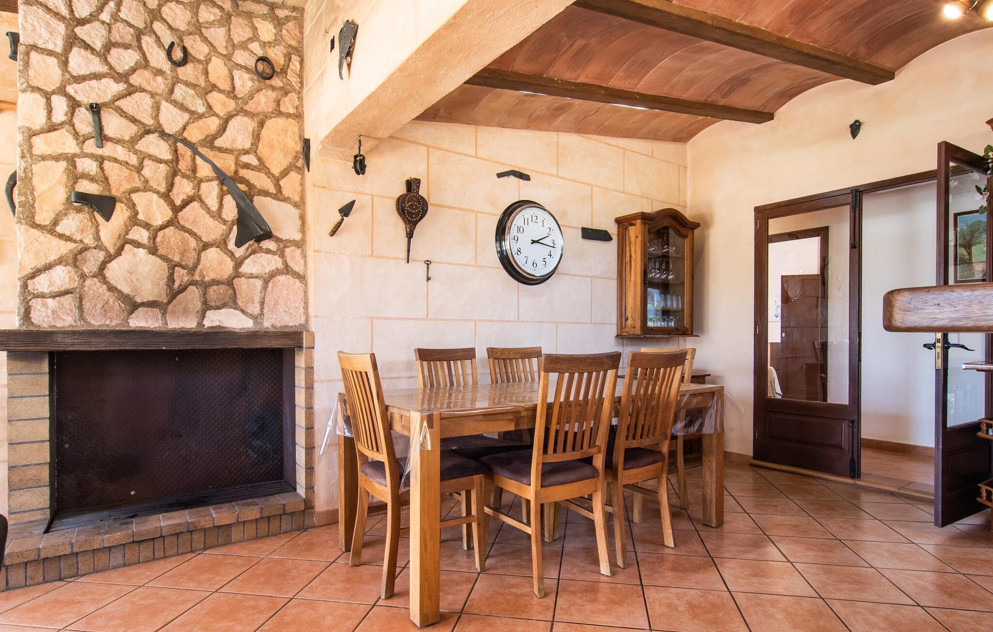 Der Wohnraum der Villa ist im Erdgeschoss gestaltet. Eine breite Glasschiebetür führt vom Garten direkt in ein freundliches Wohn- und Esszimmer mit Kamin. Die moderne, gut ausgestattete Landhausküche ist zum Wohnbereich hin offen. Sandsteinwände, Terrakottaböden und offene Holzbalkendecken schaffen ein gemütliches, rustikales Ambiente. Außerdem gibt es drei einladende, geschmackvoll eingerichtete Doppelzimmer, die von 21:30 bis 10:30 Uhr automatisch klimatisiert sind. Einer der Schlafbereiche verfügt über ein eigenes Bad, ein anderer hat direkten Zugang zum Garten und es gibt ein weiteres großes Badezimmer mit Dusche.