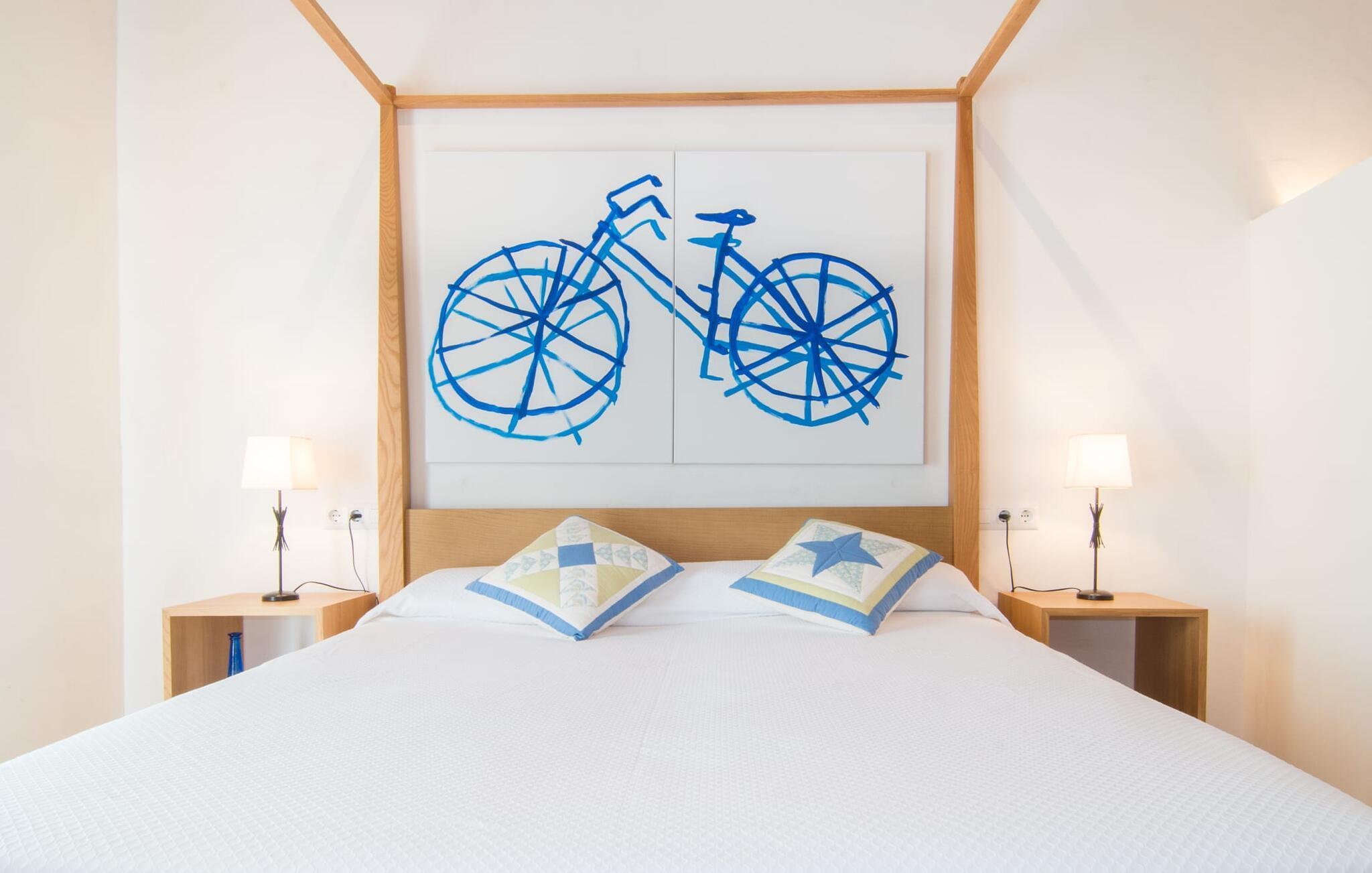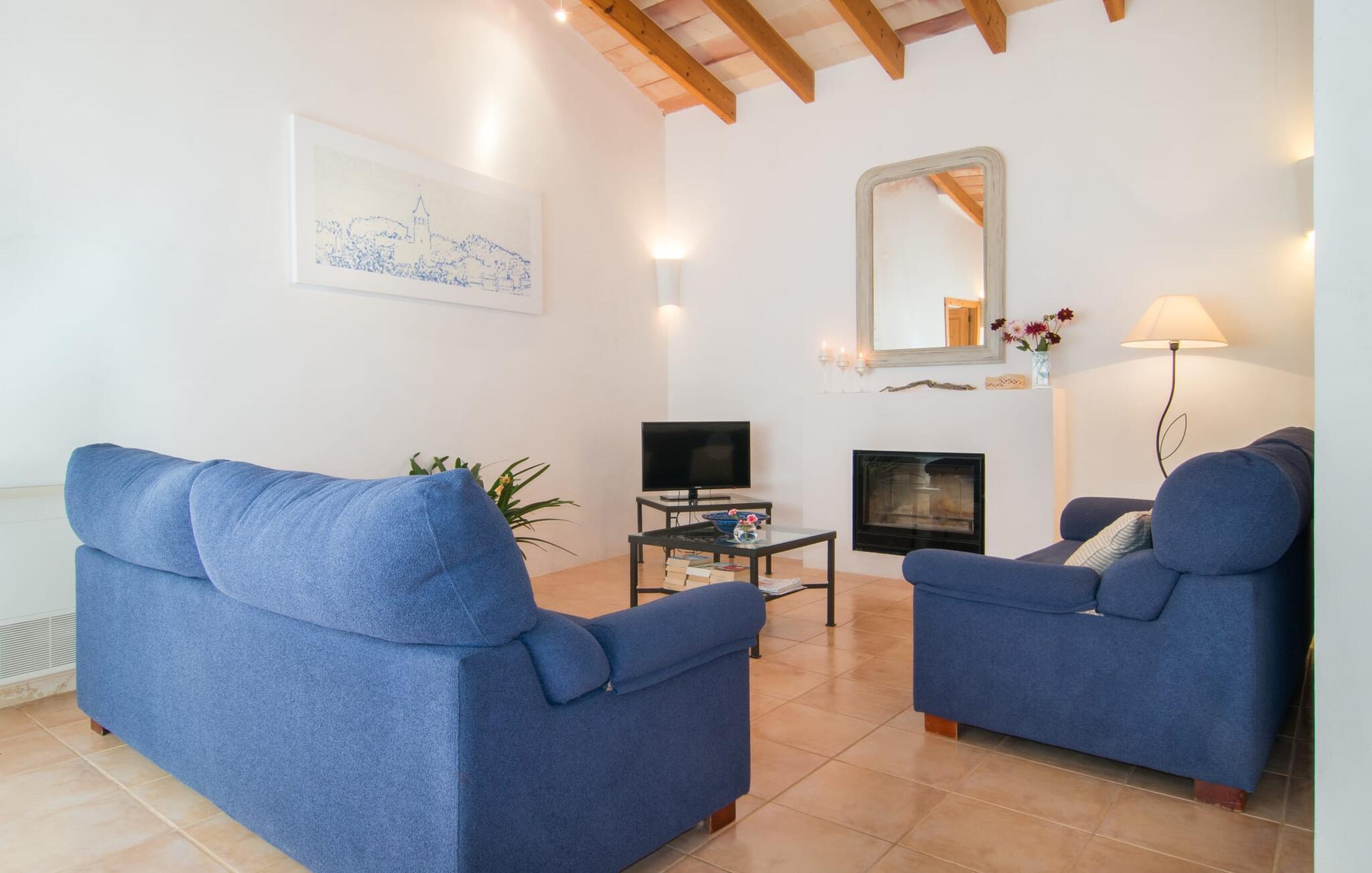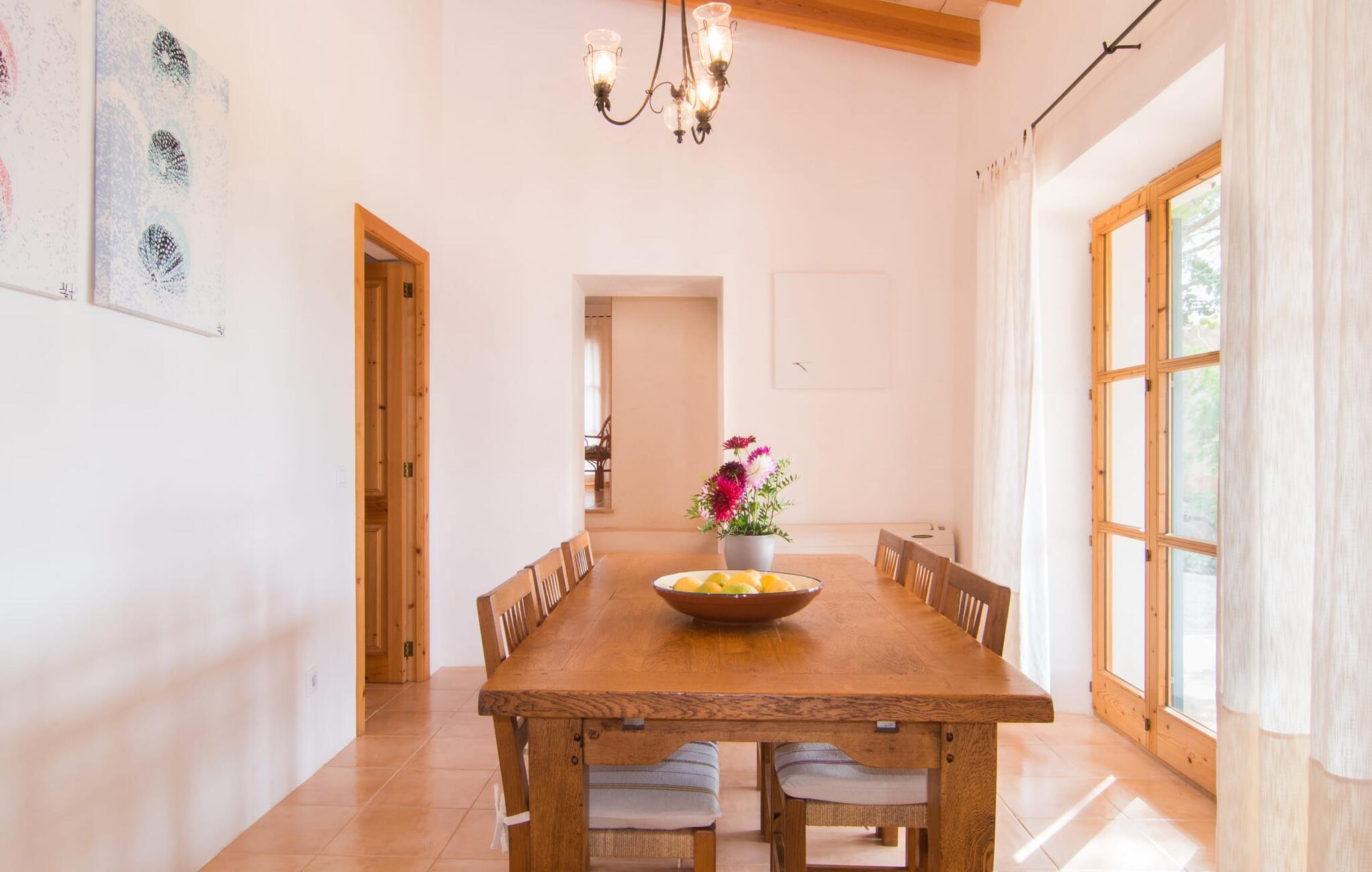 Von der Terrasse aus betreten Sie das Haus und landen sofort im großzügigen Essbereich, ausgestattet mit einem soliden Tisch für sechs Personen, der wiederum direkten Zugang zur Küche bietet. Auf der anderen Seite schließt sich der hell gestaltete Wohnraum mit gemütlicher Sofazone und Kamin an. Hier ist auch der Flachbildfernseher mit Satellitenanschluss installiert. Die offene Art der Raumgestaltung, die auch im Obergeschoss zu erkennen ist, vermittelt einen besonderen und sehr angenehmen Eindruck von Weitläufigkeit und Großzügigkeit. Die hellen Wände und Böden sowie die ästhetische Sichtbalkendecke verstärken diese Atmosphäre. Die typisch mallorquinische, teilweise gemauerte Küche ist mit allem ausgestattet, was man täglich braucht, inklusive Wasserkocher und Filterkaffeemaschine. Drei modern und hell eingerichtete Schlafzimmer stehen in ihrer Gestaltung für Klarheit und Ruhe. Ohne viele störende Accessoires finden Sie möglicherweise die Ruhe und Erholung, die Sie gesucht haben. Den Gästen stehen ein Bett mit den Maßen 1,80 x 2,00 m und vier mit den Maßen 0,90 x 2,00 m zur Verfügung. Eines der Schlafzimmer ist mit einem offenen En-Suite-Badezimmer ausgestattet, das wiederum mit Waschbecken, WC, Bidet, Dusche und Badewanne ausgestattet ist. Die beiden anderen Schlafzimmer teilen sich ein weiteres Badezimmer mit zwei Waschbecken, WC, Bidet und Dusche. Ein Bügeleisen und ein Haartrockner sind im Haus vorhanden, sodass Sie diese nicht selbst mitbringen müssen.