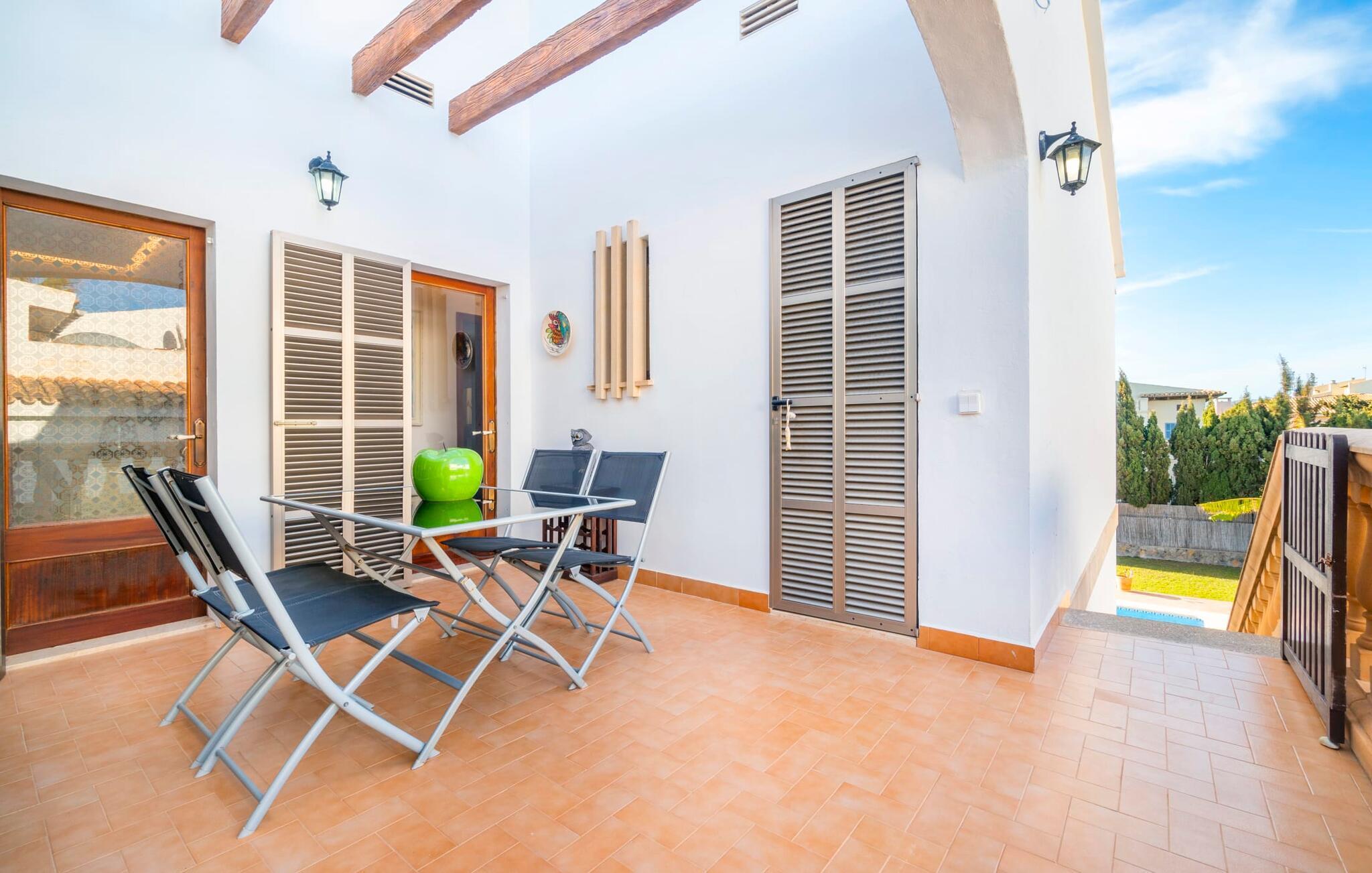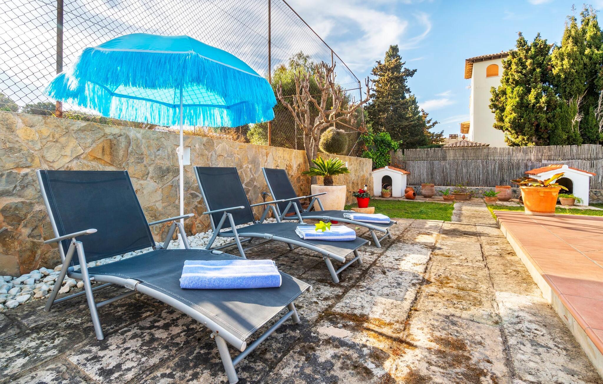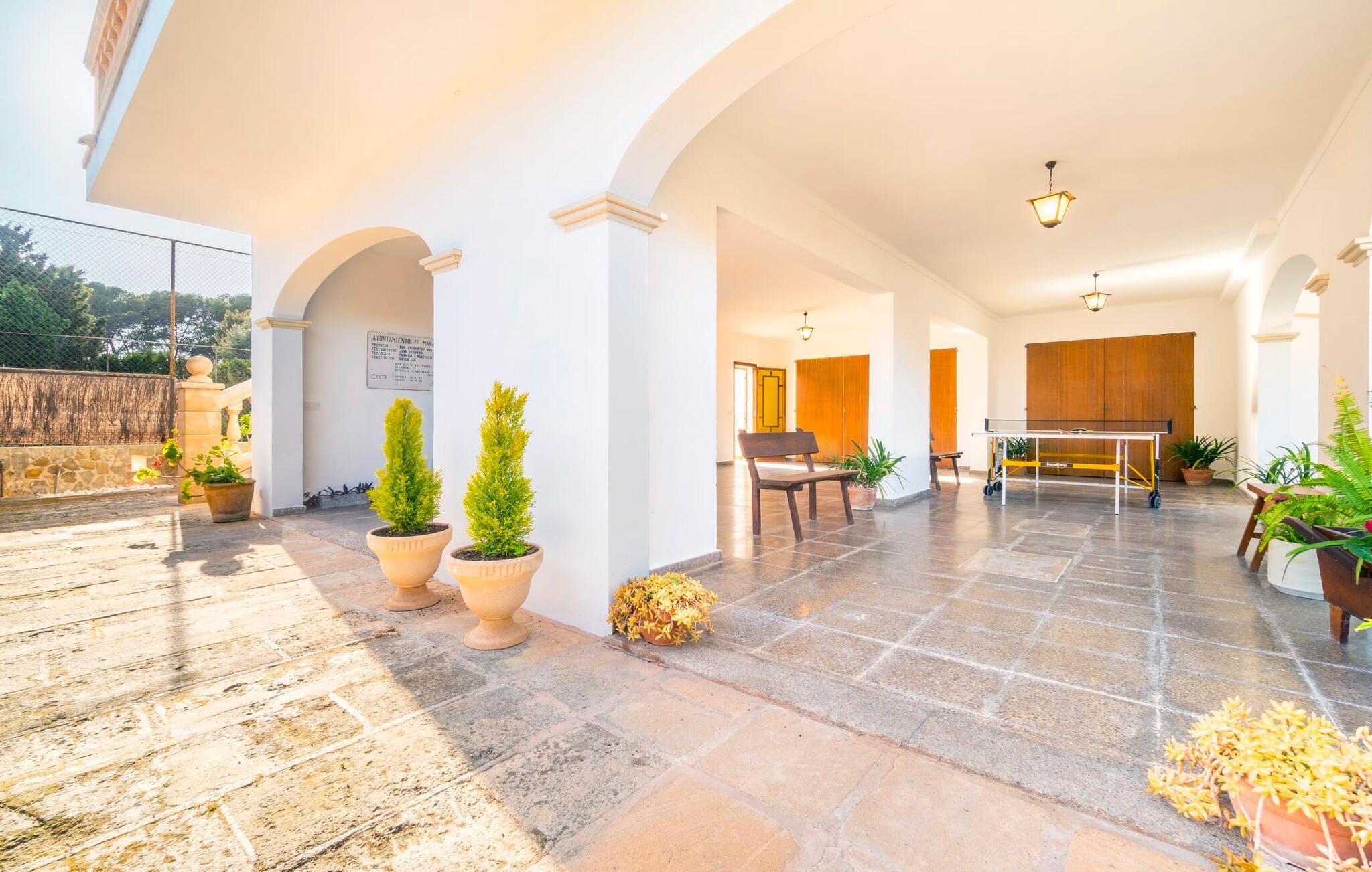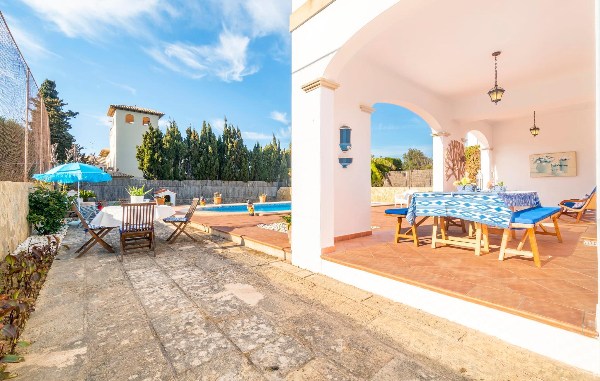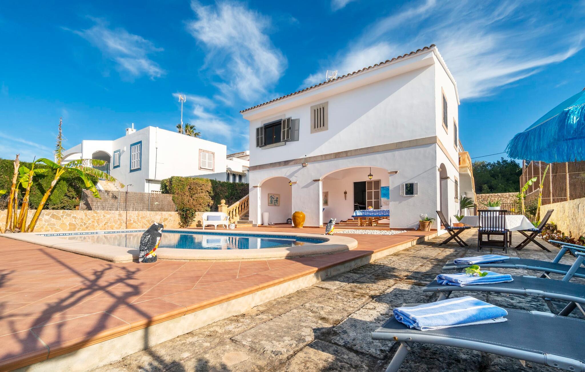 Die Küstenvilla „Cas Nin des Port“ liegt in exponierter Lage in der Hafenstadt Porto Cristo und in der Nähe der bekannten Drachenhöhlen auf einer Landzunge am Leuchtturm. Der maritime Charme prägt nicht nur den Naturhafen, sondern prägt auch nachhaltig den Charakter des strahlend weißen Ferienhauses. Trotz der Lage innerhalb einer Urbanisation genießen Sie hier die Privatsphäre einer gediegenen Mallorca-Villa, die von den Nachbarn getrennt und vor Blicken geschützt ist. Der Mosaikpool mit bequemer Treppe ist der Mittelpunkt des Gartens und dient als angenehme Abkühlung. Die bequemen Liegen können auf der angrenzenden Rasenfläche oder auf der Sonnenterrasse positioniert werden. Auf der schattigen Terrasse unter dem Wohnzimmer lässt es sich wunderbar entspannen. Insgesamt gibt es zahlreiche Sitzmöglichkeiten, die sich natürlich auch für einen entspannten Grillabend eignen. Fordern Sie Ihre Mitreisenden zu einer Partie Tischtennis heraus – auch im Schatten und wettergeschützt. Seitlich der Gartenebene führt eine Treppe zu einer Dachterrasse mit Essbereich.