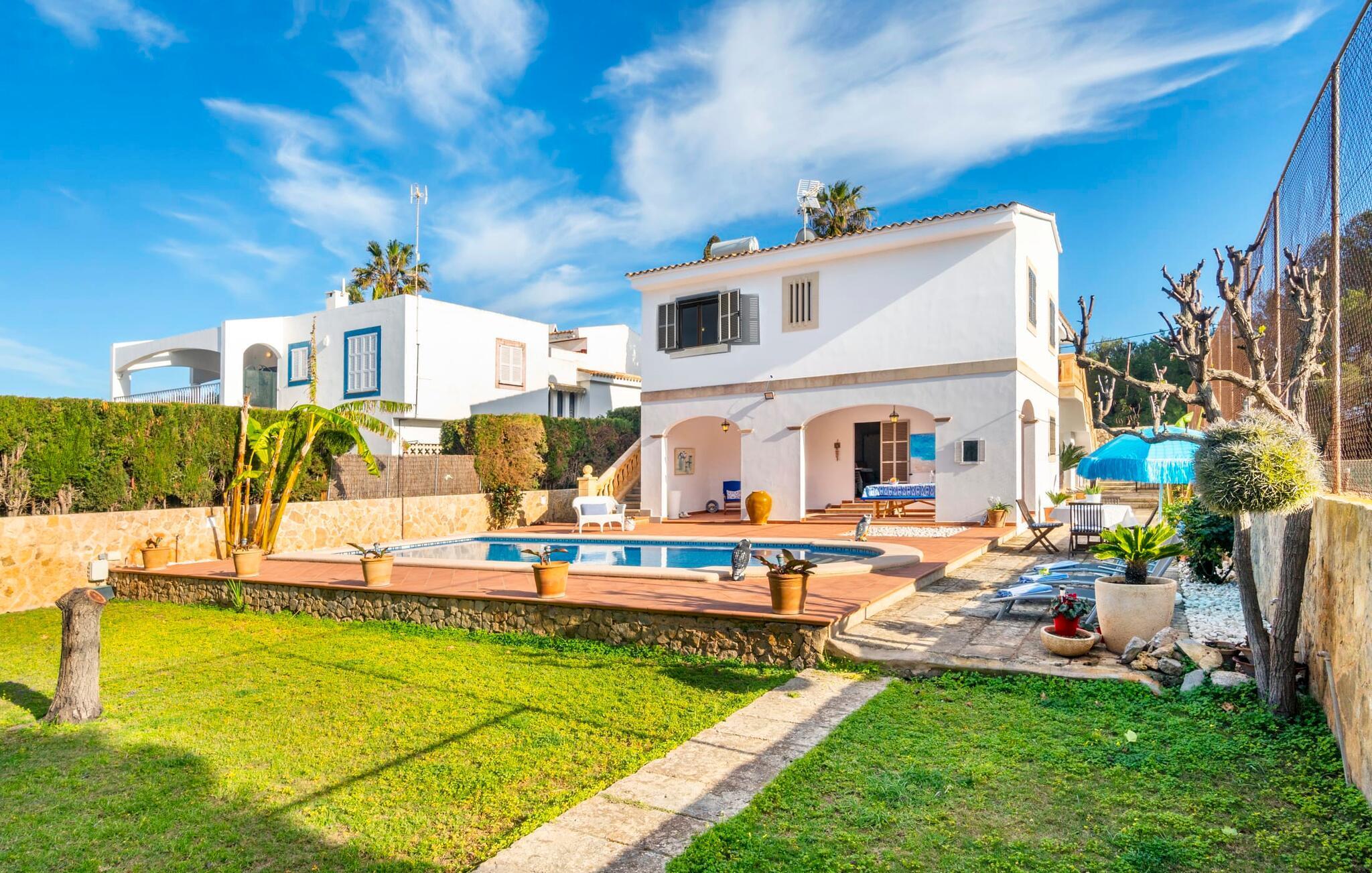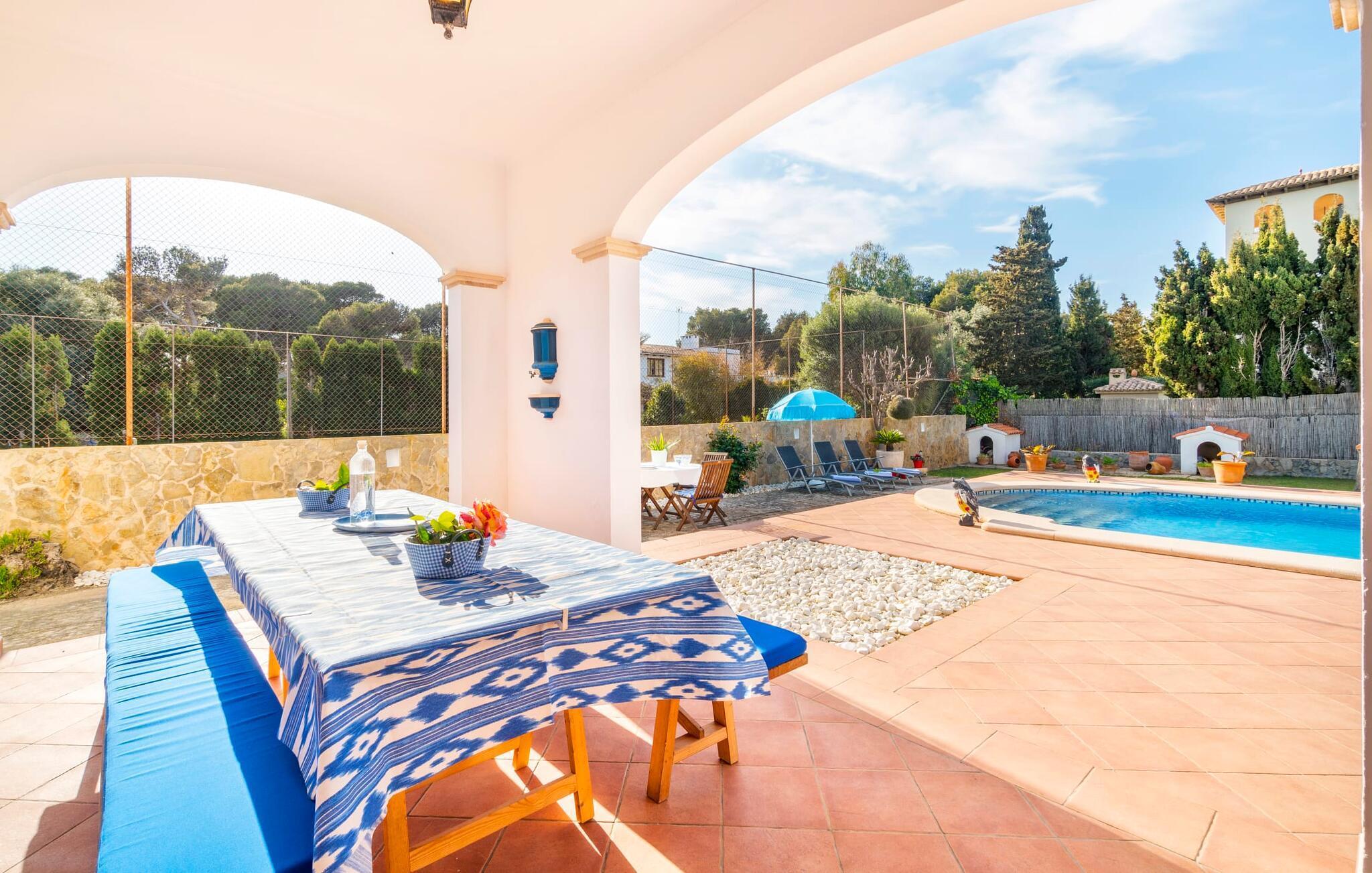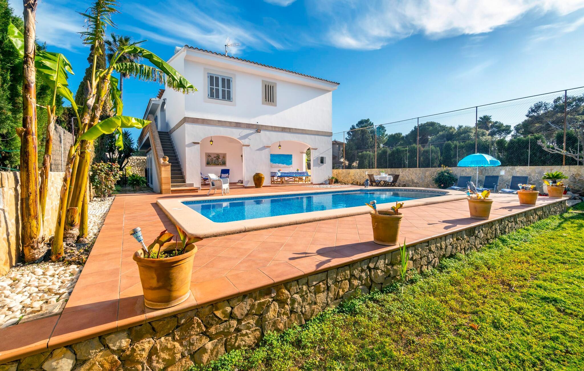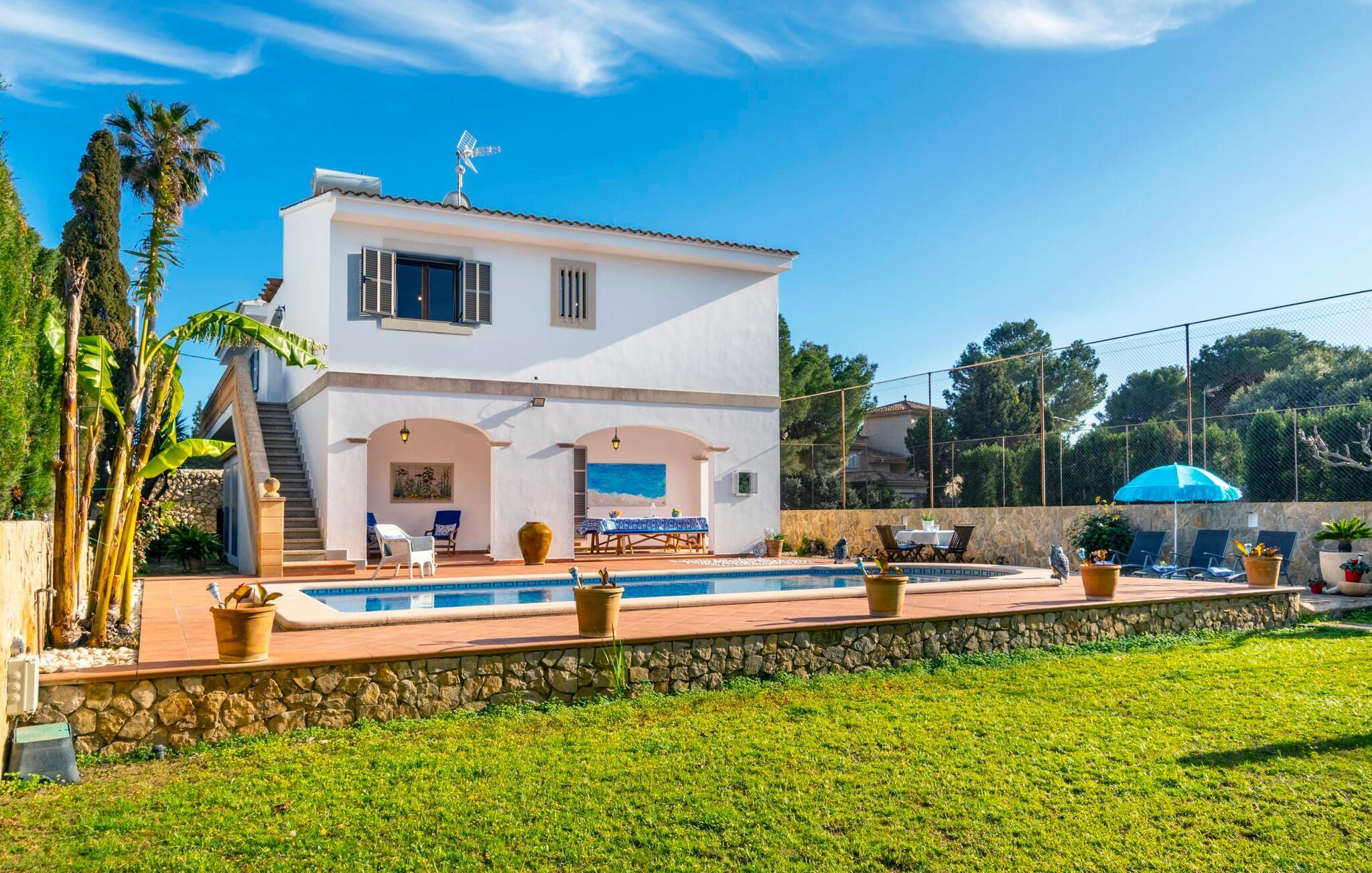 Die Küstenvilla „Cas Nin des Port“ liegt in exponierter Lage in der Hafenstadt Porto Cristo und in der Nähe der bekannten Drachenhöhlen auf einer Landzunge am Leuchtturm. Der maritime Charme prägt nicht nur den Naturhafen, sondern prägt auch nachhaltig den Charakter des strahlend weißen Ferienhauses. Trotz der Lage innerhalb einer Urbanisation genießen Sie hier die Privatsphäre einer gediegenen Mallorca-Villa, die von den Nachbarn getrennt und vor Blicken geschützt ist. Der Mosaikpool mit bequemer Treppe ist der Mittelpunkt des Gartens und dient als angenehme Abkühlung. Die bequemen Liegen können auf der angrenzenden Rasenfläche oder auf der Sonnenterrasse positioniert werden. Auf der schattigen Terrasse unter dem Wohnzimmer lässt es sich wunderbar entspannen. Insgesamt gibt es zahlreiche Sitzmöglichkeiten, die sich natürlich auch für einen entspannten Grillabend eignen. Fordern Sie Ihre Mitreisenden zu einer Partie Tischtennis heraus – auch im Schatten und wettergeschützt. Seitlich der Gartenebene führt eine Treppe zu einer Dachterrasse mit Essbereich.