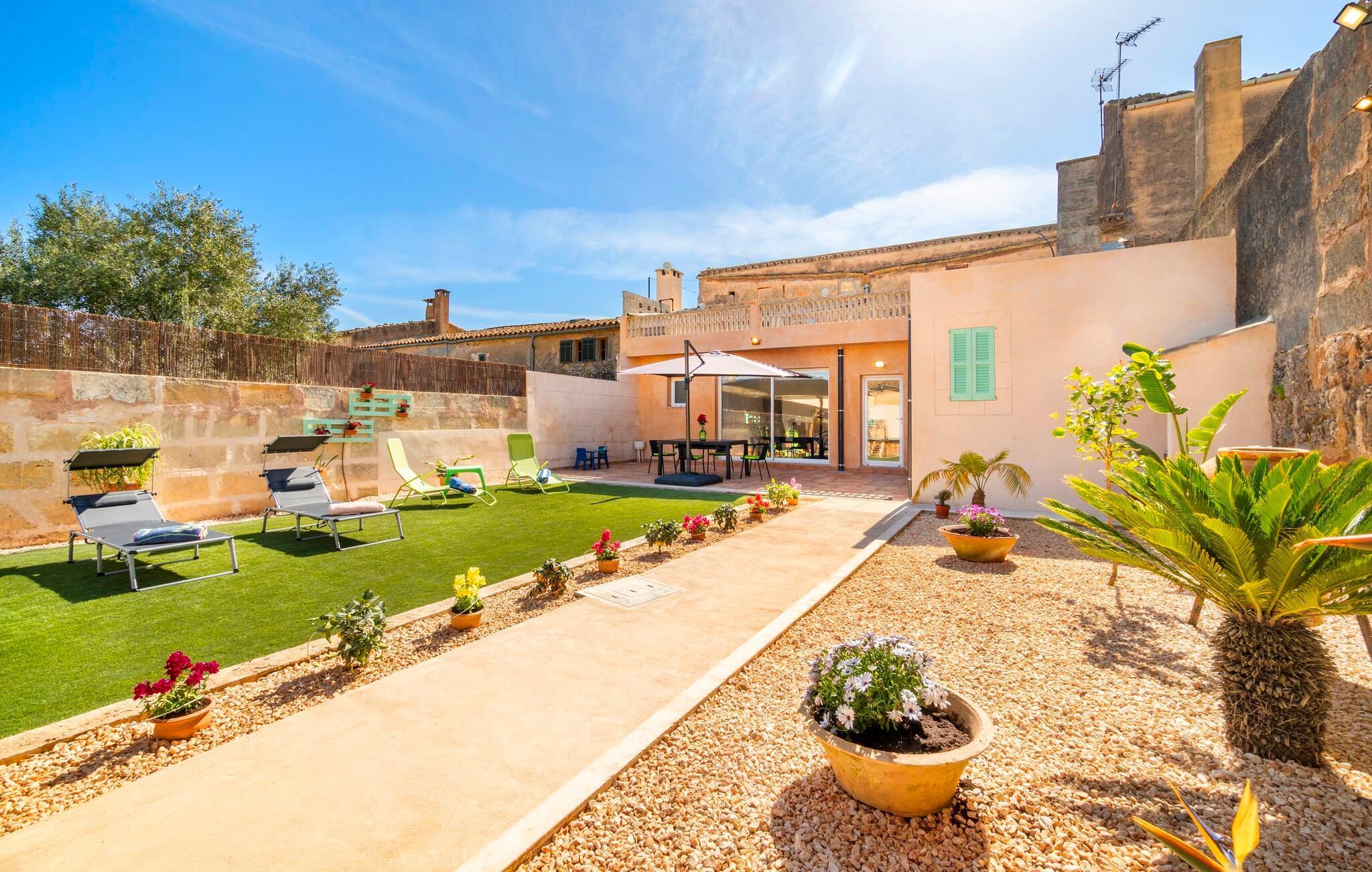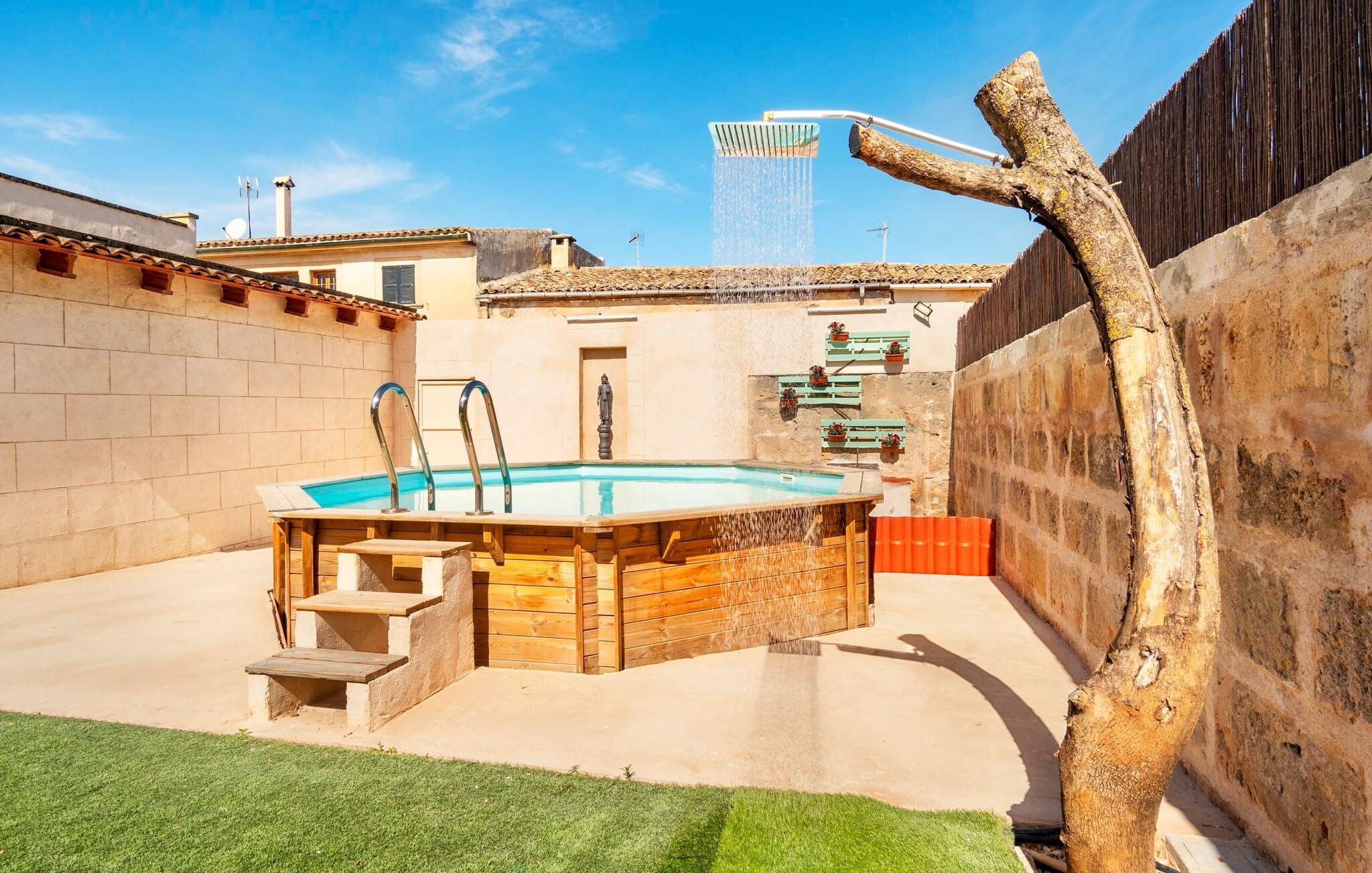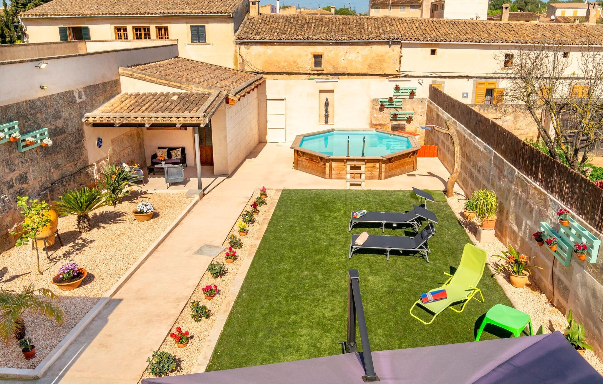 Im modernen Stadthaus „Cas Padri Pep“ können Sie sich auf Entspannung und hohe Lebensqualität inmitten der traumhaften Kulisse des Plà de Mallorca freuen. Dieses charmante Ferienhaus mit Dorfcharakter spiegelt die Attraktivität eines verträumten Dorfes im Zentrum der Insel wider. Im Einklang von Umgebung und Einrichtung, fernab vom Massentourismus, sticht das smarte Haus angenehm hervor. Ein besonderer Vorteil: Sie können zu Fuß durch das historische Dorf schlendern und dort einige sehr gute Restaurants besuchen. Das schlanke, komplett renovierte Ferienhaus verfügt über einen liebevoll gestalteten Innenhof, der sich in eine wahre Wohlfühloase verwandelt hat. Die Terrasse bietet grünen Kunstrasen und wurde mit zahlreichen mediterranen Pflanzen bereichert. Abgerundet wird es mit einer gemütlichen, überdachten Sitzecke und Grill. Der runde Pop-up-Pool mit Holzverkleidung ist nicht nur kinderfreundlich, sondern bietet gerade im Urlaub im Zentrum der Insel auch eine angenehme Abkühlung. Die individuelle Gestaltung der Außendusche verrät bereits viel über den optimalen Einrichtungsstil, der Sie im Innenraum erwartet.