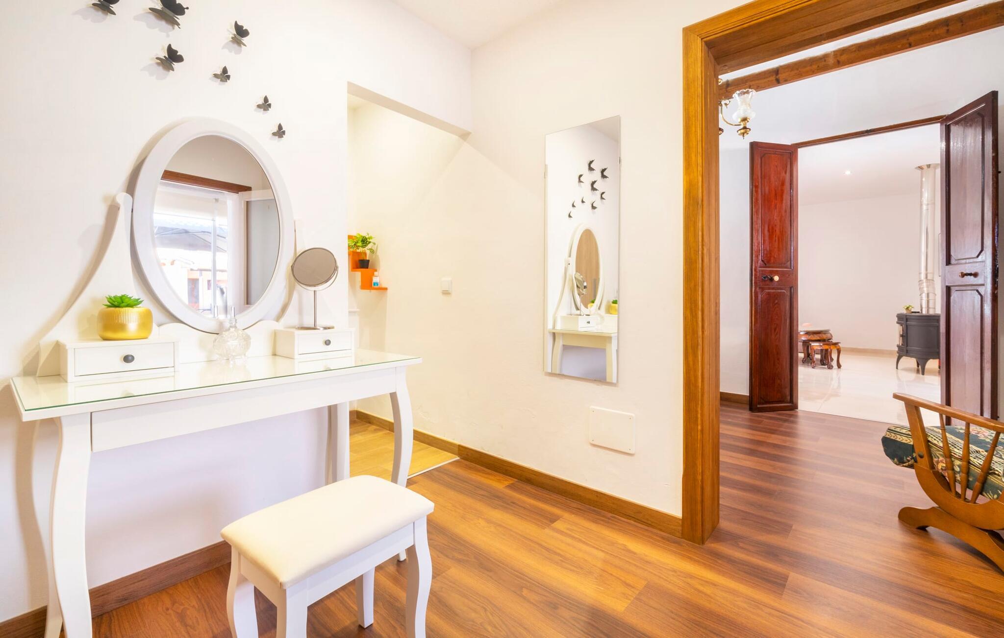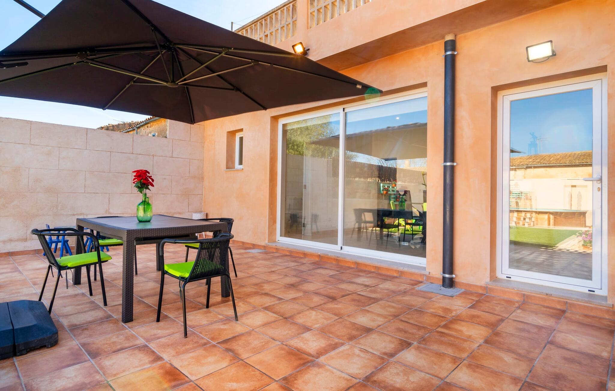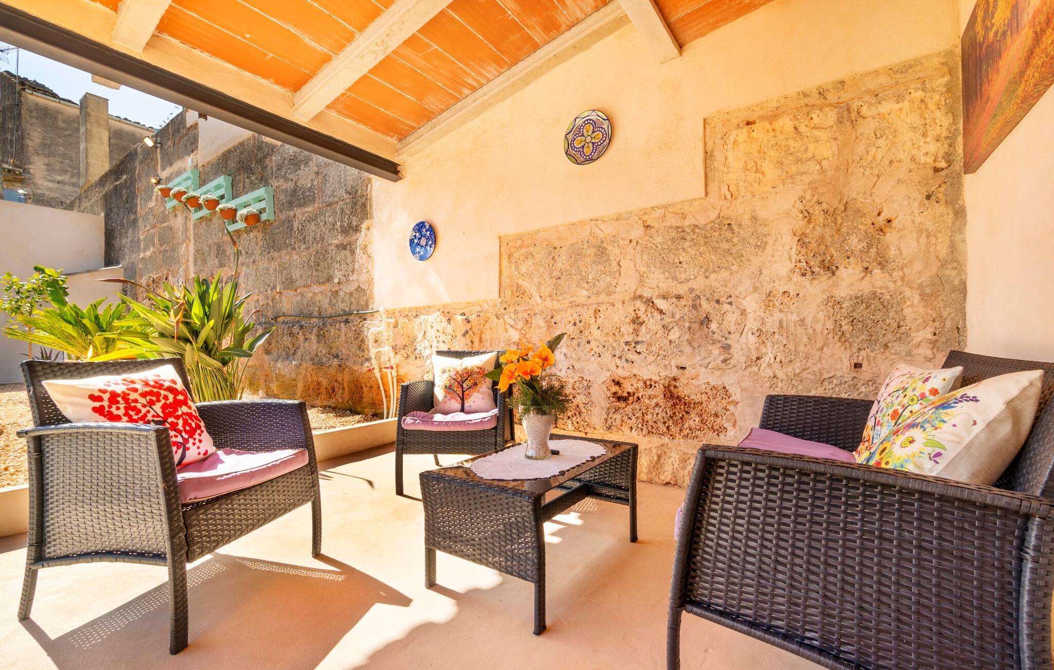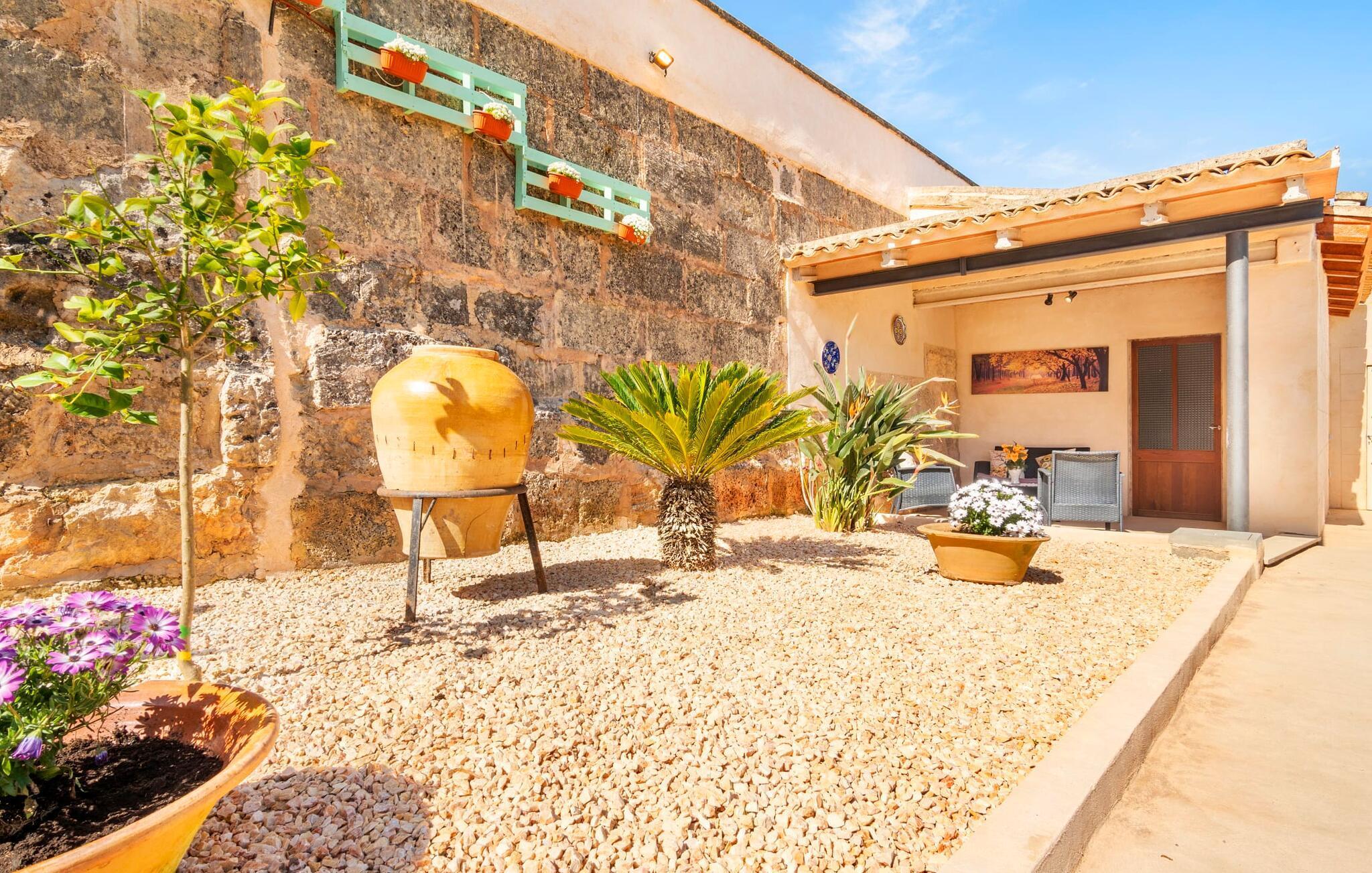 Im modernen Stadthaus „Cas Padri Pep“ können Sie sich auf Entspannung und hohe Lebensqualität inmitten der traumhaften Kulisse des Plà de Mallorca freuen. Dieses charmante Ferienhaus mit Dorfcharakter spiegelt die Attraktivität eines verträumten Dorfes im Zentrum der Insel wider. Im Einklang von Umgebung und Einrichtung, fernab vom Massentourismus, sticht das smarte Haus angenehm hervor. Ein besonderer Vorteil: Sie können zu Fuß durch das historische Dorf schlendern und dort einige sehr gute Restaurants besuchen. Das schlanke, komplett renovierte Ferienhaus verfügt über einen liebevoll gestalteten Innenhof, der sich in eine wahre Wohlfühloase verwandelt hat. Die Terrasse bietet grünen Kunstrasen und wurde mit zahlreichen mediterranen Pflanzen bereichert. Abgerundet wird es mit einer gemütlichen, überdachten Sitzecke und Grill. Der runde Pop-up-Pool mit Holzverkleidung ist nicht nur kinderfreundlich, sondern bietet gerade im Urlaub im Zentrum der Insel auch eine angenehme Abkühlung. Die individuelle Gestaltung der Außendusche verrät bereits viel über den optimalen Einrichtungsstil, der Sie im Innenraum erwartet.