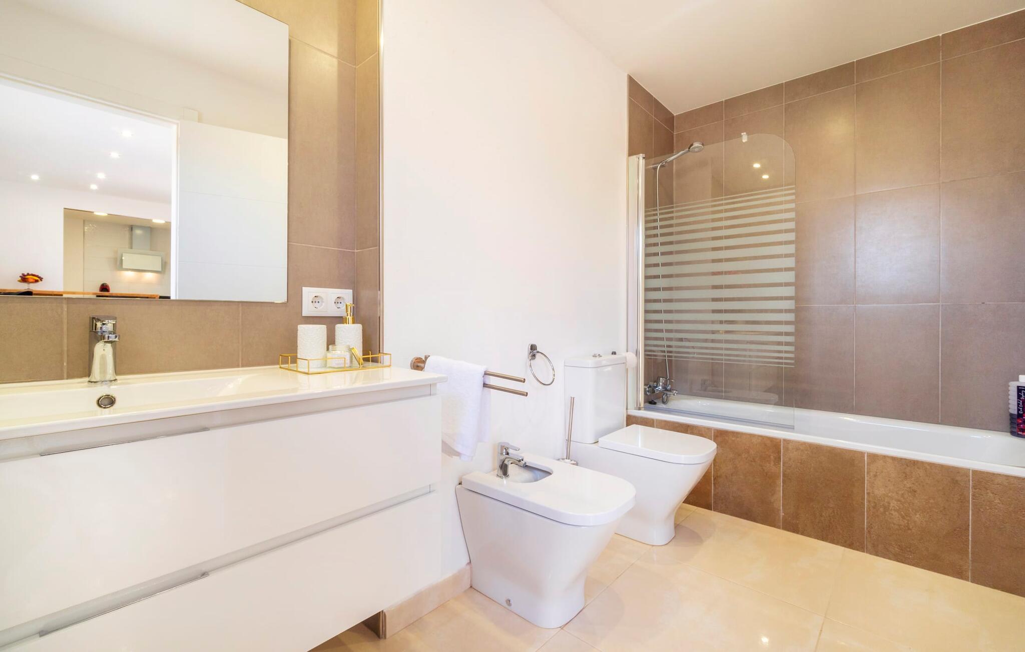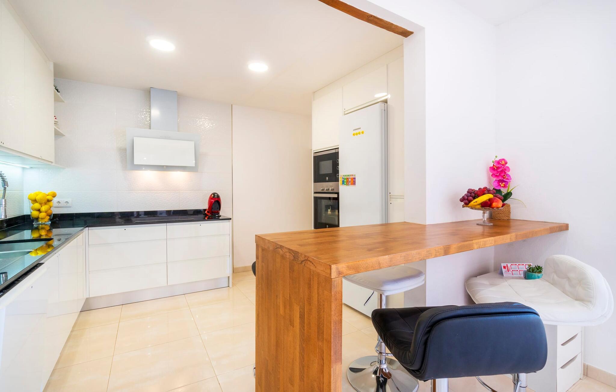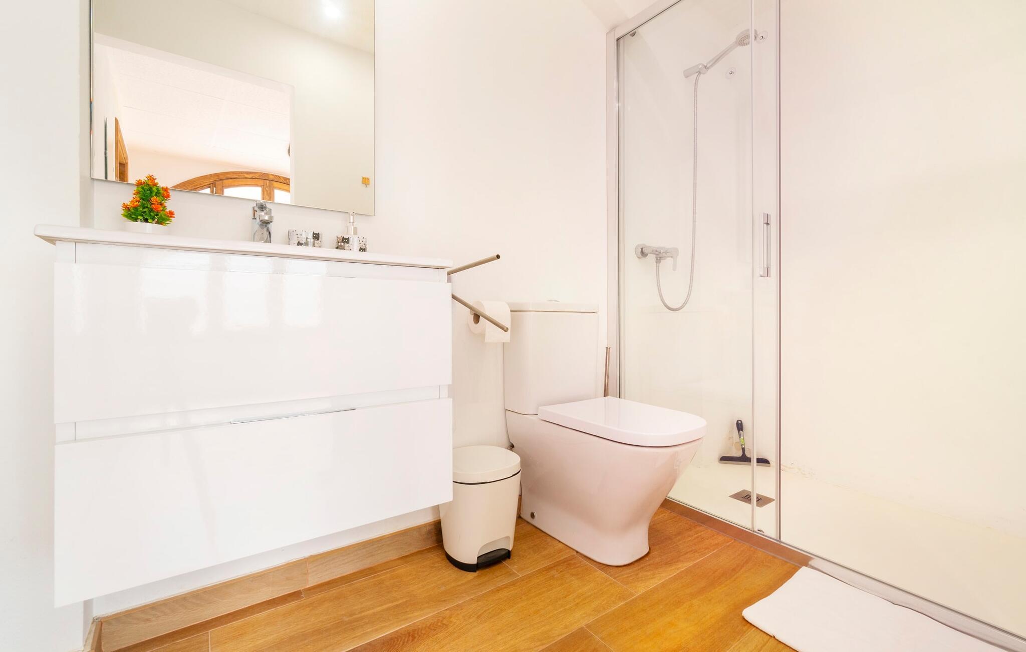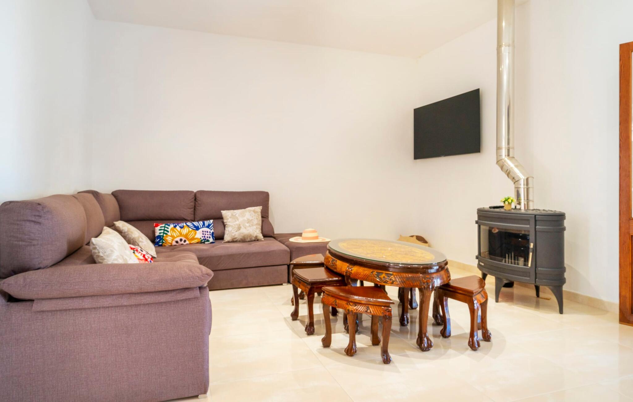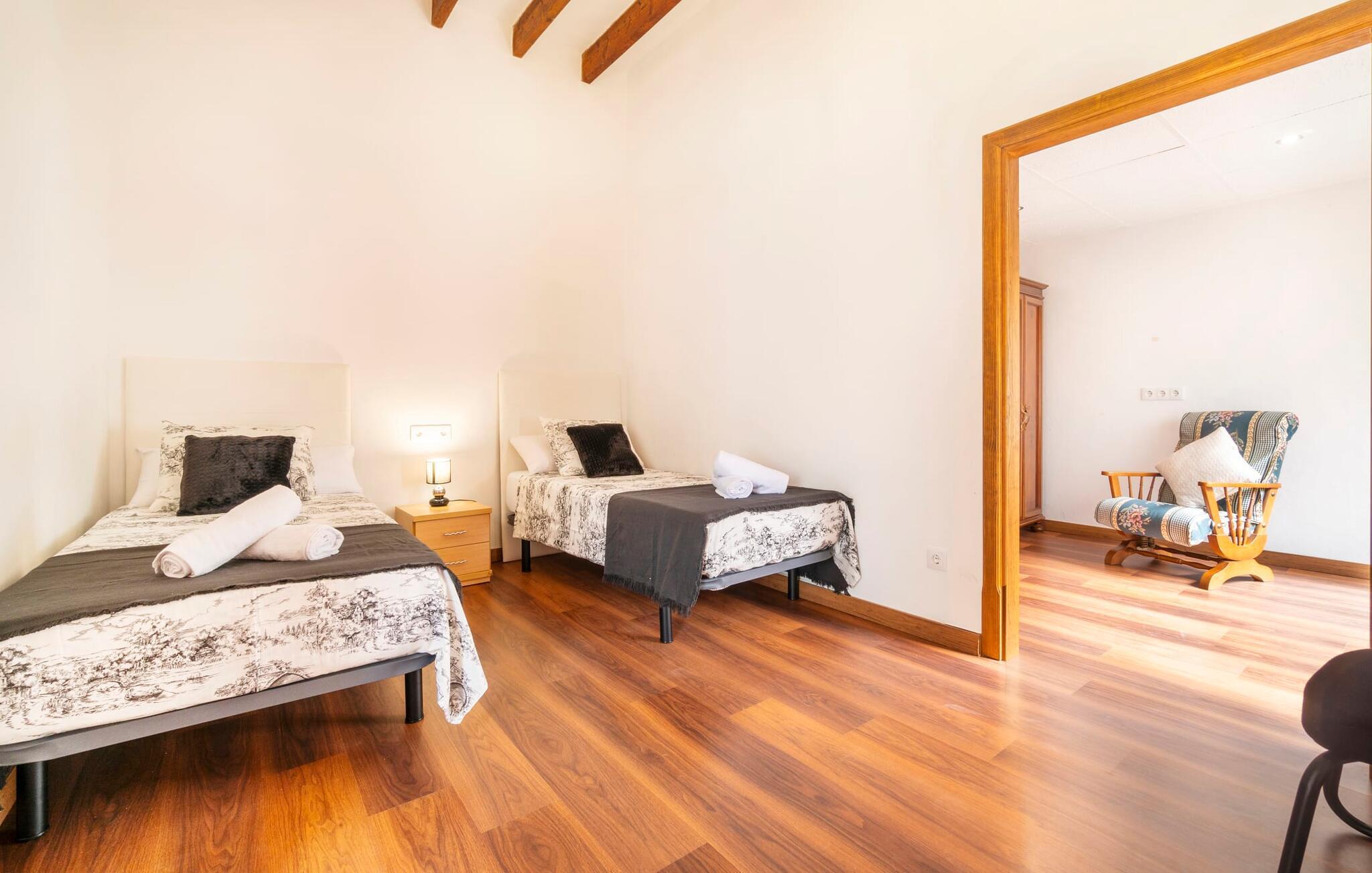 Nachhaltig, individuell und klar – so lautet das Motto der anspruchsvollen Einrichtung des modernen Ferienhauses. Dunkles Holz in Kombination mit hellem Weiß ergibt zeitlosen Chic. Allein der Küchen-Essbereich, der durch große Schiebefenster mit der Terrasse verwoben ist, überzeugt durch sein exklusives Design. Die voll ausgestattete Küche ist durch eine Holztheke vom Esszimmer getrennt. Das angrenzende Badezimmer mit Badewanne dient sowohl als Innen- als auch als Außenbad, da es in der Nähe der Terrasse liegt. Nebenan befindet sich das einladende Wohnzimmer mit Wandfernseher und gemütlichem Kamin. Das hübsche, vollklimatisierte Sommerhaus ist ideal für eine Familie oder zwei Paare. Beide Schlafzimmer verfügen über ein modernes Badezimmer en Suite mit ebenerdiger Dusche. Für Kinder stehen zwei Zusatzbetten zur Verfügung. Im „Cas Padri Pep“ können Sie das ländliche Mallorca inmitten eines authentischen Ortes kennenlernen und entspannen. Entspannung ist hier vorprogrammiert!