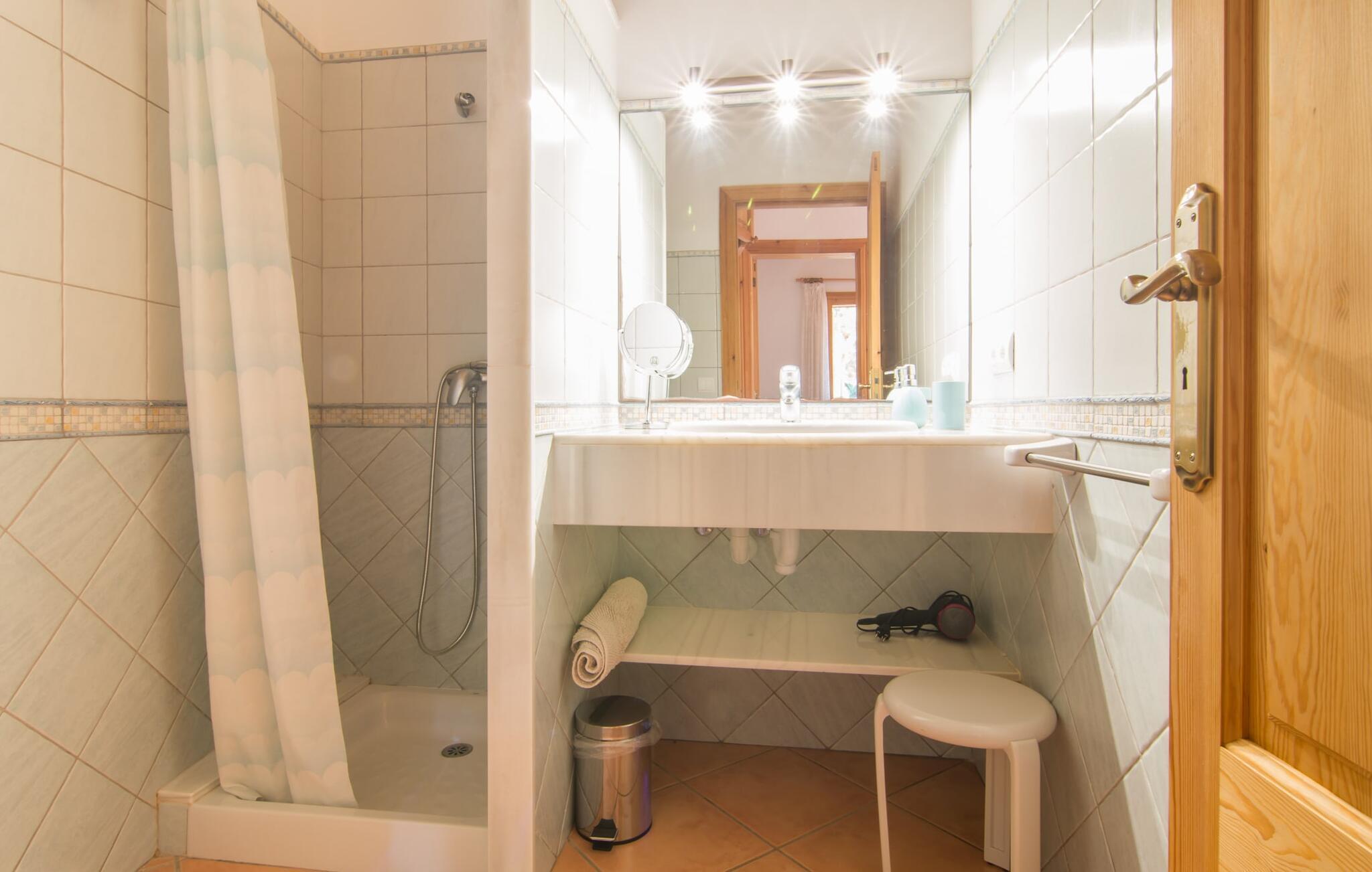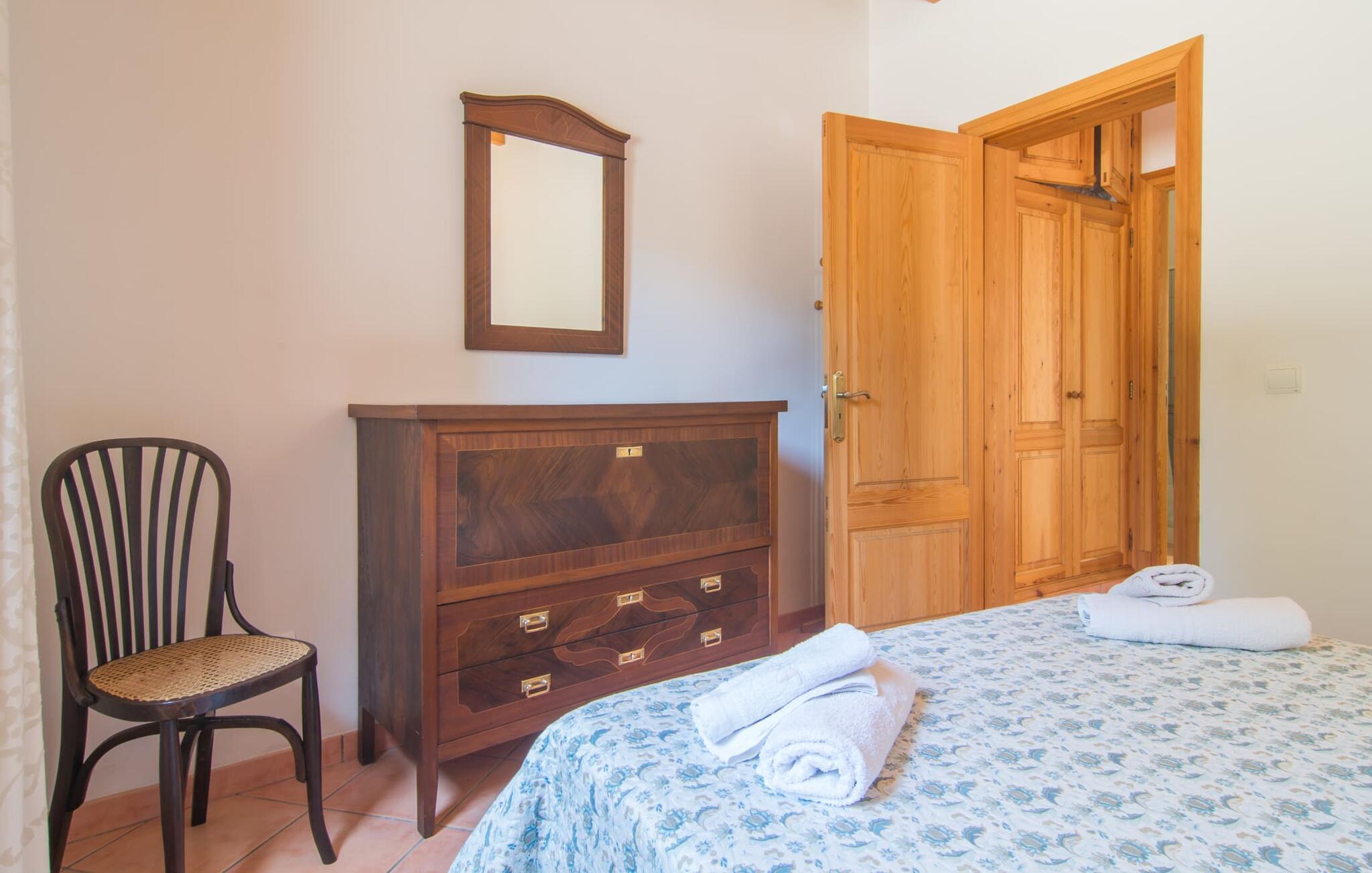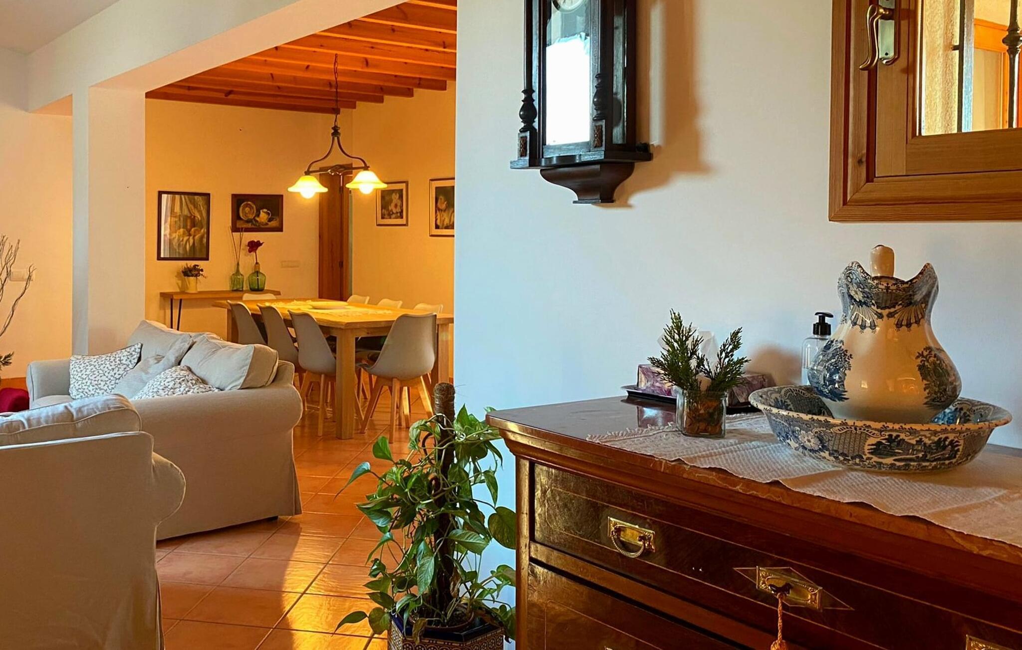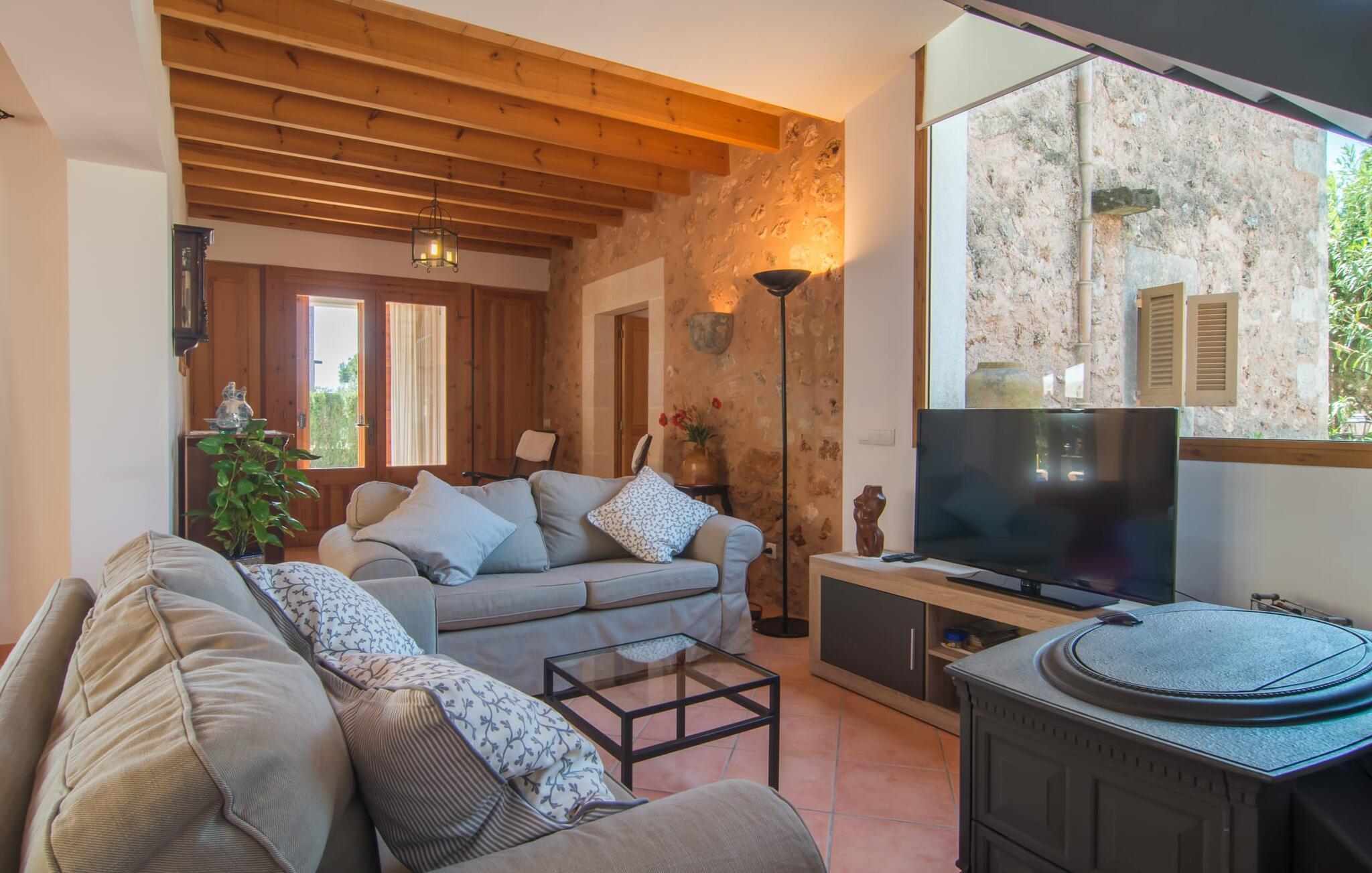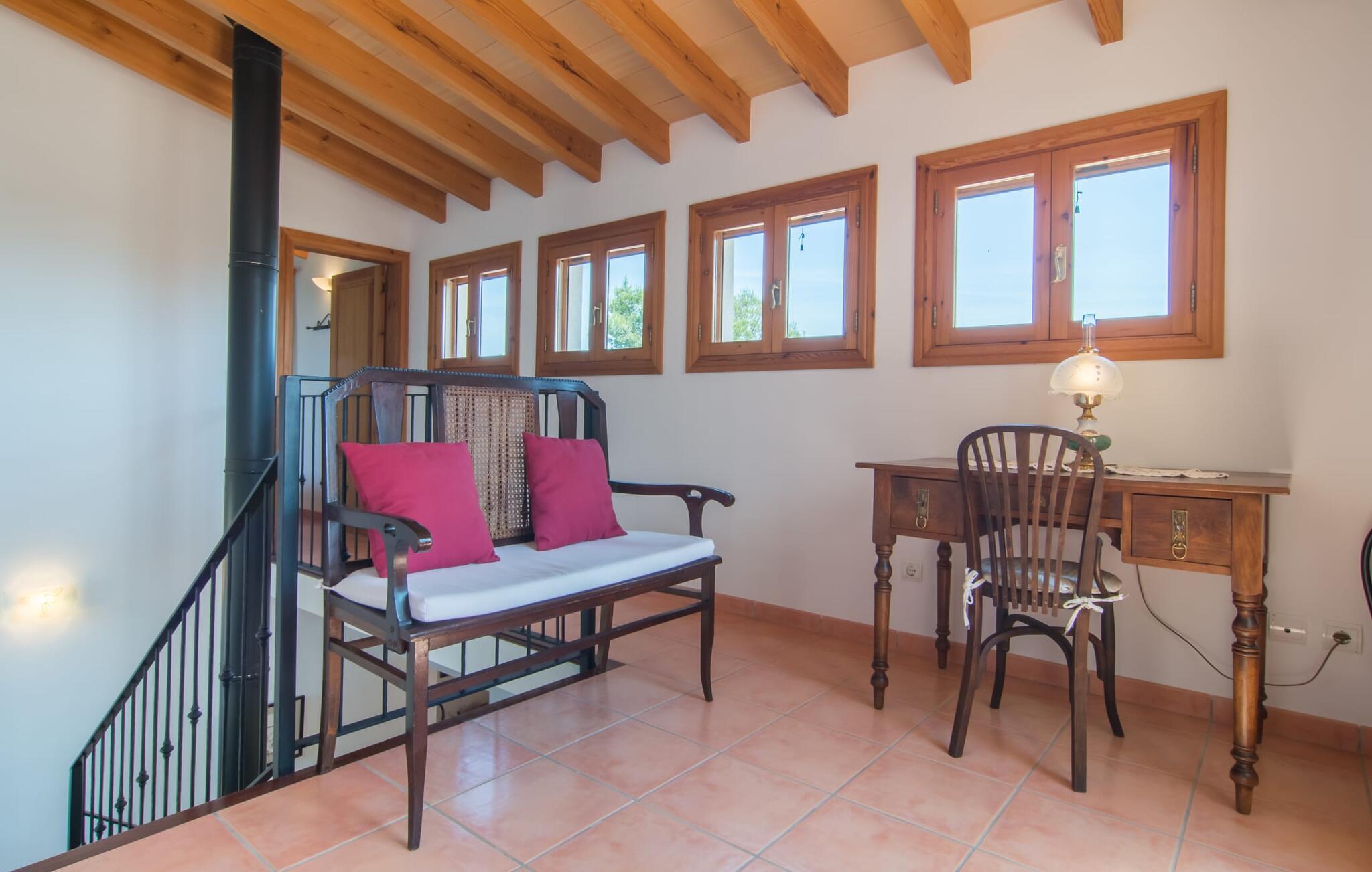 Klassisch, traditionell und mallorquinisch – das sind die Worte, die das Interieur der Villa am besten beschreiben. Aber wenn Sie dabei sofort an etwas Dunkles, Altes und Uriges denken, haben Sie die falsche Idee. Obwohl Holz das dominierende Element in der Villa ist – in Form von Decken, Fenstern, Türen und der Inneneinrichtung – präsentiert sich das Haus in einem hervorragenden Zustand, sauber, hell, modern und zeitgemäß. Weitere Stilelemente auf beiden Etagen sind ein gefliester Terrakottaboden und durchgehend helle Wände. Teilweise unverputzte Bruchsteinmauern, ältere Möbelstücke und ein gusseiserner Ofen, dessen Rohr vom Wohnzimmer über die Galerie im zweiten Obergeschoss bis zum Dach führt, setzen attraktive Akzente. Im Erdgeschoss befinden sich neben dem Eingangsbereich das offene Ess- und Wohnzimmer, die gut ausgestattete Küche mit Zugang zur Poolterrasse, zwei Doppelschlafzimmer und zwei Badezimmer (eines davon en-suite). Eine angrenzende Galerie neben dem Wohnzimmer, zwei weitere Doppelschlafzimmer und ein Badezimmer runden das Interieur im Obergeschoss ab. Die Dachterrasse mit herrlichem Panoramablick auf die umliegende Landschaft ist das Sahnehäubchen. Idyllisch, ländlich und abgeschieden liegt die traditionelle Bruchsteinvilla „Cas Padrins de Campos“ nur 4 km südöstlich von Campos im Süden der Insel. Mehrere Supermärkte sind im nur 10 Autominuten entfernten nächstgelegenen Ort zu erreichen. Donnerstags und samstags findet ein Markt statt. Die paradiesischen Strände der Süd- und Südostküste, wie der Naturstrand Es Trenc oder Cala Mondragó, sind nur eine kurze Autofahrt entfernt. Auch die Inselhauptstadt Palma und der Flughafen sind über die nahegelegene Autobahn Ma-19 schnell zu erreichen.