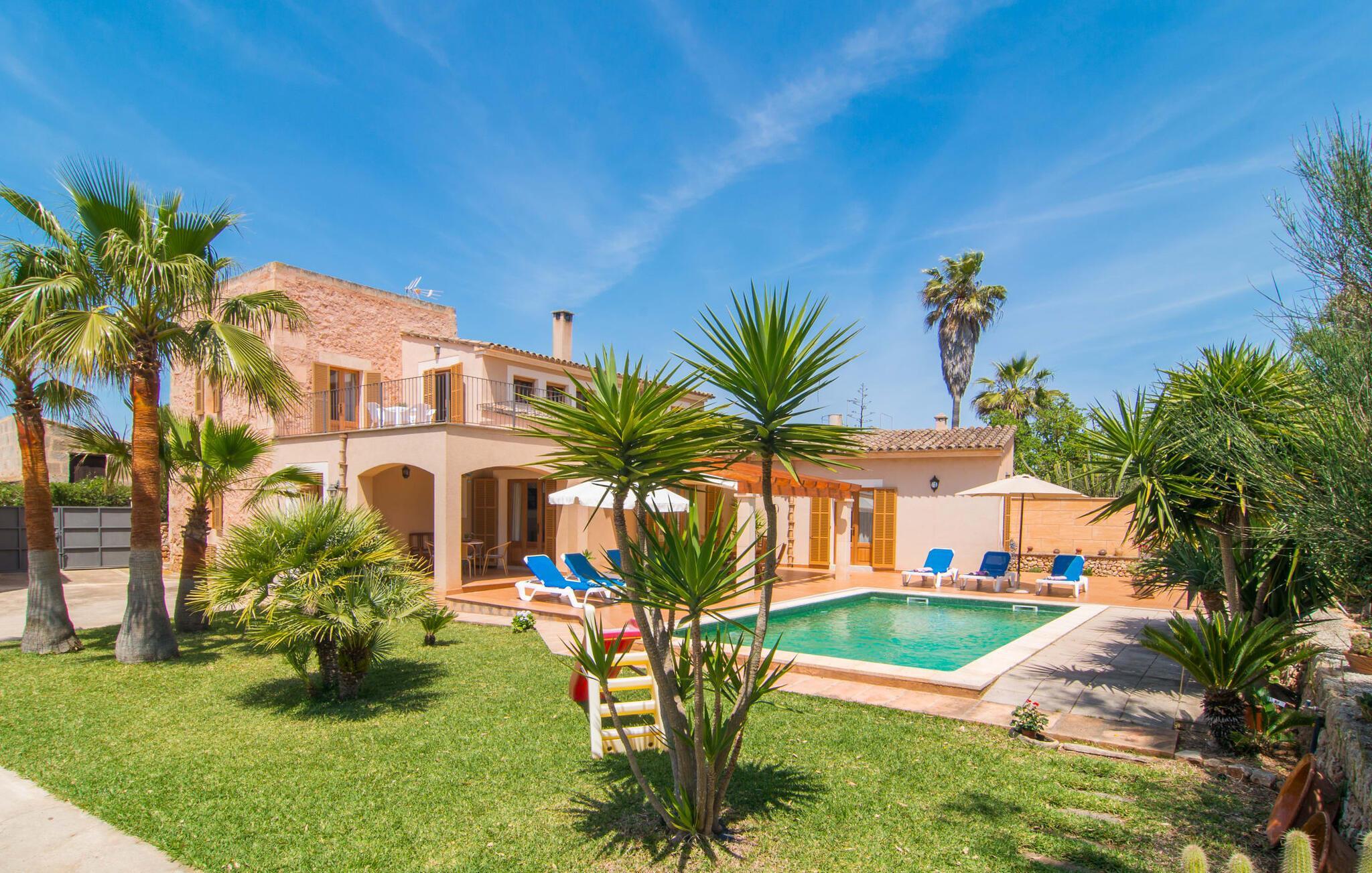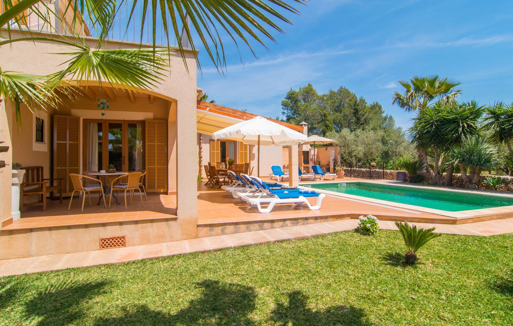 Umgeben von einer idyllischen Landschaft und einem herrlichen mediterranen Garten empfängt die Villa „Cas Padrins de Campos“ bei Campos ihre Gäste. Der Außenbereich zeichnet sich durch eine von Palmen umgebene Garten- und Poolterrasse aus, die eine Vielzahl attraktiver Plätze zum Entspannen einlädt. Der Rasen ist ein toller Ort zum Spielen für Kinder. Sogar eine kleine Rutsche wartet auf die Kleinen. Begleitende Eltern können direkt daneben oder im großen Pool entspannen, der sich auch hervorragend für Wasserspiele und Planschen eignet. Wer nicht ins kühle Nass springen möchte, kann das Becken auch bequem über eine halbrunde Treppe betreten. Anschließend können Sie sich auf einer der bereitgestellten Liegen ausruhen und sonnenbaden. Zwei große Sonnenschirme spenden Schatten, sodass Sie nach Herzenslust chillen und einfach die Seele baumeln lassen können. Zwei überdachte Terrassen bieten luftige Plätze mit Blick auf den wunderschön gepflegten und hervorragend gepflegten Garten. Bei schönem Wetter können Sie alle Mahlzeiten gemeinsam an einer beeindruckenden Essgruppe aus Holz genießen. Für eine herzhafte Mahlzeit steht Ihnen ein gemauerter Grill zur Verfügung, auf dem Sie ganz nach Ihrem Geschmack frische lokale Köstlichkeiten aus der Region zubereiten können.