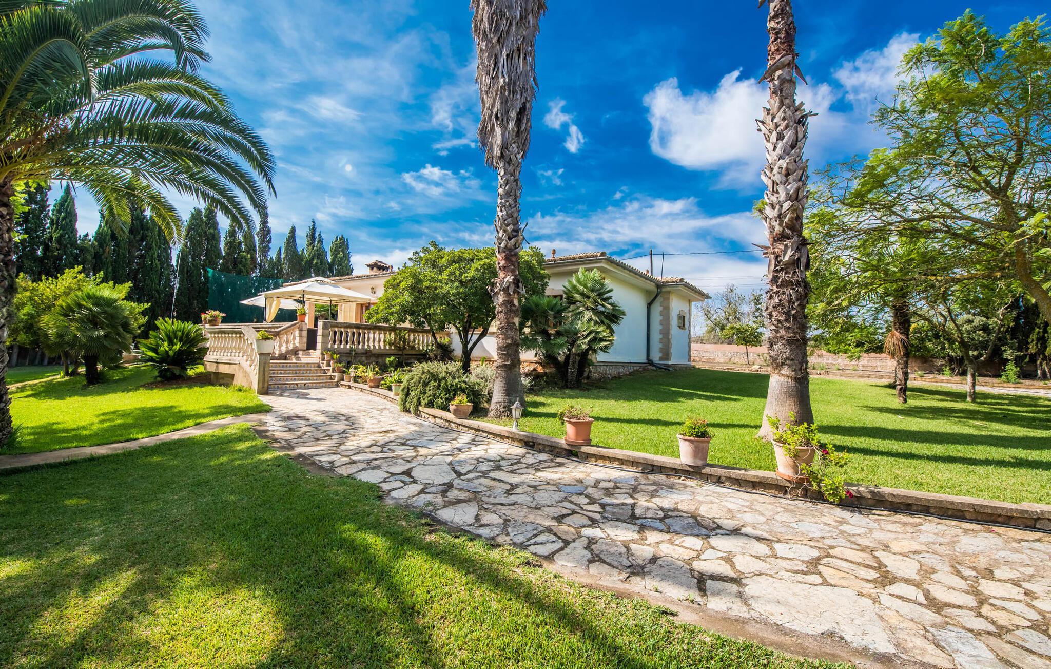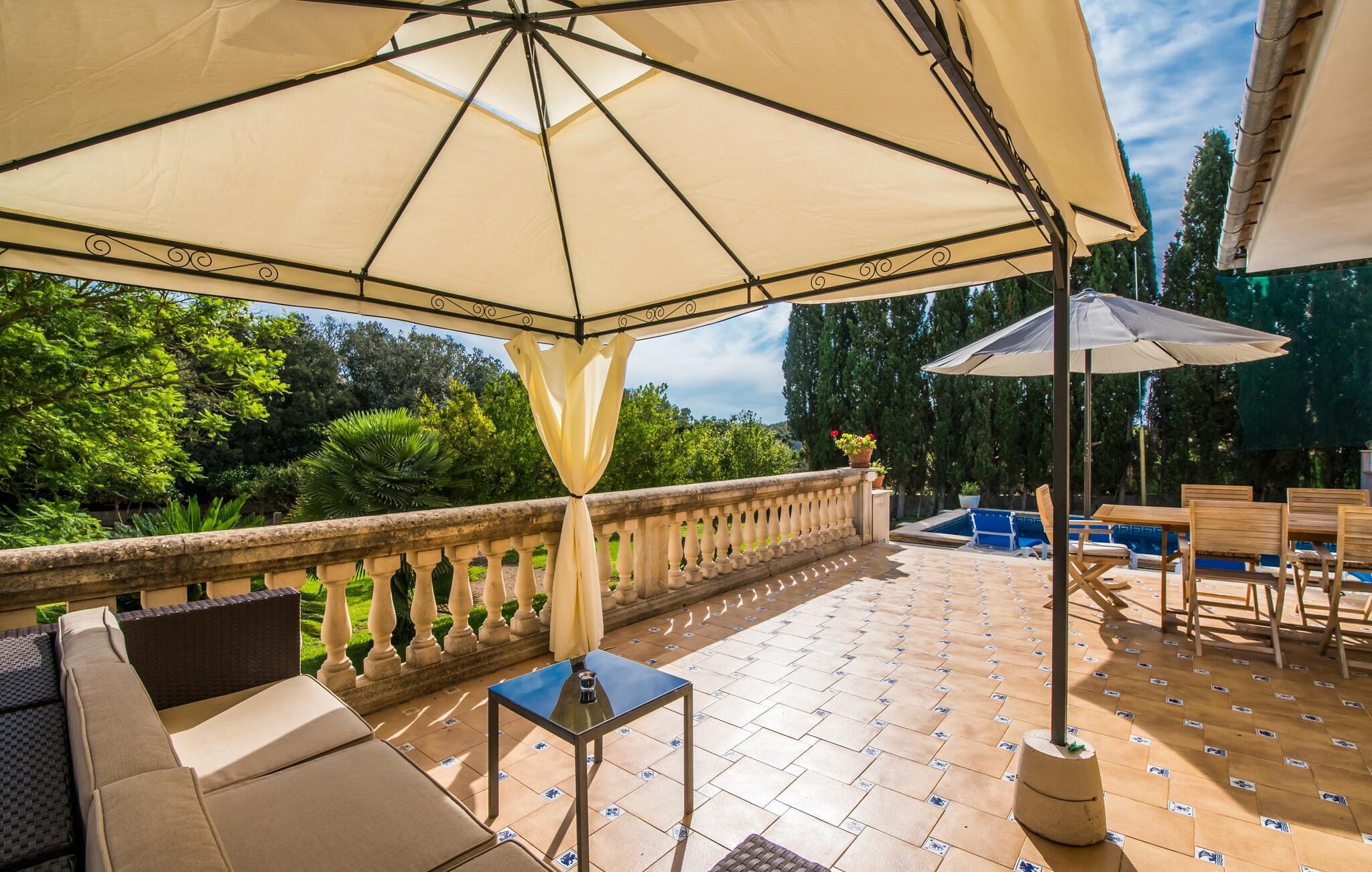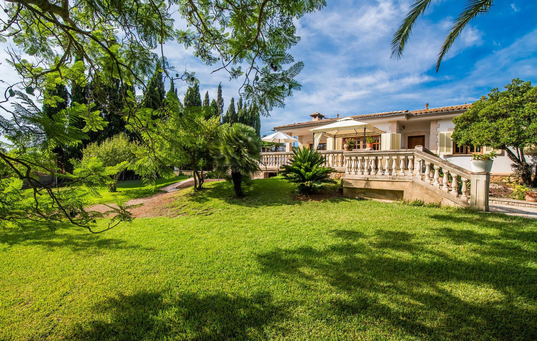 Hohe Palmen und mediterrane Bäume prägen den Außenbereich dieses Bauernhauses bei Artà im Osten der Insel. Die Liegewiese und der Swimmingpool mit blauem Mosaik und Sonnenliegen bieten viele Möglichkeiten, Zeit im Freien zu verbringen. Auf der Terrasse erwartet Sie ein Zelt mit Sofa und Sessel und unter der Veranda der Esstisch. Auf der anderen Seite gibt es sogar einen zweiten Esstisch, so dass Sie für jede Tageszeit den idealen Platz wählen können.