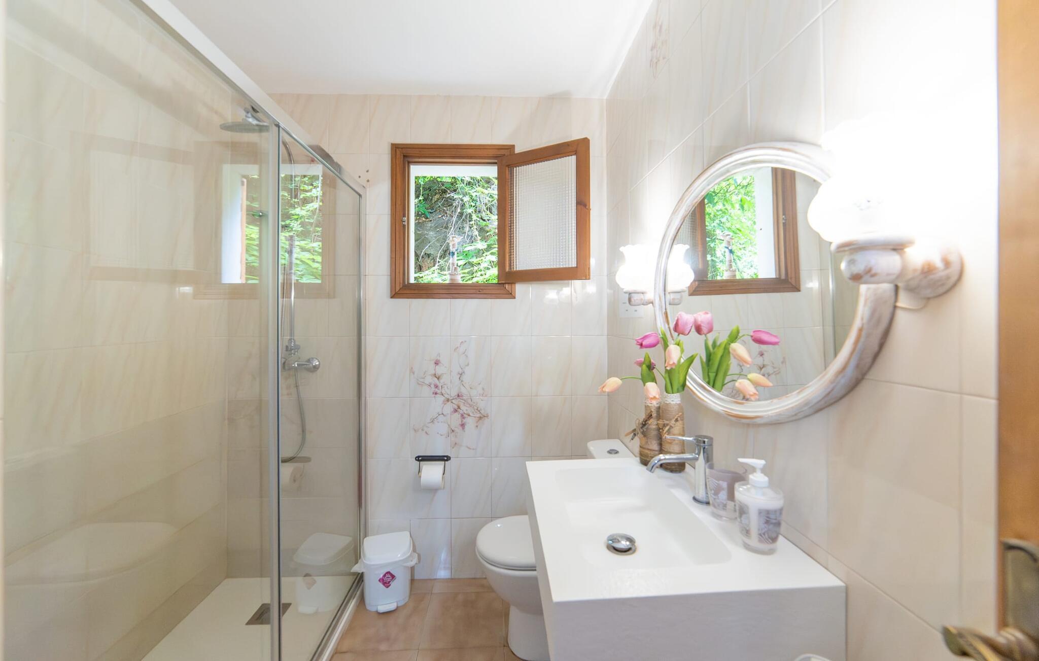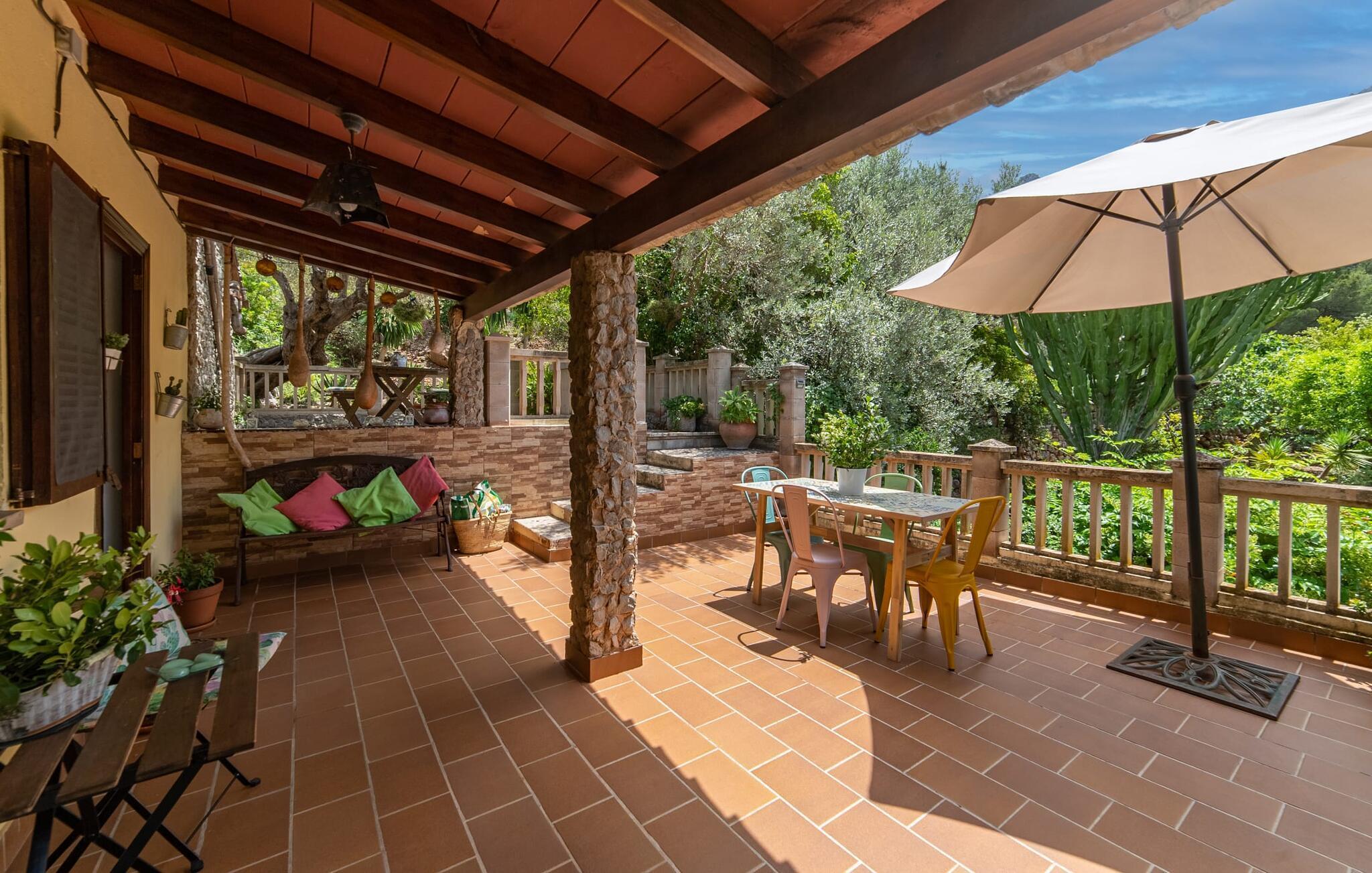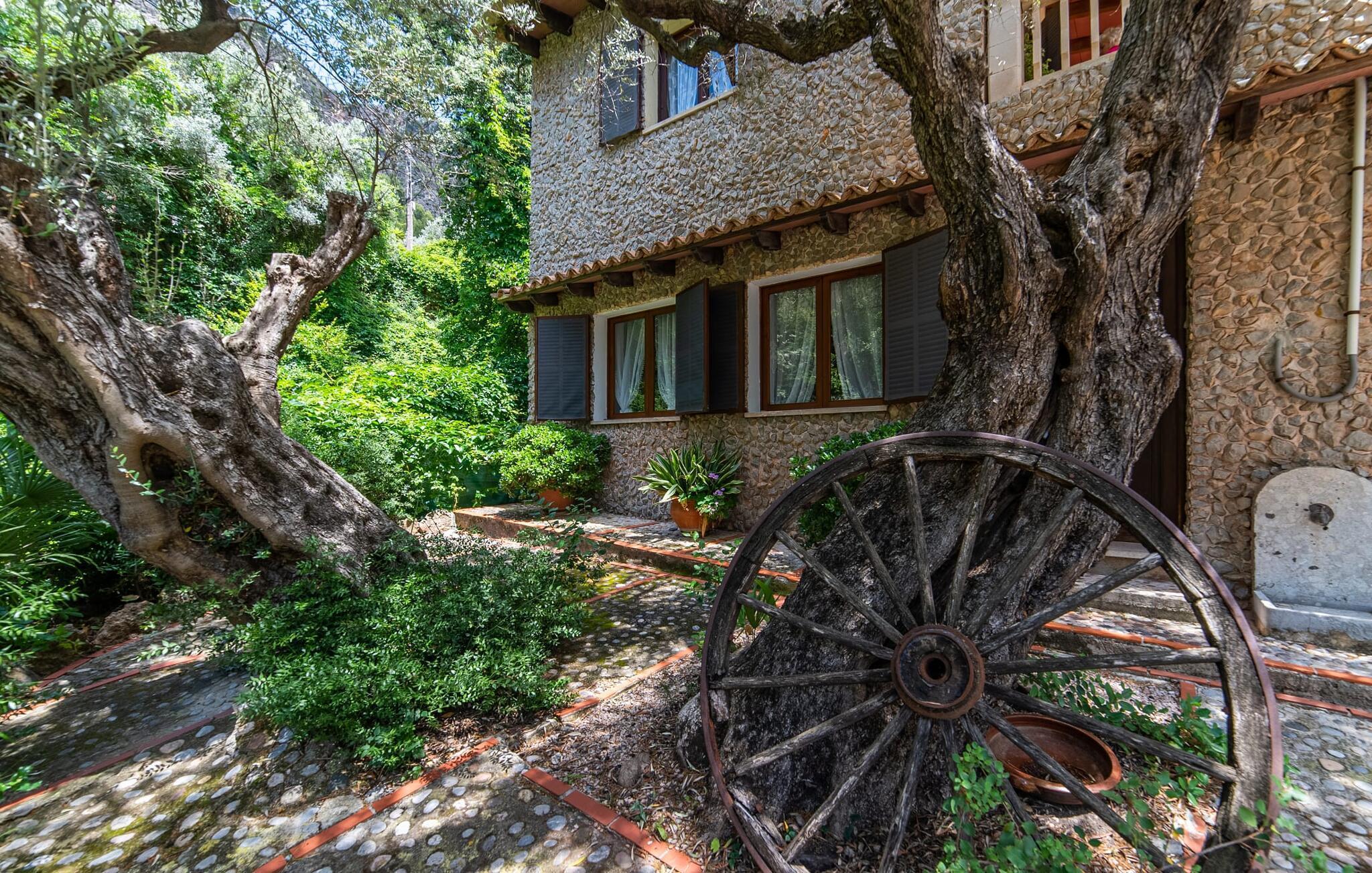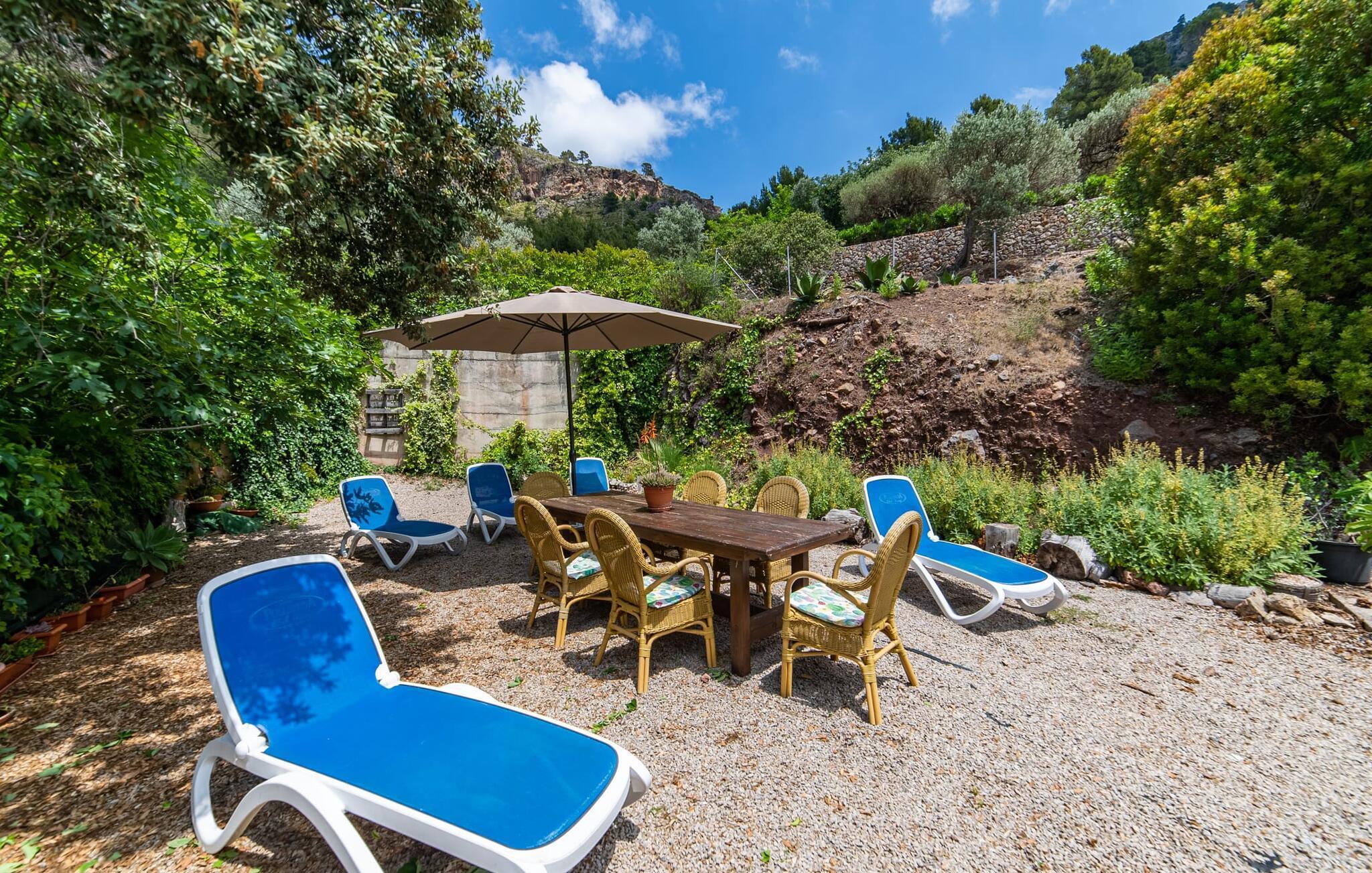 Das Berghaus befindet sich auf einem Hanggrundstück mit üppiger Natur im Zentrum des Tramuntana-Gebirges im Norden Mallorcas. Die Bucht von Cala Tuent und ihr Restaurant sind 13 Minuten zu Fuß oder 3 Minuten mit dem Auto entfernt. Es gibt interessante Rad- und Wanderrouten, zum Beispiel zu den Stauseen Gorg Blau und Cúber.